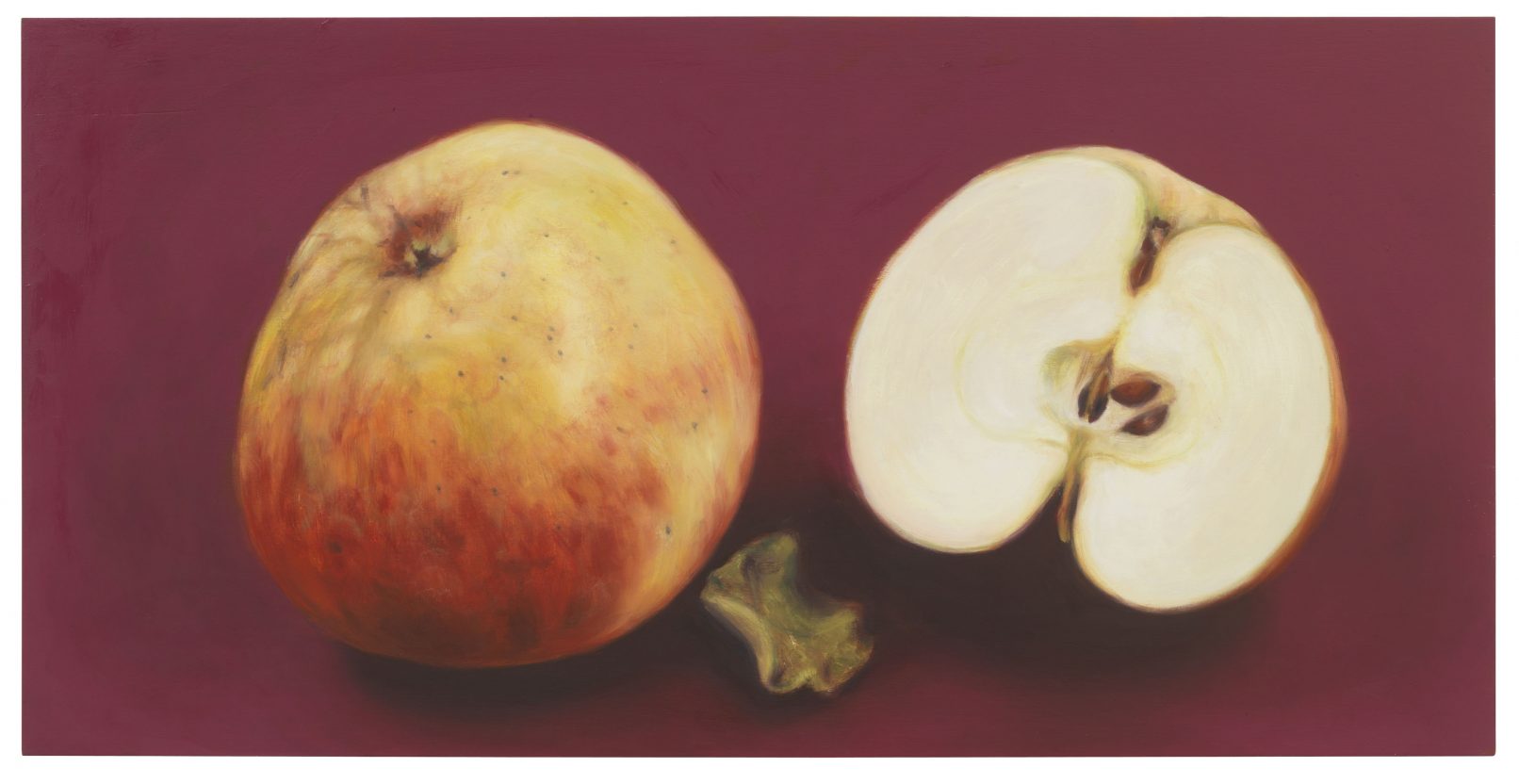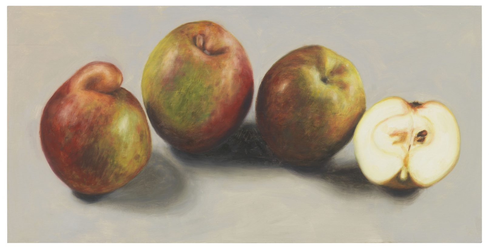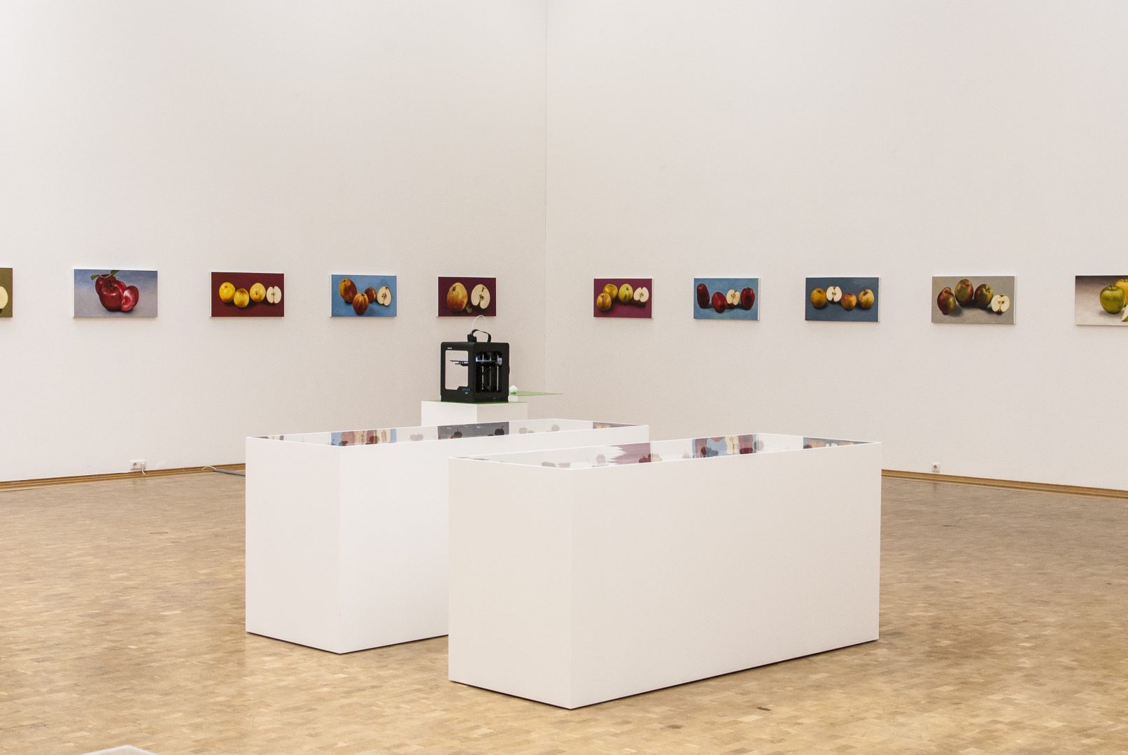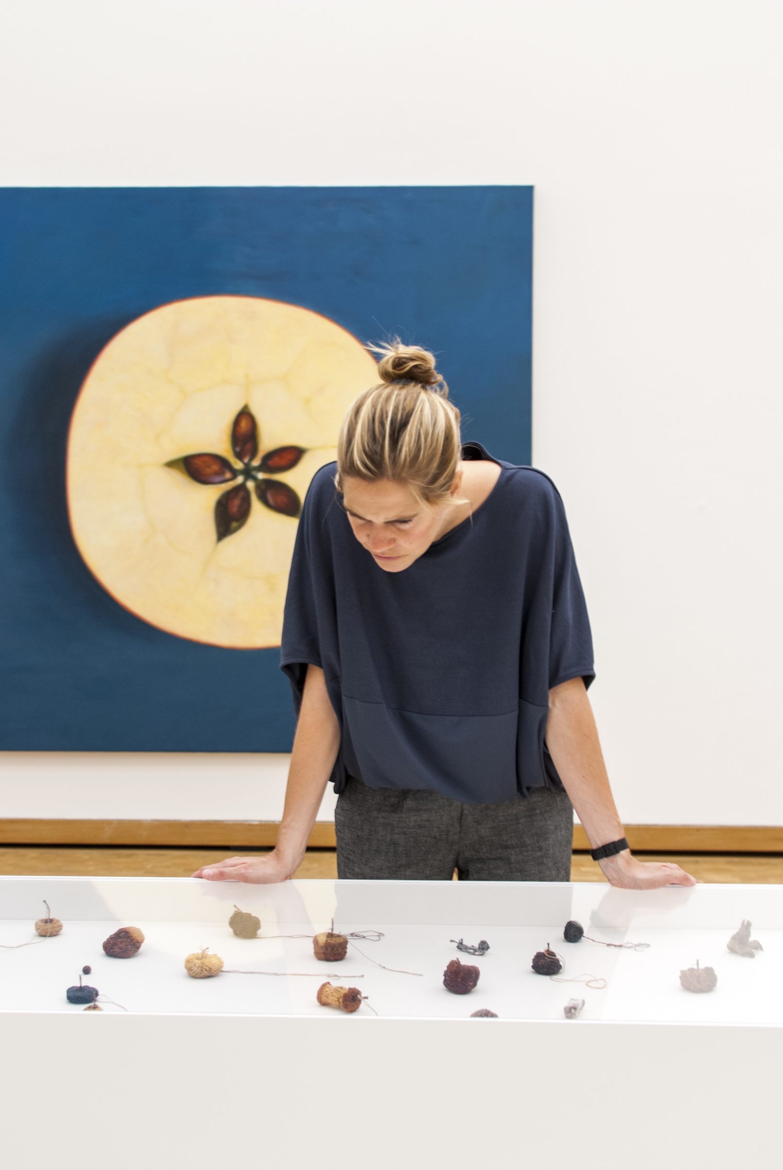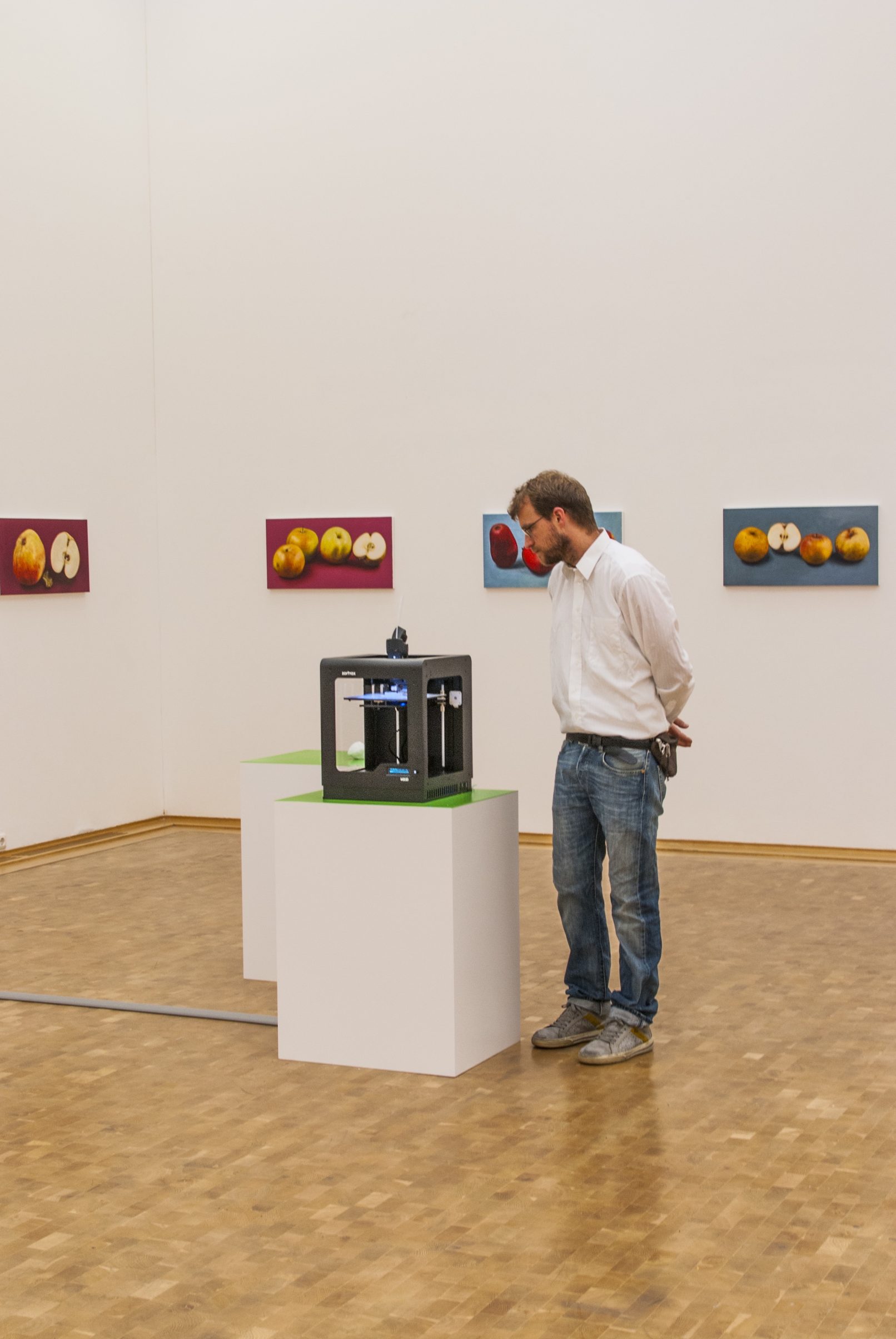 APPLE. AN INTRODUCTION. (OVER AND OVER AND ONCE AGAIN) centers around the apple as an art object and as a case study of biodiversity under threat. Sparked in the course of a five-year, ongoing correspondence between artist Antje Majewski and the elusive, legendary Polish conceptual artist Paweł Freisler, the project shows the incredible diversity of ornaments in Freisler’s carved natural apples; the diversity of color and form in Majewski’s painted apple varieties; while Majewski’s film “The Freedom of Apples” traces the fruit’s genetic reduction to a handful of commercially profitable varieties, an undertaking that requires making sense of the complex relationships behind global food production, developments in agricultural technology, politics, and cultural forces guiding the capitalist world economy.