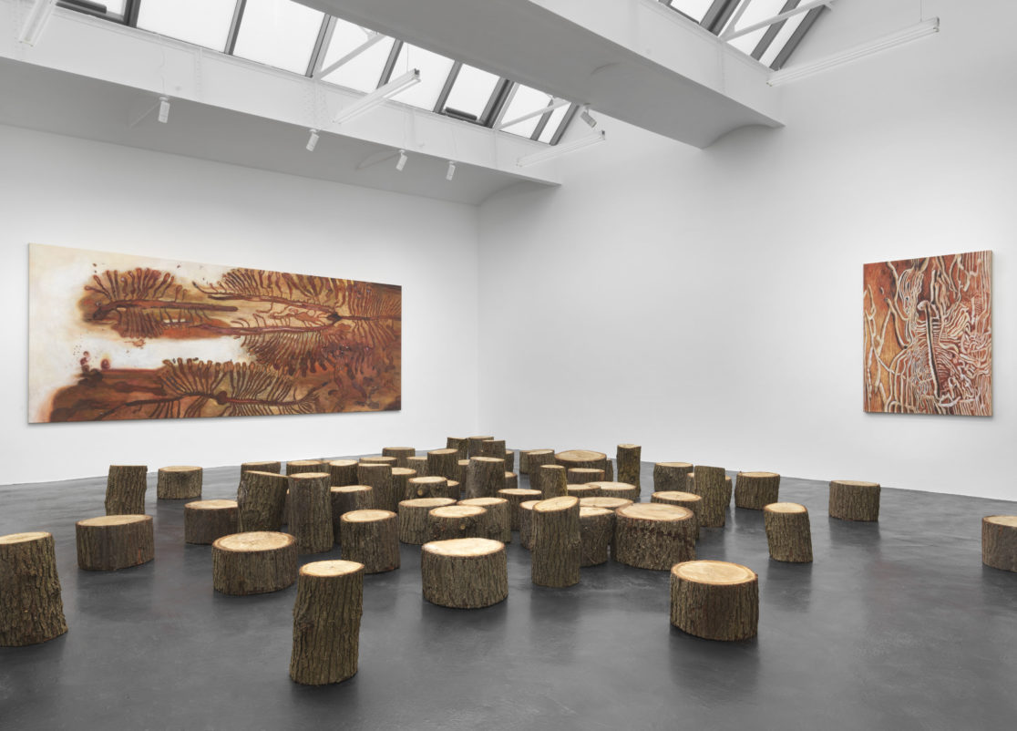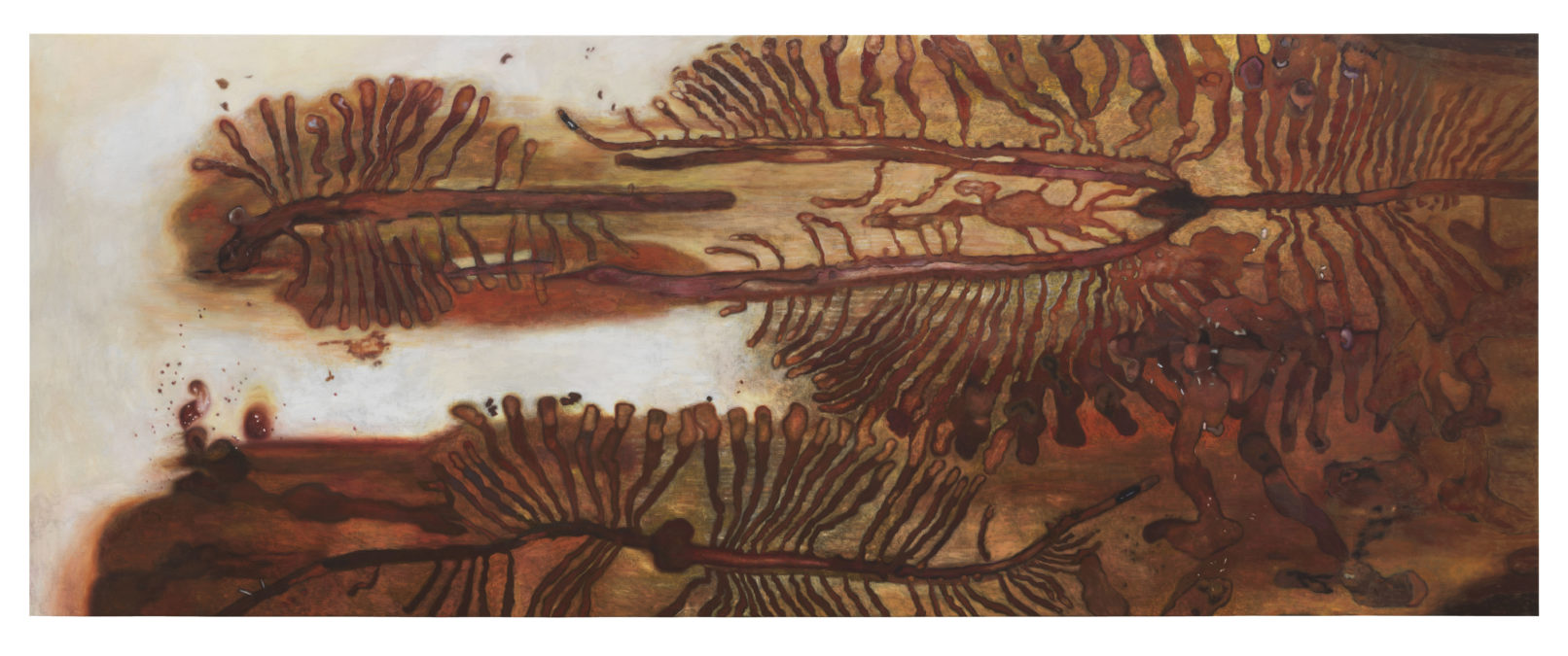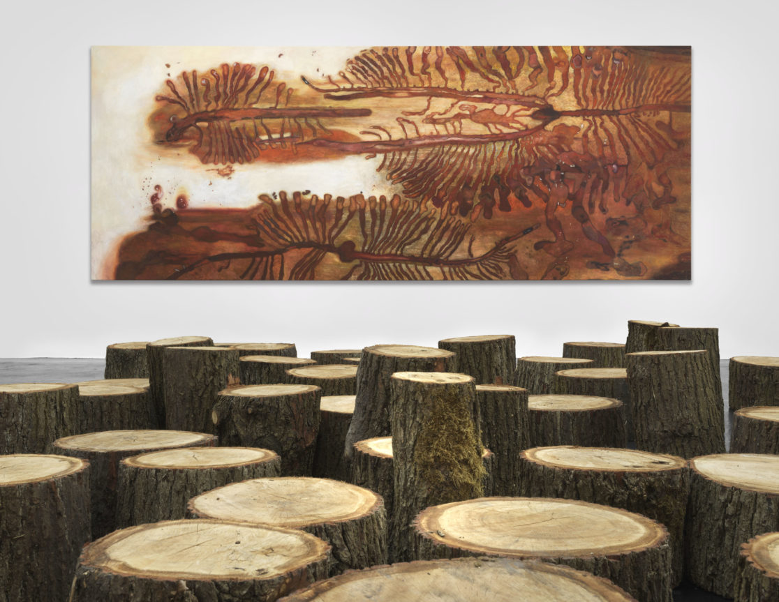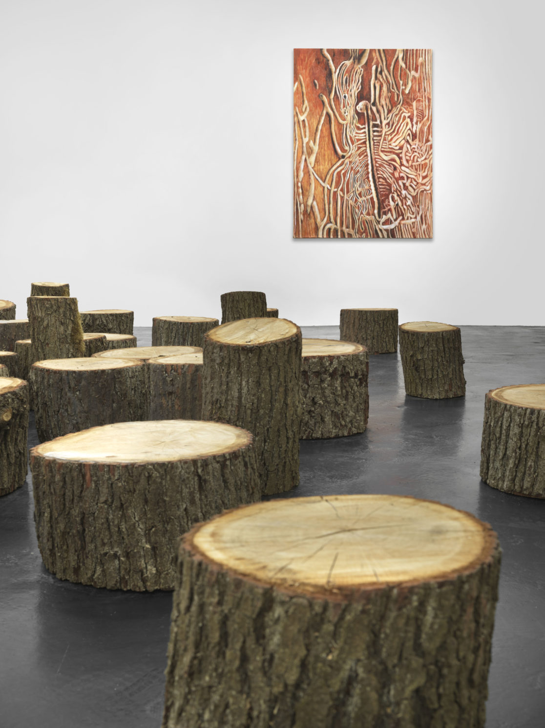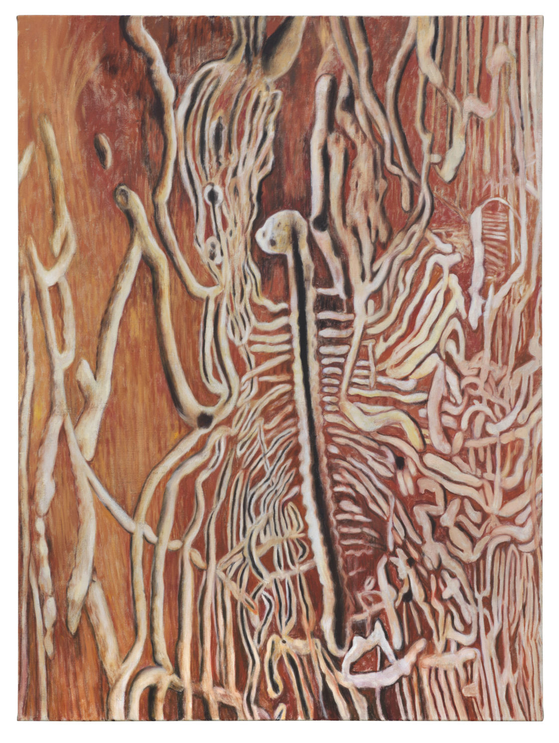 The large-format painting Passagen (2019) showcases a magnified view of the delicately crafted, sinuous passageways that bark beetles burrow in the trees that they infest. Here, Majewski renders the illustrative passageways created by these aptly named insects—Ips typographus (Buchdrucker, or “book printer”) and Pityogenes chalcographus (Kupferstecher, or “copperplate engraver”)—in monumental landscape format, using painterly qualities to lend them a presence that deftly straddles the figurative and the abstract. Especially during the extended periods of drought experienced in recent years, monoculturally raised spruce trees can become weak, transforming them into veritable breeding grounds for these beetles. This, in turn, has drastic ecological and economic consequences. The bark beetle’s proliferation has become an indicator of an imbalanced ecosystem and raises questions about biodiversity, sustainability, climate change and resilience.