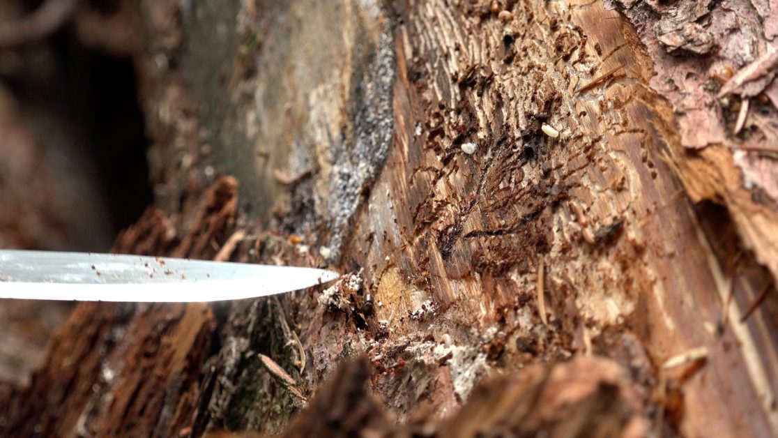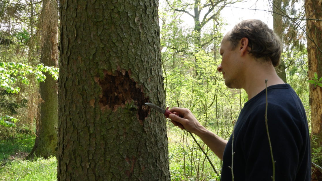 The documentary film Über den Borkenkäfer (About the Bark Beetle) (2019) features the owner of a forest, a forester and a forestry scientist, as they elaborate on the widespread destruction that their forests are currently being subjected to. Next spring, Antje Majewski and the private forest owner Johannes Simons, whose destroyed forest is shown in Majewski‘s films, are planning to transform deforested areas into wildlife feeding grounds by planting wild fruit trees.