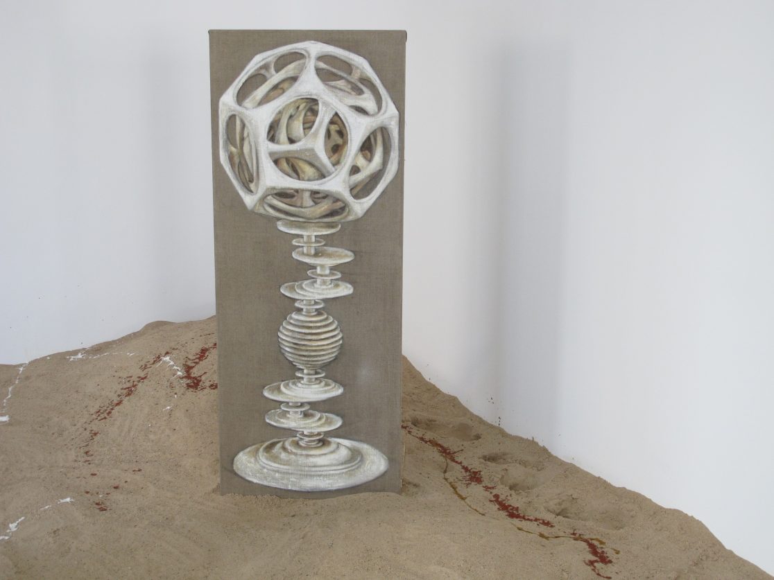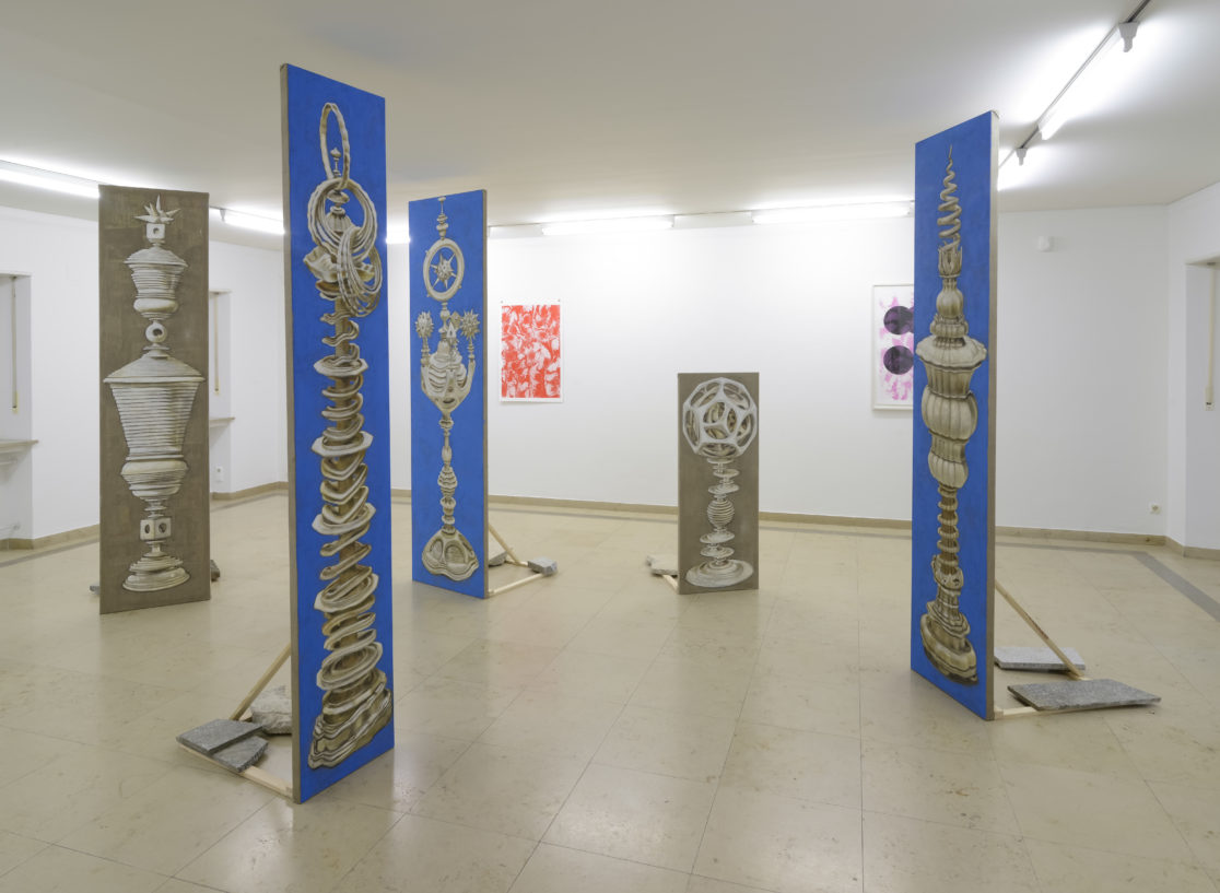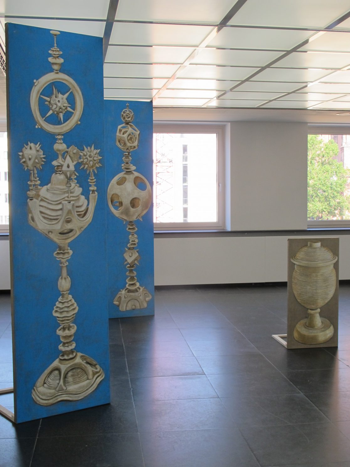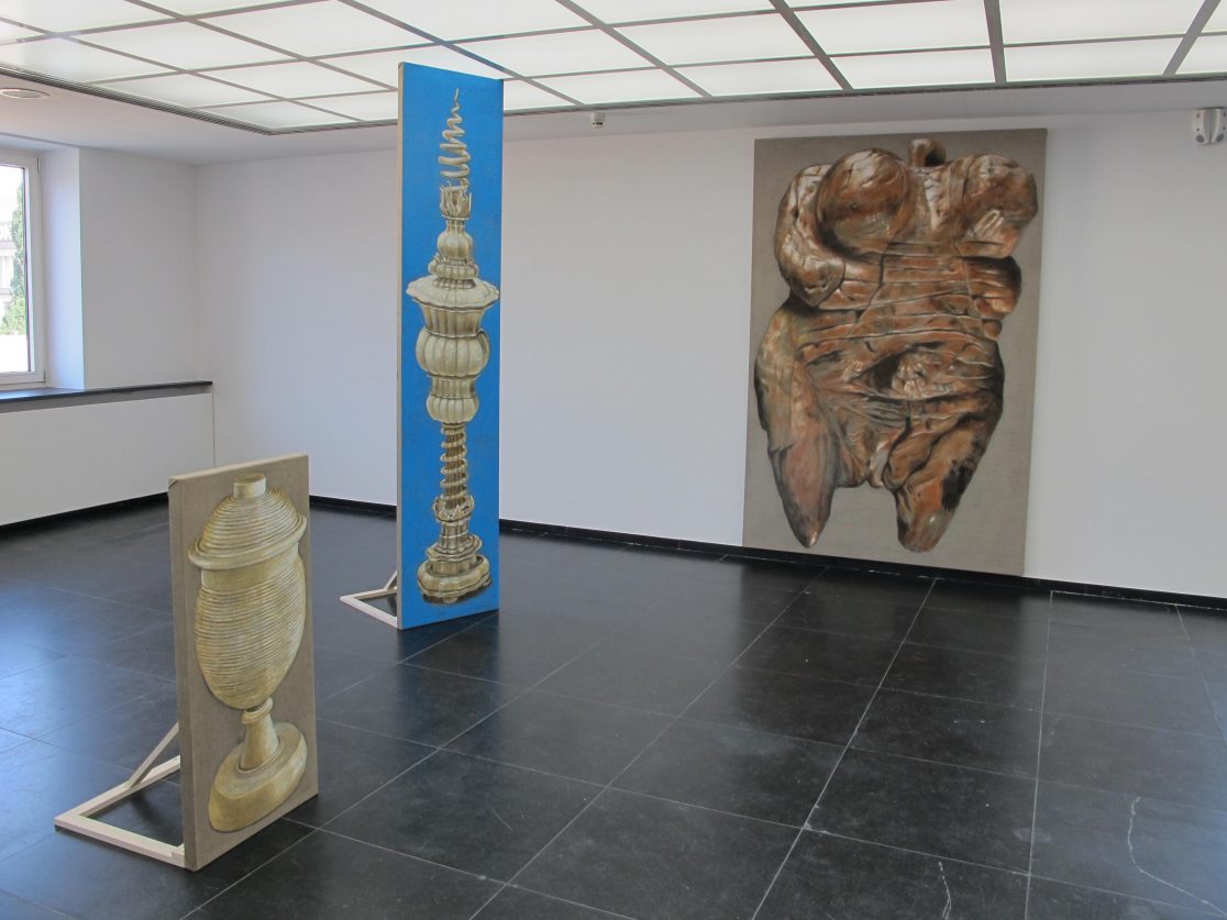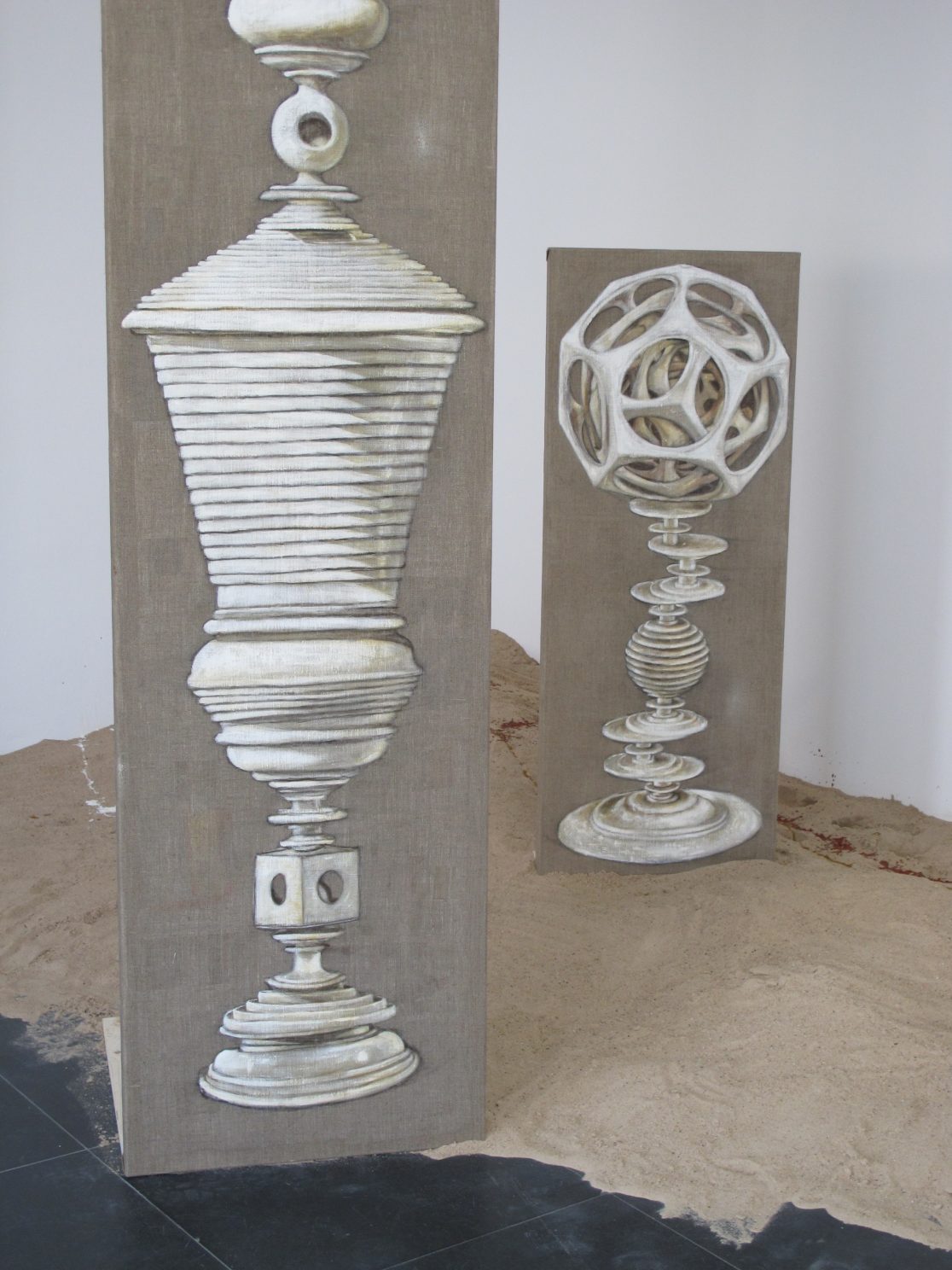 The series of paintings of Elfenbeintürme (Ivory Towers) are based on objects from the collection of Grünes Gewölbe (Green Vault), Dresden. They show precious ivory items that had no other function then to show the immense craftmanship of the artisans that made them, including the reigning duke himself. They can be regarded as very early examples of formalistic (“non-figurative, abstract”) art-pour-l’art pieces made to sadisfy the exquisite taste of their aristocratic owners – at the very beginning of what was to become the modern art world, with institutions like museums and art lovers that are collectors. This might be the reason why we refer today to artists, writers or theoreticians that have lost touch with normal life as “living in an ivory tower”.