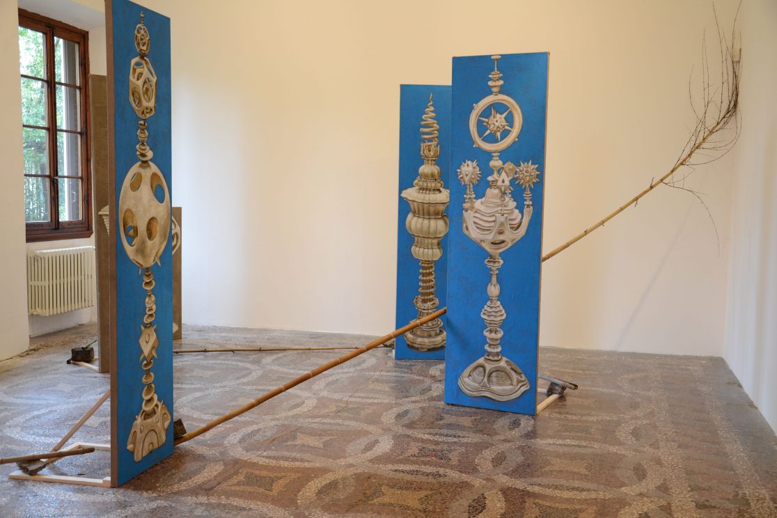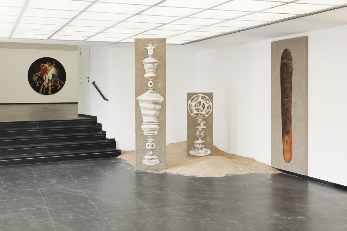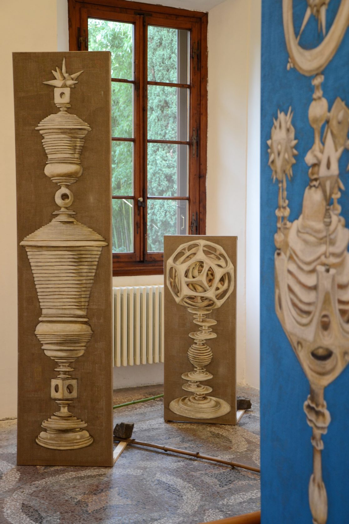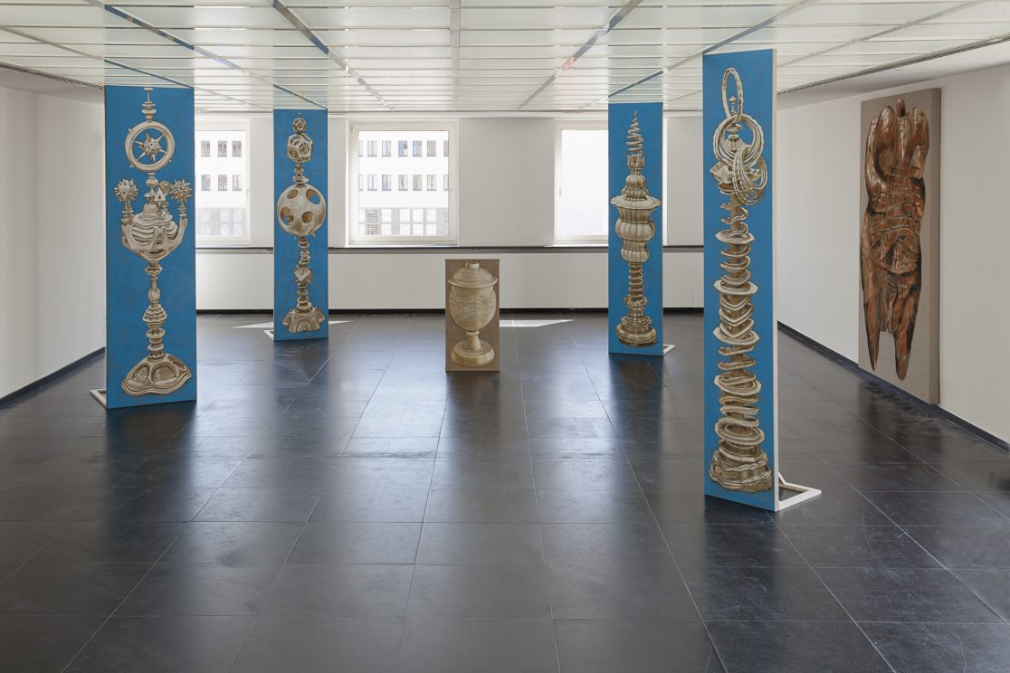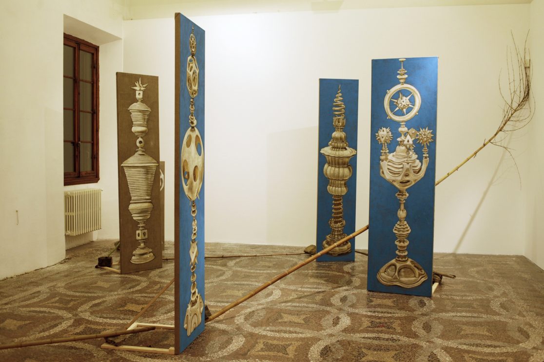 The series of paintings of Elfenbeintürme (Ivory Towers) are based on objects from the collection of Grünes Gewölbe (Green Vault), Dresden. They show precious ivory items that had no other function then to show the immense craftmanship of the artisans that made them, including the reigning duke himself. They can be regarded as very early examples of formalistic (“non-figurative, abstract”) art-pour-l’art pieces made to sadisfy the exquisite taste of their aristocratic owners – at the very beginning of what was to become the modern art world, with institutions like museums and art lovers that are collectors. This might be the reason why we refer today to artists, writers or theoreticians that have lost touch with normal life as “living in an ivory tower”.