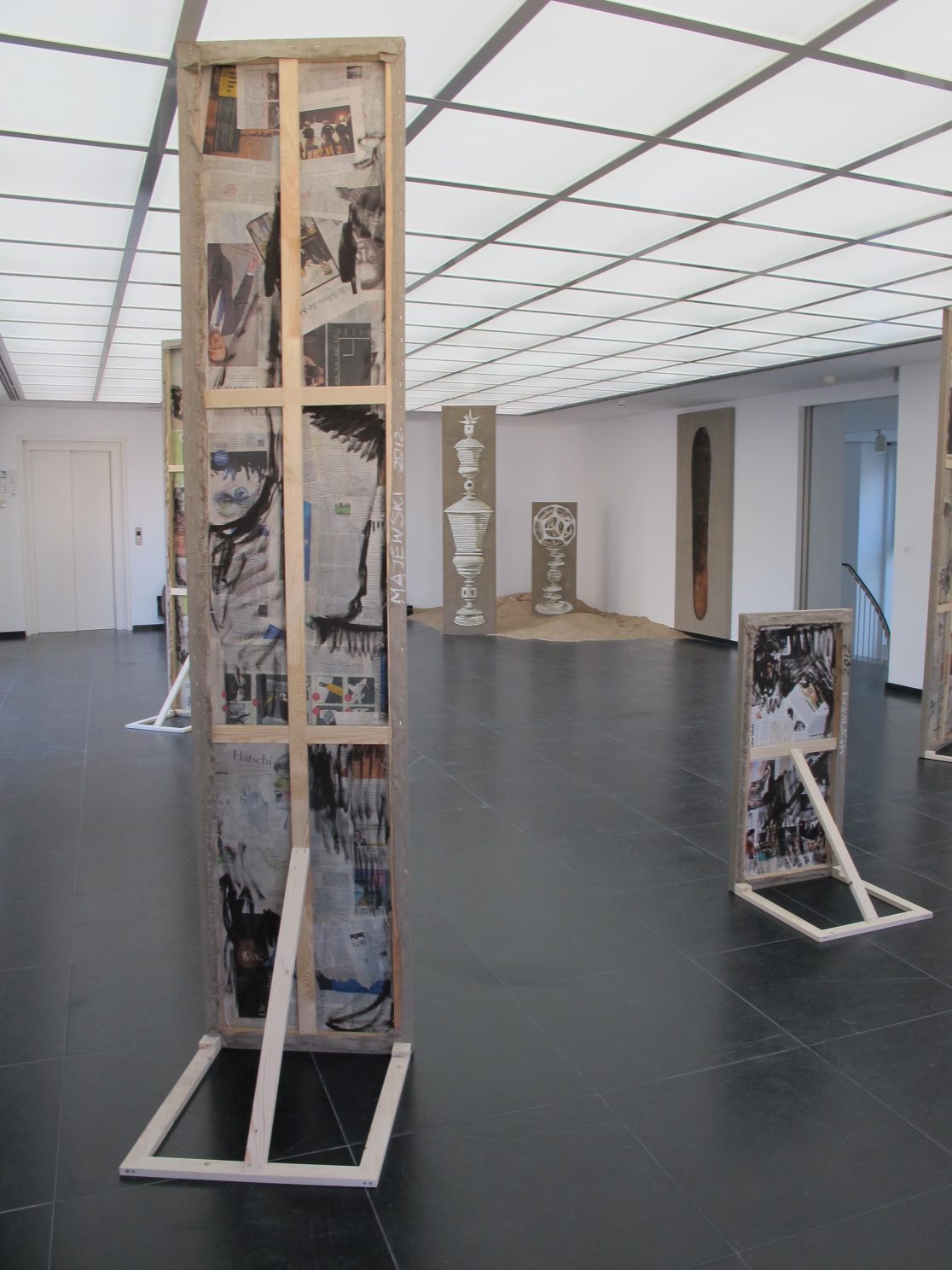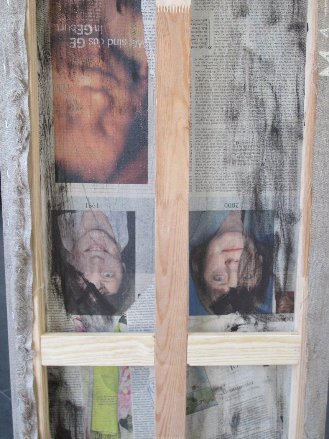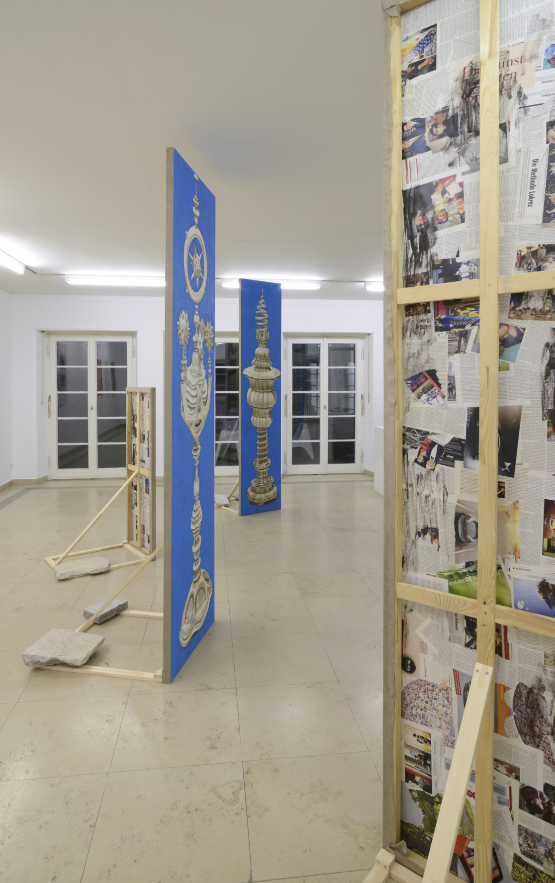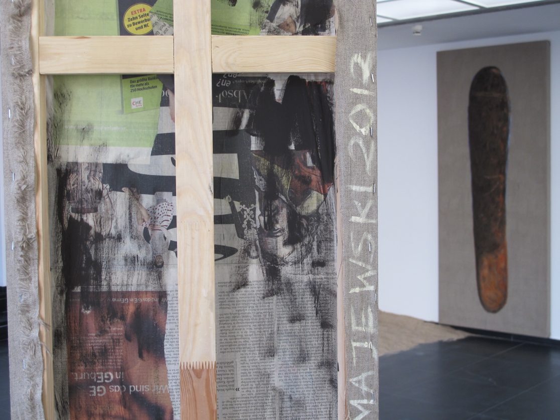 On their back side, the canvas of the paintings is stiffenend by glued-on newspaper clippings. The a-temporal and the contemporary meet. Ivory towers are part of history – of the history of art making as well as the transformation of art items into precious, useless, beautiful “ivory towers”.