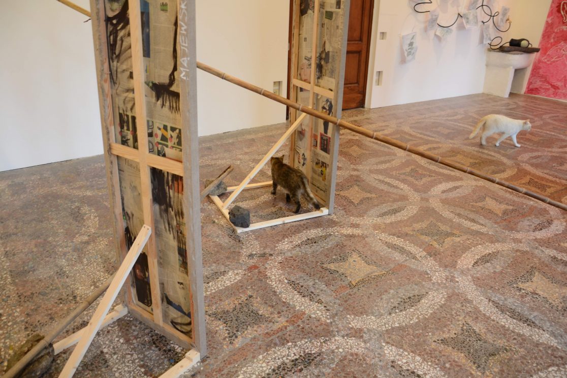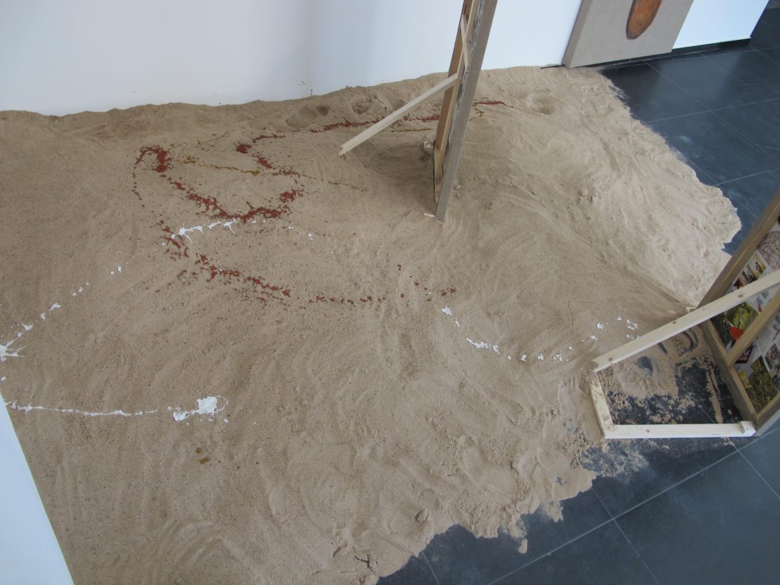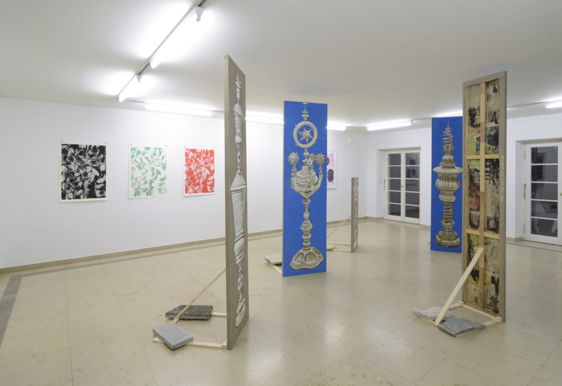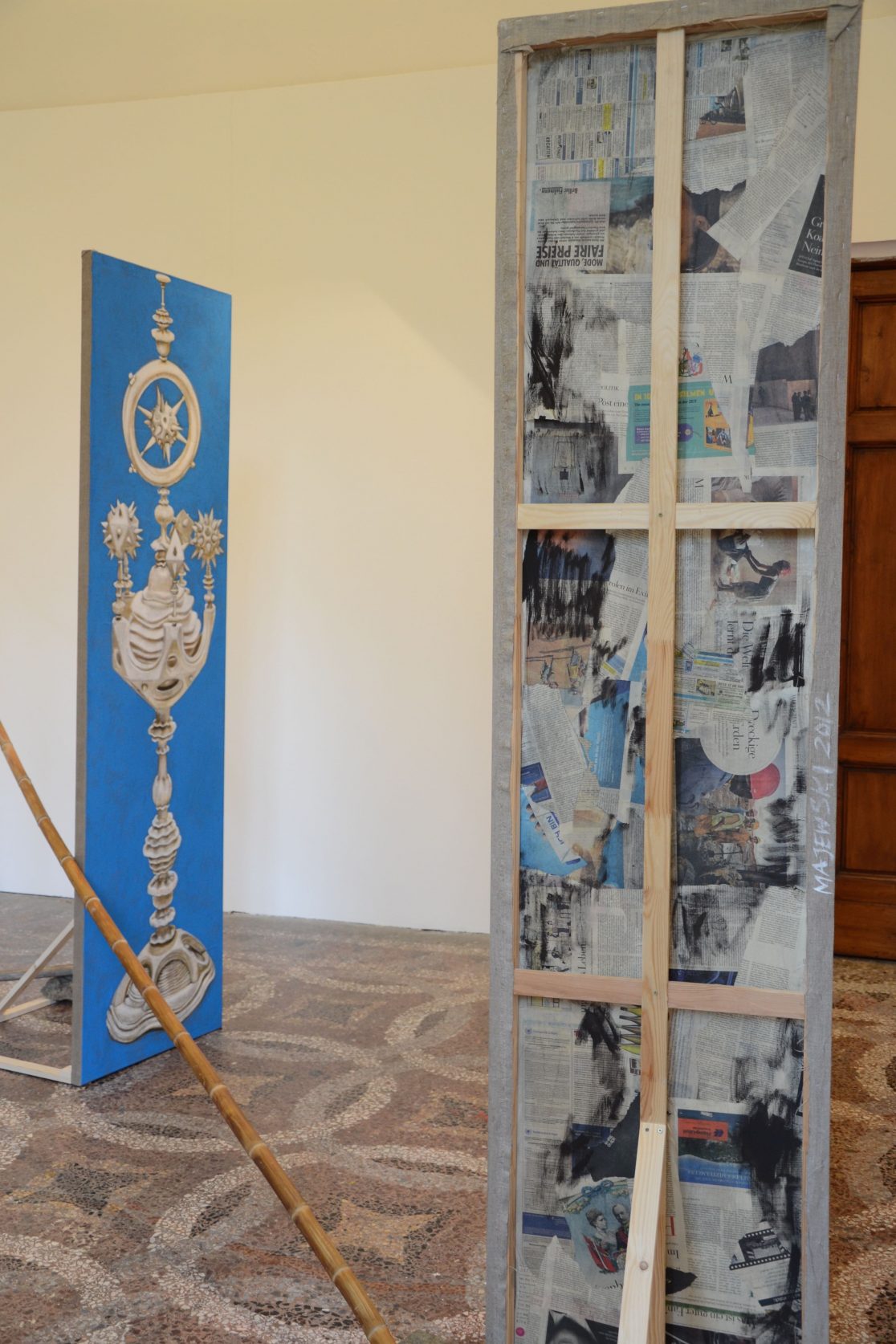 On their back side, the canvas of the paintings is stiffenend by glued-on newspaper clippings. The a-temporal and the contemporary meet. Ivory towers are part of history – of the history of art making as well as the transformation of art items into precious, useless, beautiful “ivory towers”.