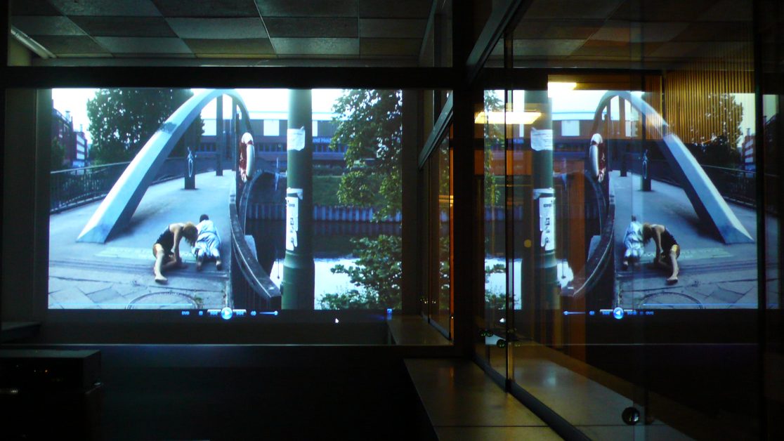 Two strange creatures come out of the canal at Westhafen, near “Wedding”, one of Berlin’s seediest districts. Their shiny costumes twinkle in the early morning light and the noise of the streets becomes louder as they continue to crawl on the ground: up to the street, over a bridge, across crossroads and past cars, until finally vanishing again behind a concrete ramp.
