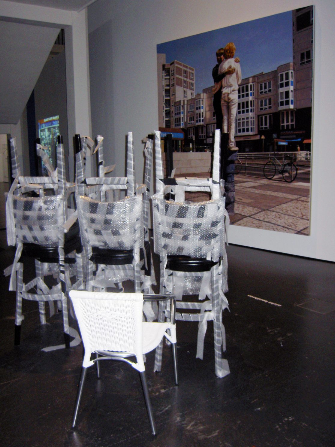 In Säule Wedding (Column Wedding) we install ourselves into this space, becoming a sculptured column for the inhabitants of the city. While our movements in the film are unusually horizontal, in the painting we stand vertical and completely still. In both cases, the city becomes less the audience and more like a stage.