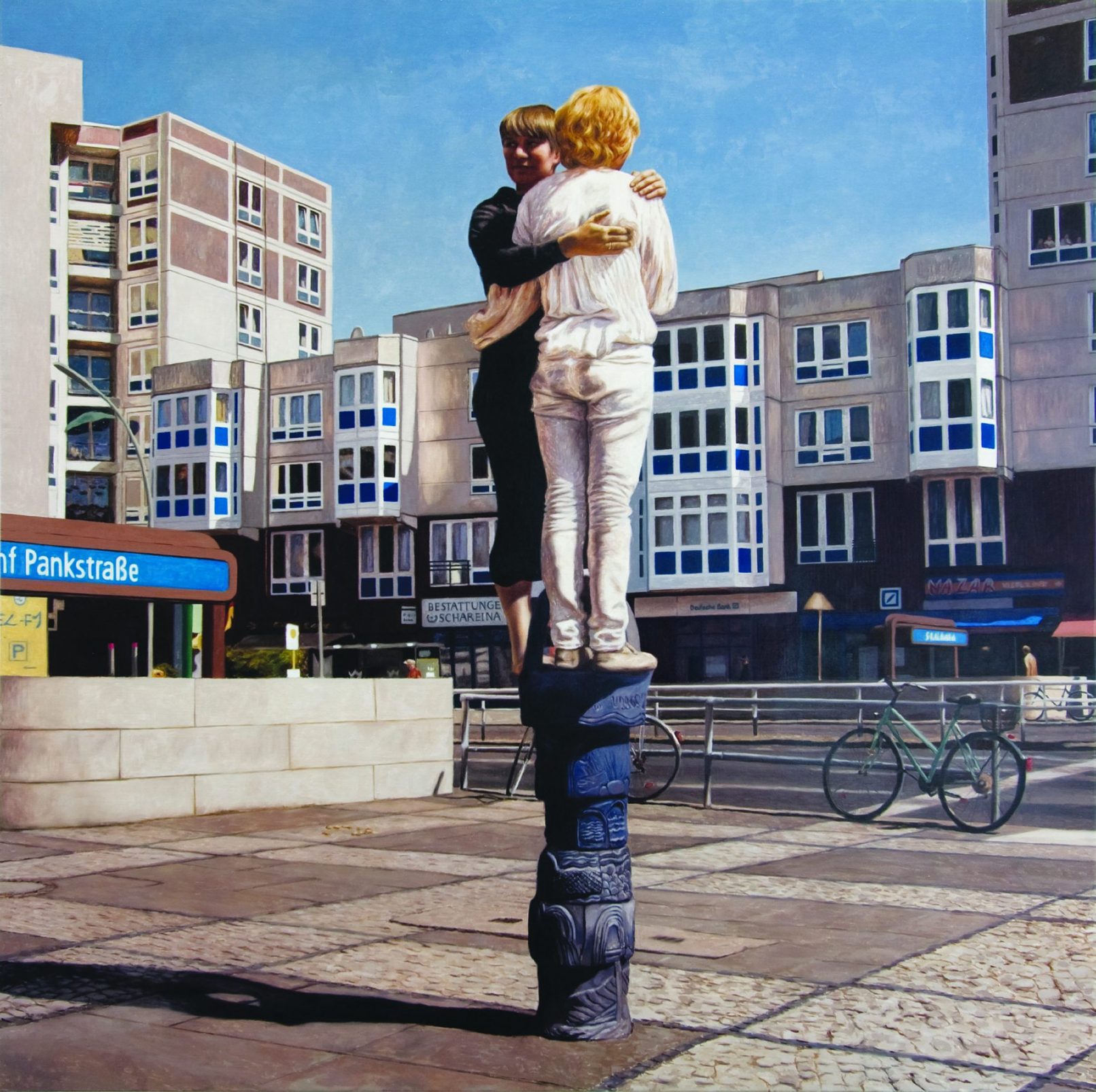 In Säule Wedding (Column Wedding) we install ourselves into this space, becoming a sculptured column for the inhabitants of the city. While our movements in the film are unusually horizontal, in the painting we stand vertical and completely still. In both cases, the city becomes less the audience and more like a stage.
