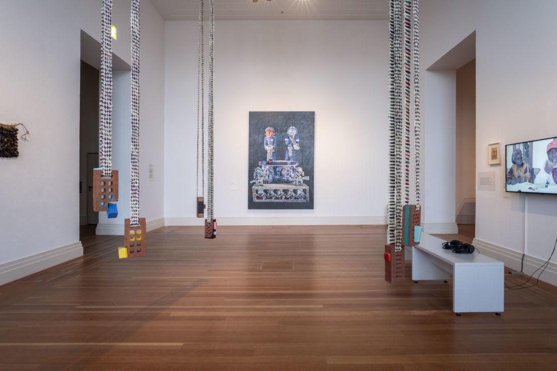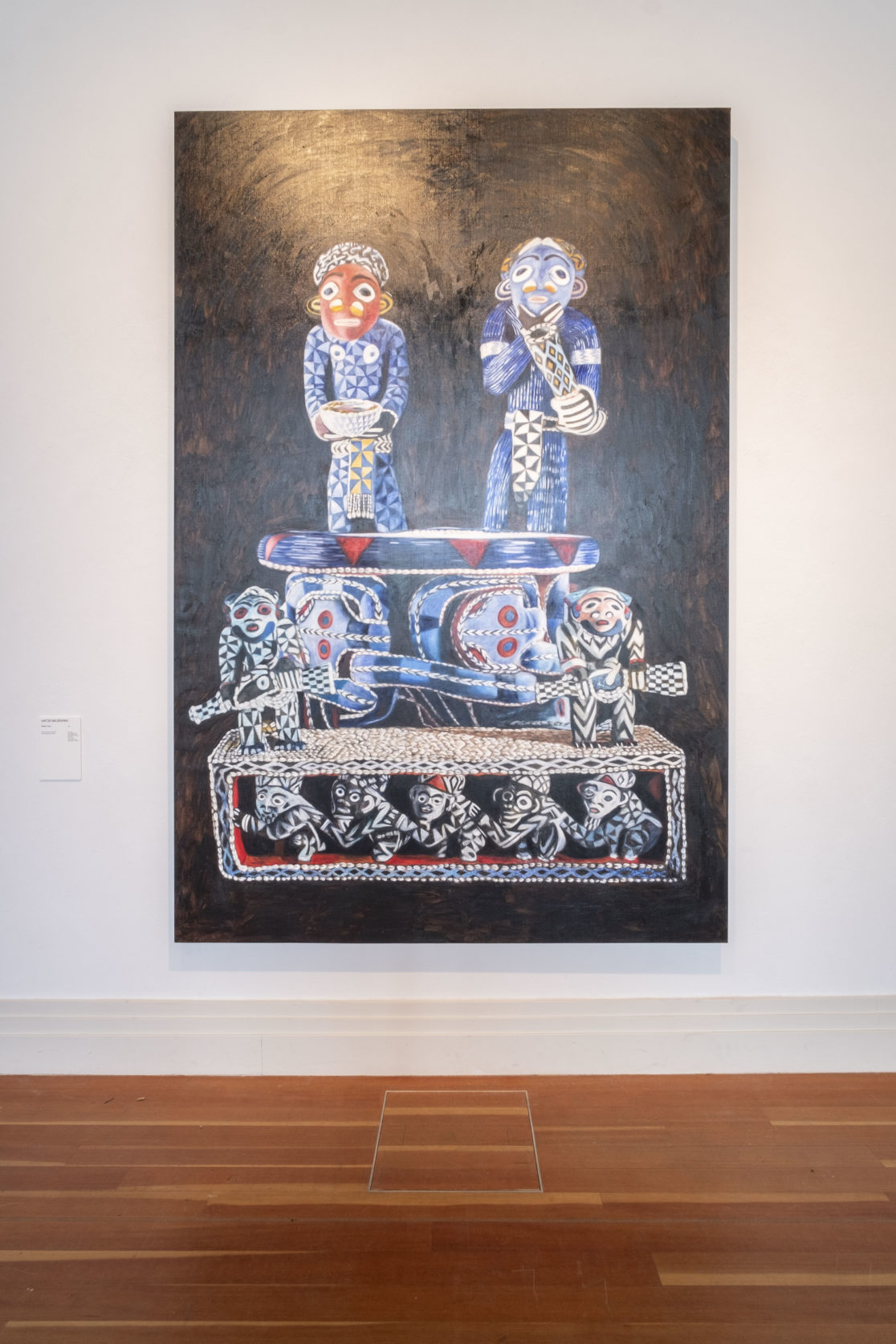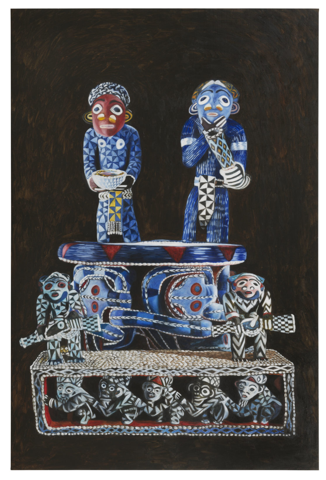 The oil painting Mandu Yenu (Reversed) shows the throne Ibrahim Njoyas, mirrored. It is based on an official press photo that Majewski received from the Staatliche Museen Berlin and that had already arrived in reverse. The throne thus becomes a “spectrum”, an image that takes its course from the exile of the actual object in the museum in Berlin via its photography for the Western public into an oil painting of European tradition, to one day make its way back to the palace museum in Foumban, built by the sultan’s grandson.