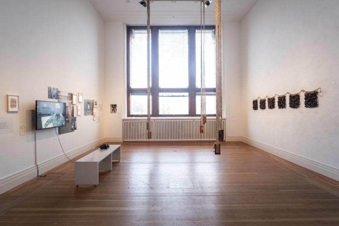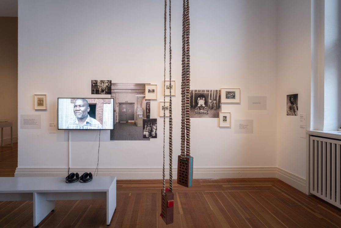 The installation “Le Trône” consists of a video and a painting by Antje Majewski as well as photographs of the German colonial era in Cameroon, which she found in archives and on ebay. It is part of the exhibition “The Shadow of the Sun,” which Antje Majewski conceived together with Olivier Guesselé-Garai.