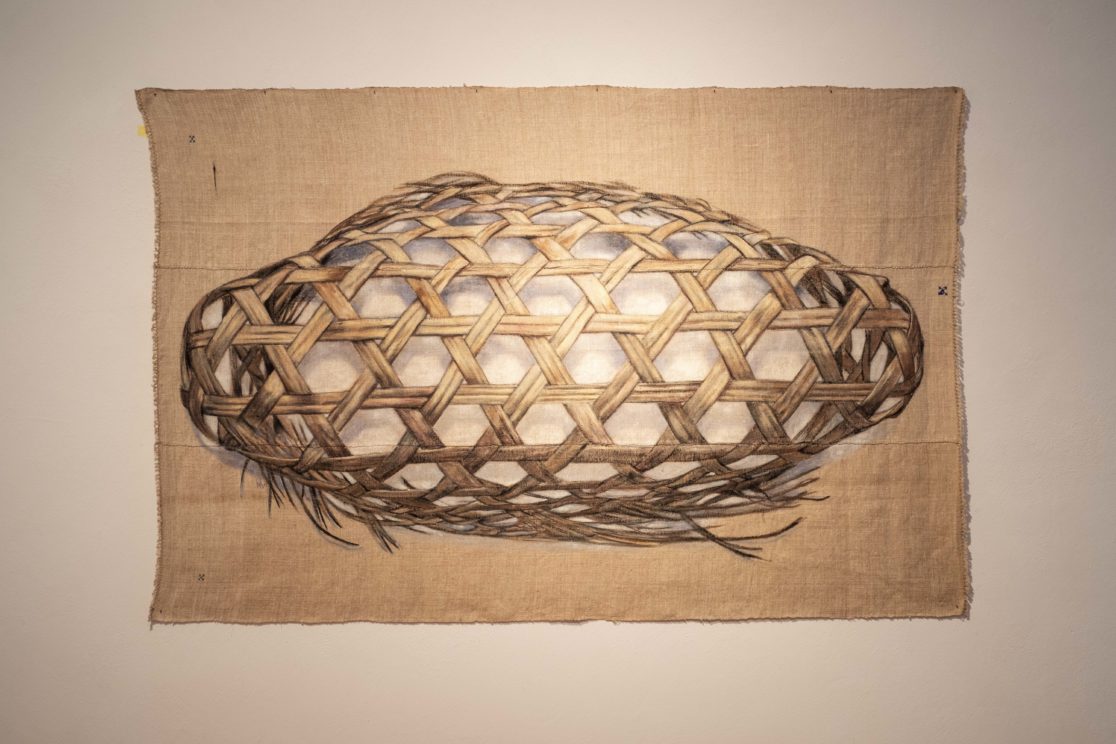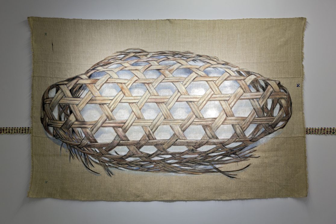 Antje Majewski’s painting Panier de Poulet, 2017, shows such a chicken basket in a trompe l’oeil painting on handwoven canvas.