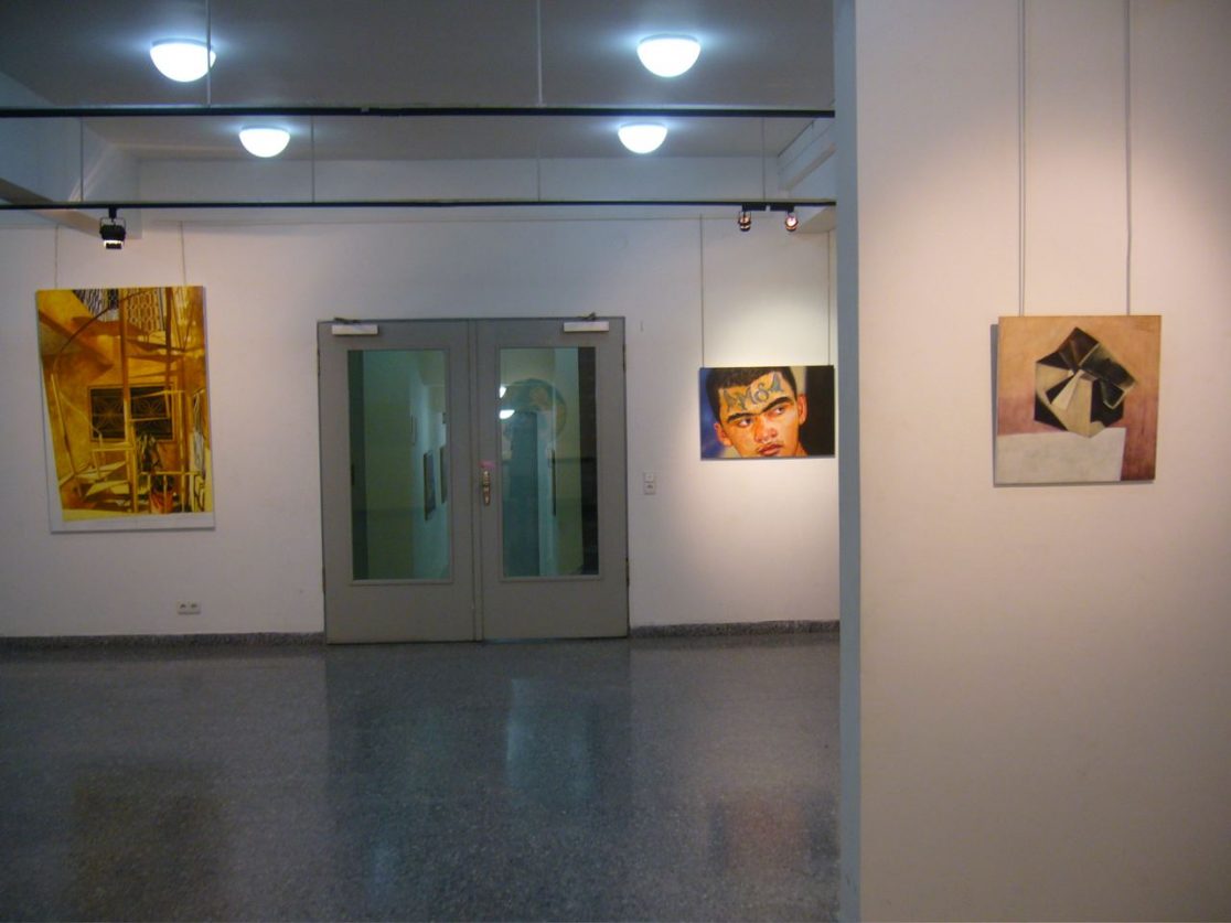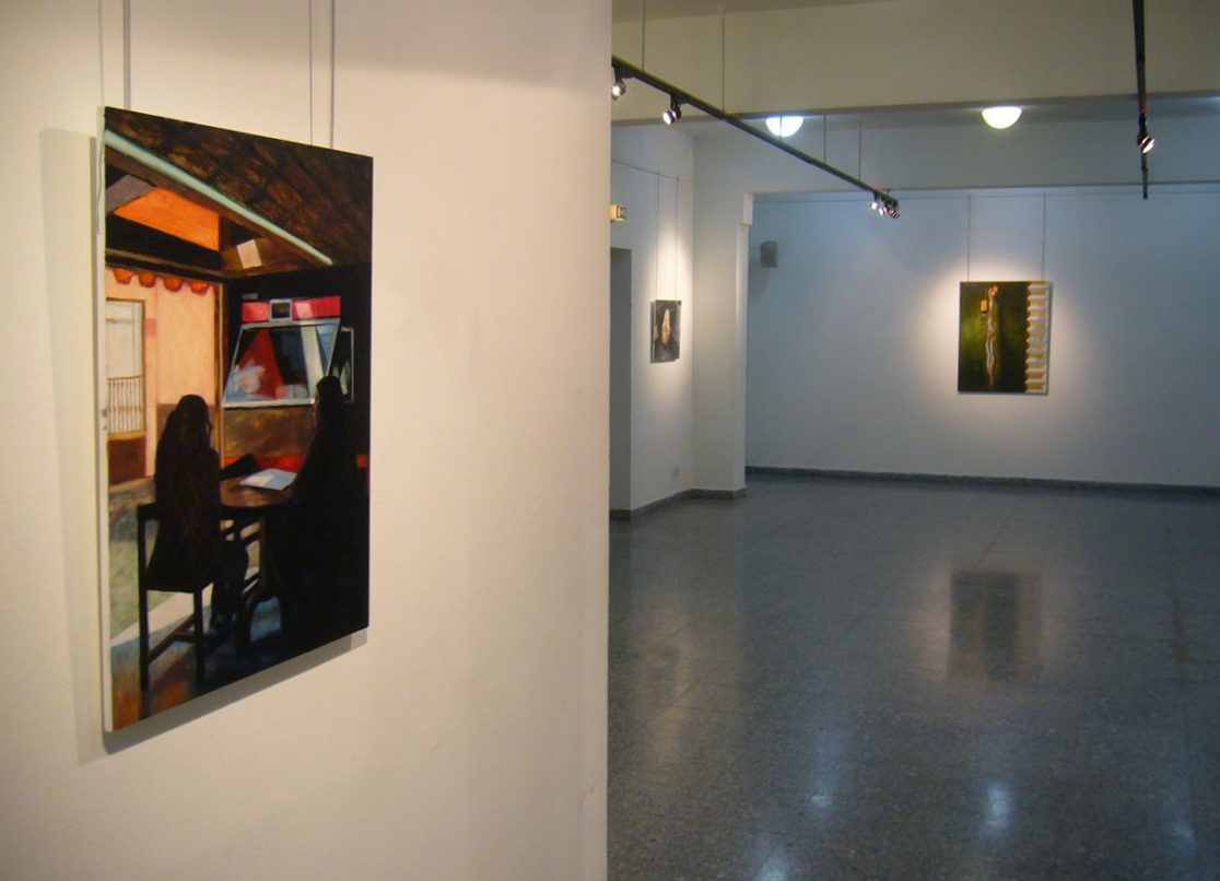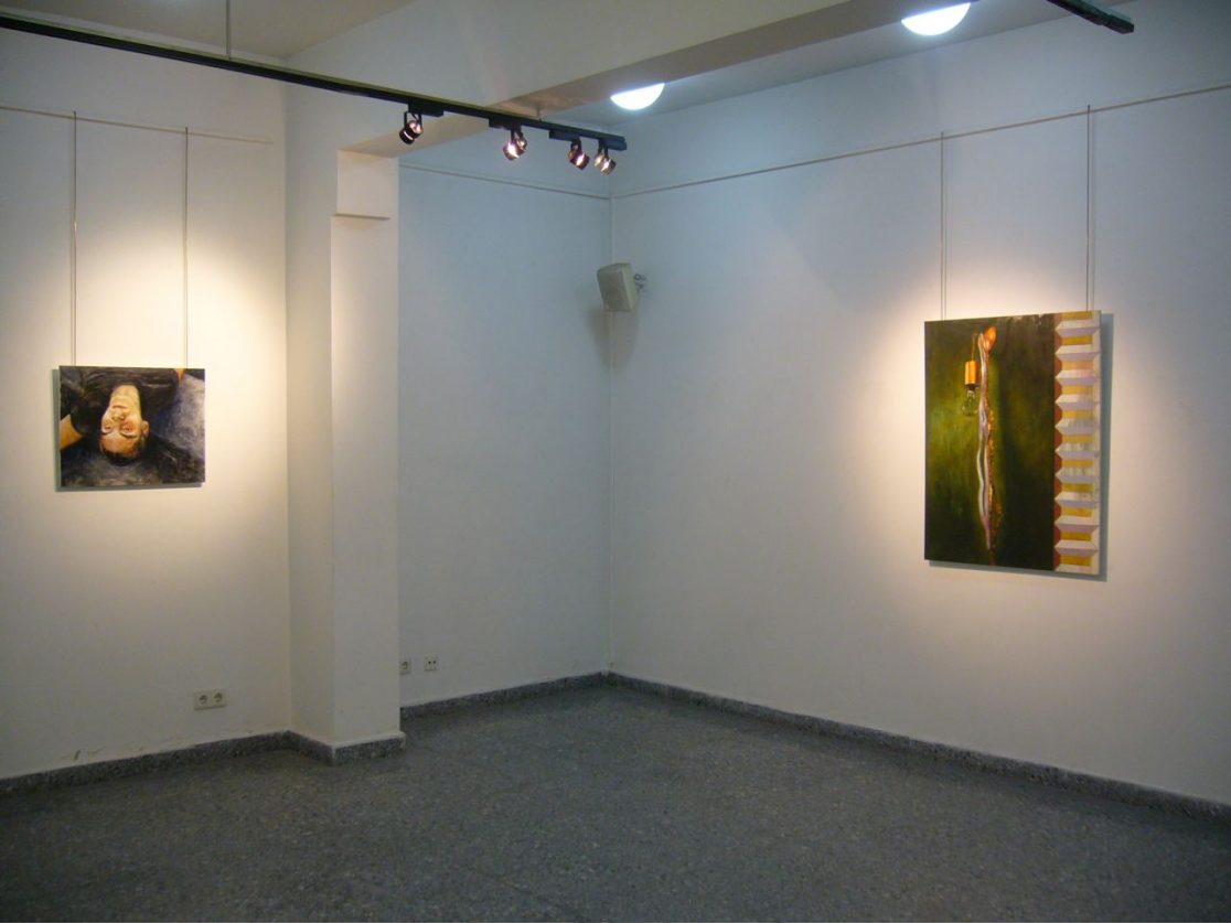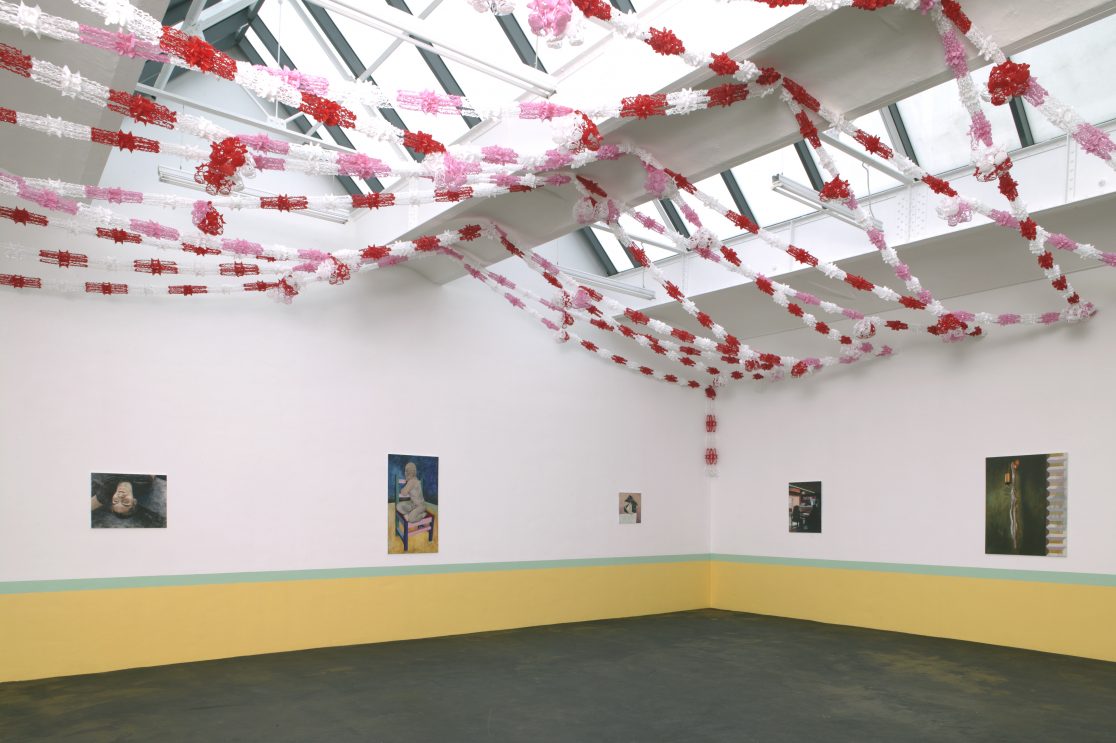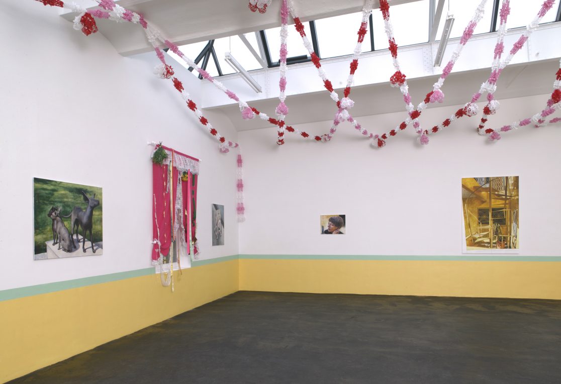 Mal de ojo is Spanish and can mean illness of the eye, but also „evil eye“. The exhibition at neugerriemschneider, 2005 consisted of nine rather small paintings, three photo collages and a curtain. The lower half of the room was painted in a vivid yellow, set up against the upper white half by a small green stripe. On the ceiling I had put a lot of garlands. The title also referred to the strange perspectives I used in some of the paintings, and finally with an interest in brujeria (witchcraft) and the survival of ancient religions in México.