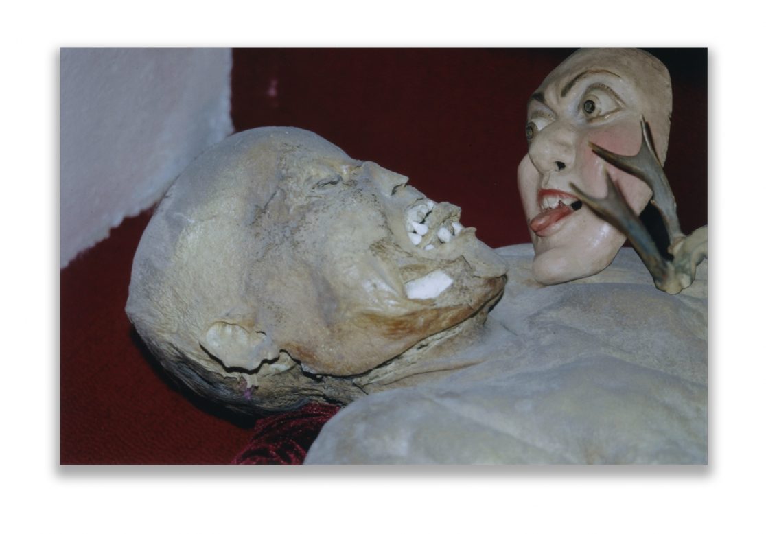 In the ancient mining town of Guanajuato, the mineral soil and the very dry climate have preserved dead people that have been in it only for some decades. It is very touching to see mummified babies in the first plastic diapers that came into use. The photo of the mummy for “??” was taken in there, and collaged together with a mask.[6]
