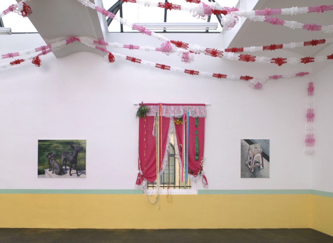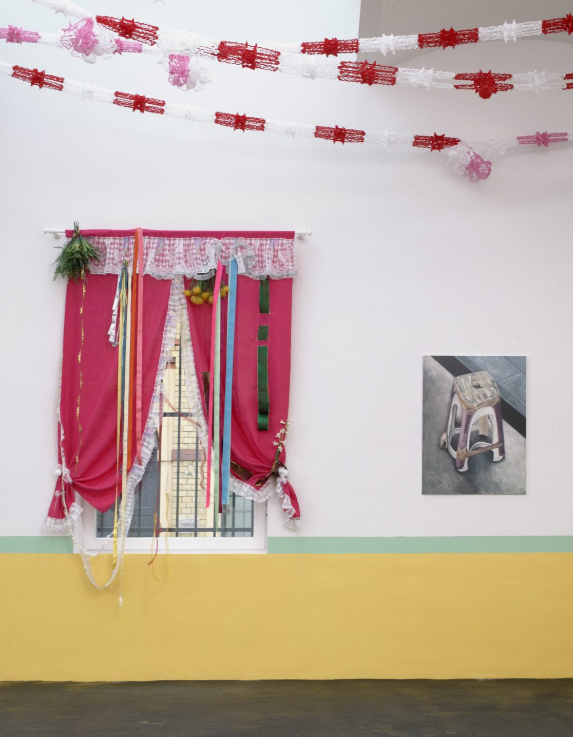 The beads reappear on Mal de ojo, a ready made curtain in shocking pink with white seams, which I had bought to cover the window of the gallery. Colorful beads and artificial plants and flowers are dangling down from it. I chose quite humble plants that could be used in medicines, and imagined a very old bruja that had gone crazy. For every event that troubled her she would add an element to this curtain. It served to shield of the evil eye.