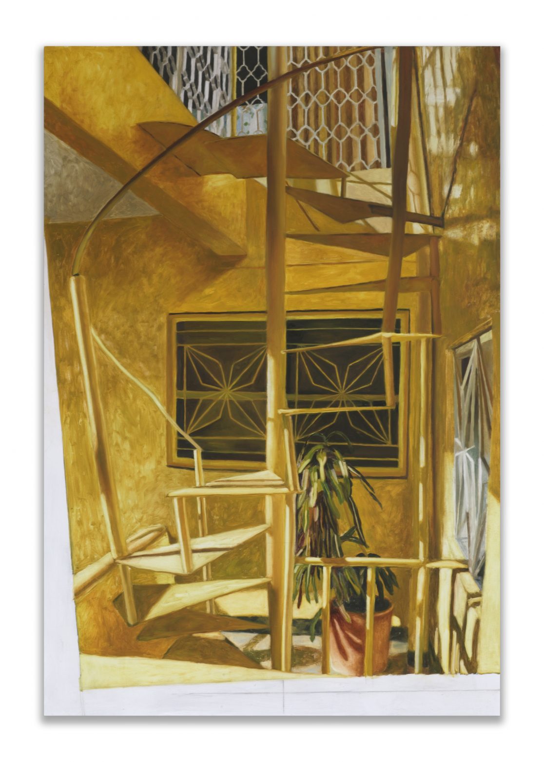 Eisentreppe (Iron staircase) is another spatial exercise. I collaged several photos together and obtained a space that is at the same time very convincing and not quite correct. The space is mainly defined by the shadow and light on the bright yellow walls. The stairs themselves seems very unstable, fragile, slightly distorted; you need some trust to use them. I saw them in the windblown city of Salina Cruz, where we stayed near the giant harbor.