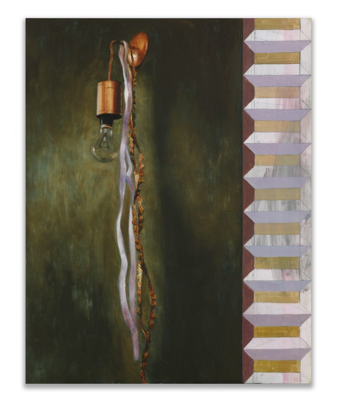 Lampe (Lamp): an old fashioned light bulb is decorated by some beads. The indígenos love beads, they use them on their hats and frocks. The beads are festive, but they also indicate authority. The light bulb on the dark green wall is not lit; it is hanging in a space full of a diffuse daylight, a painterly space of the 19th century. I thought of it as hanging in the cabin of one of the earliest trains making it’s way from America to México or the other way round. On the right hand side some abstract ornaments introduce a different kind of space.
