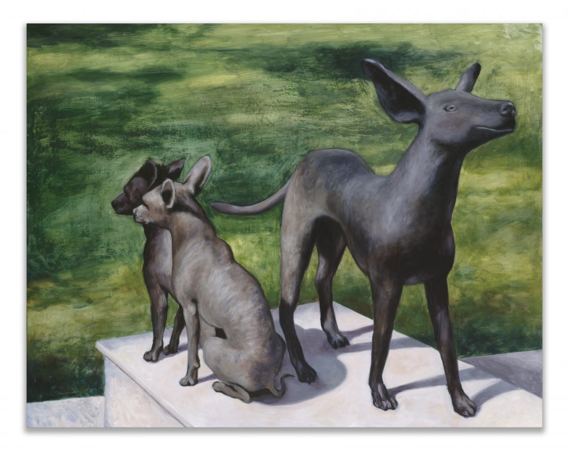 Xoloitzcuintles are a very ancient Mexican breed of dogs without hairs[13]. The Aztecs loved them for various reasons; they had them as pets, used them as living hot-water bottles– a very cold night was called a “Three Dog Night” – and ate them in large quantities. They were also considered to be curative for anything from rheumatism to stomach pains (applied from the outside as well as from the inside). Finally it was very important to have owned a dog in your lifetime, because one legend says that after death you will find yourself in front of a huge river, which you can’t cross without the help of your Xoloitzcuintle [14]. The Aztecs connected them with the god of death Xoloti; their skeletons and mummies were found in many pre-Columbian graves [15]. After their near extinction – because of their human-like skin they were used for the testing of gas in WWI – some Mexican enthusiasts started to breed them again. Amongst them were Frida Kahlo and Diego Rivera, as well as their wealthy friend, the late Dolores Alameda. It was in her park that I photographed some of these rare dogs next to a bronze sculpture of a Xolo; because of the strange color of their naked skin they resembled the bronze to a degree that in my painting it is hard to tell which is alive and which is dead.