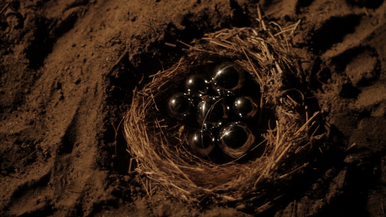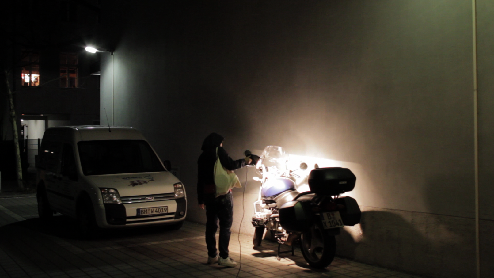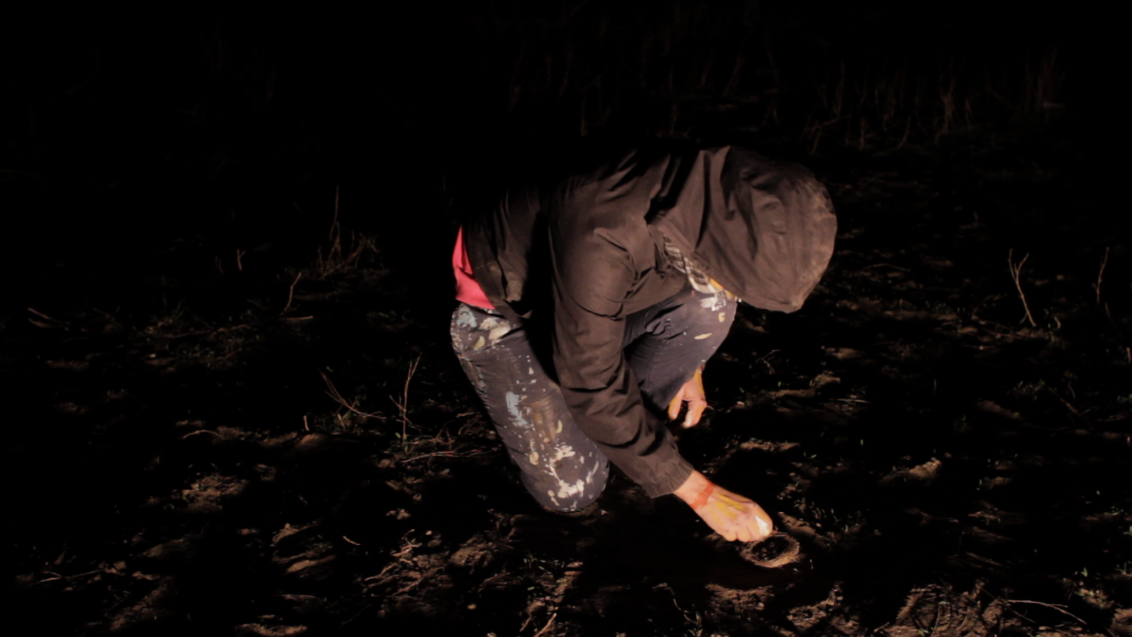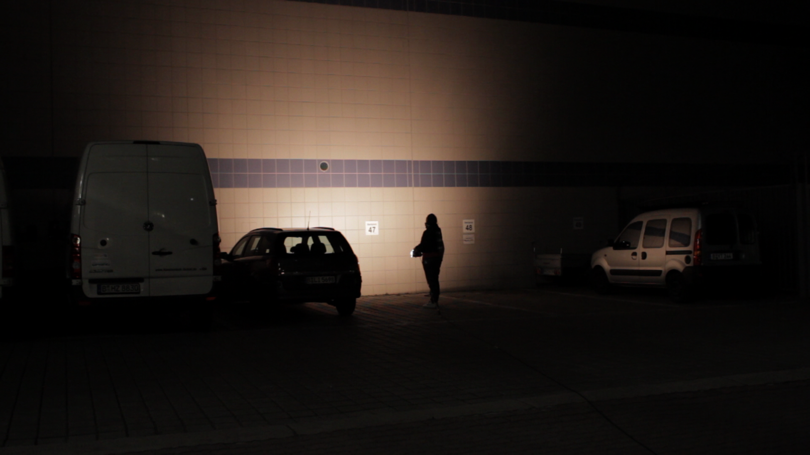 We see the artist leaving her studio in Berlin-Wedding with a construction lamp–powered by colored electric cables–to bring selectively chosen objects, structures and scenes out of the darkness. She appears to be following a prescribed path, which she continues to follow until, as a ritual act, she paints her own hands and face before finally lying down on an urban wasteland of silver balls – “metallic seeds” – in a nest on the floor.