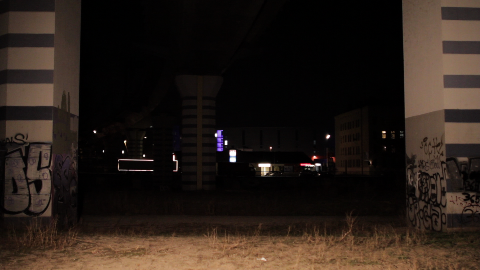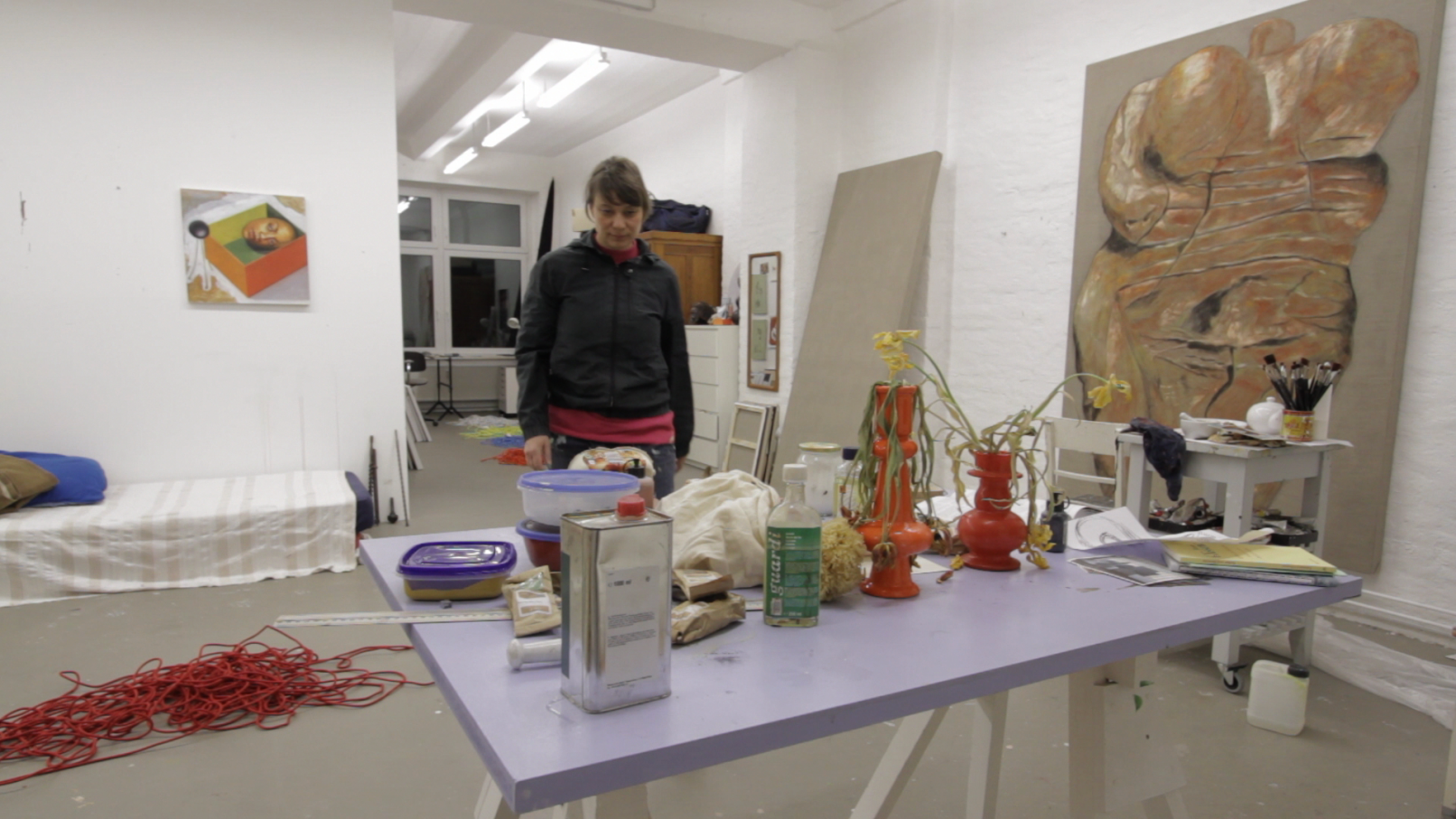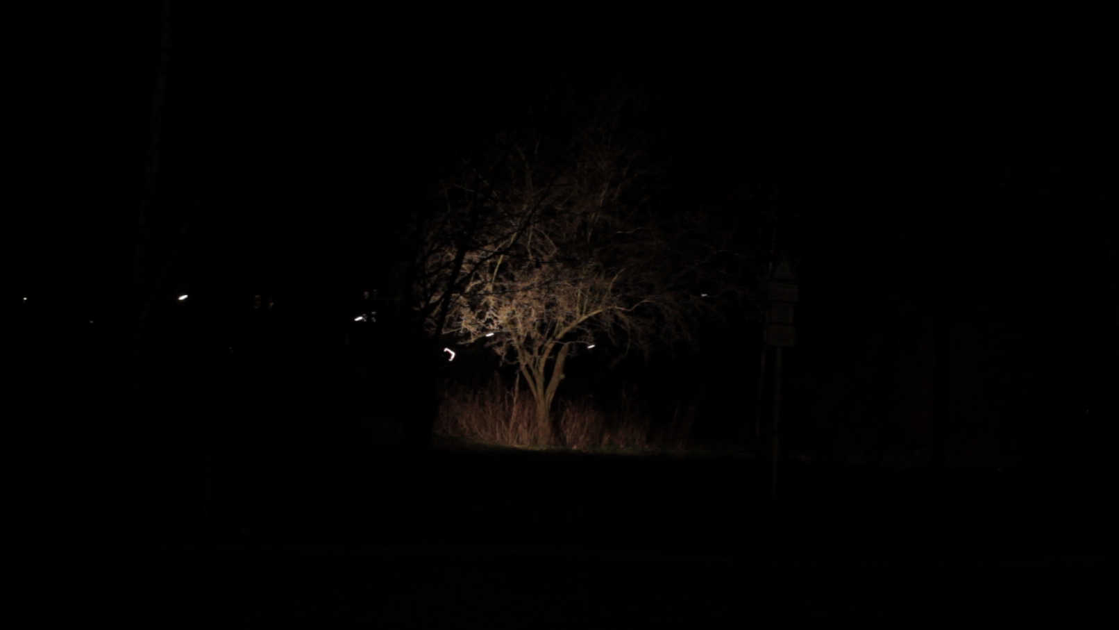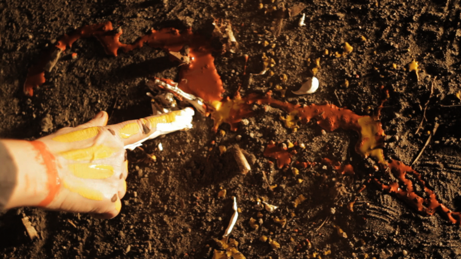 We see the artist leaving her studio in Berlin-Wedding with a construction lamp–powered by colored electric cables–to bring selectively chosen objects, structures and scenes out of the darkness. She appears to be following a prescribed path, which she continues to follow until, as a ritual act, she paints her own hands and face before finally lying down on an urban wasteland of silver balls – “metallic seeds” – in a nest on the floor.
