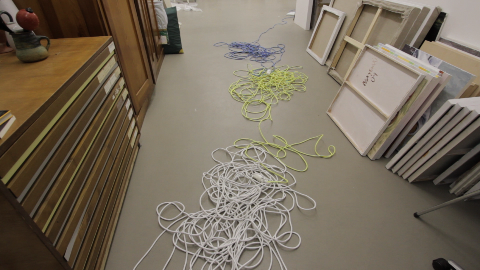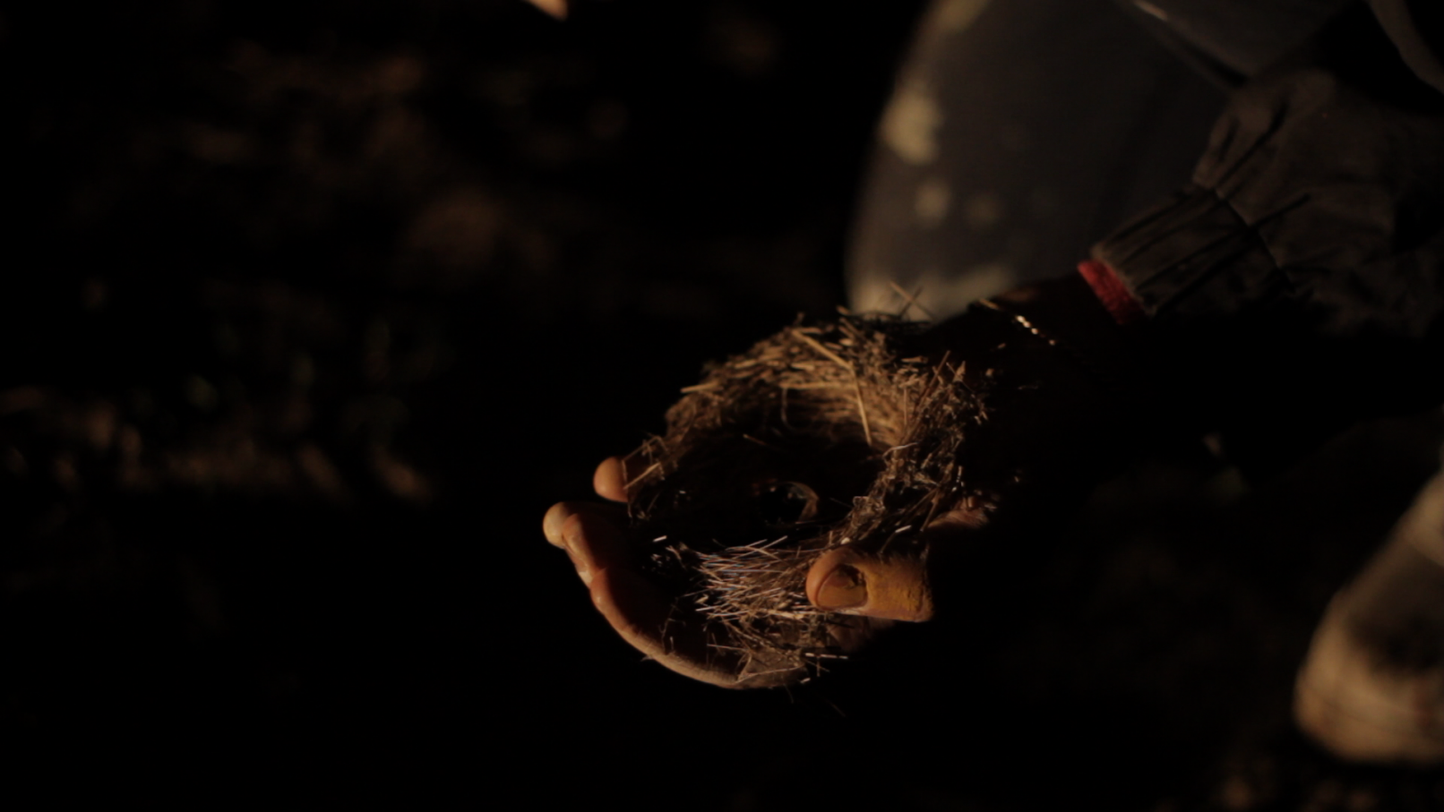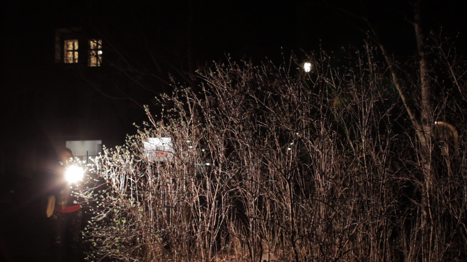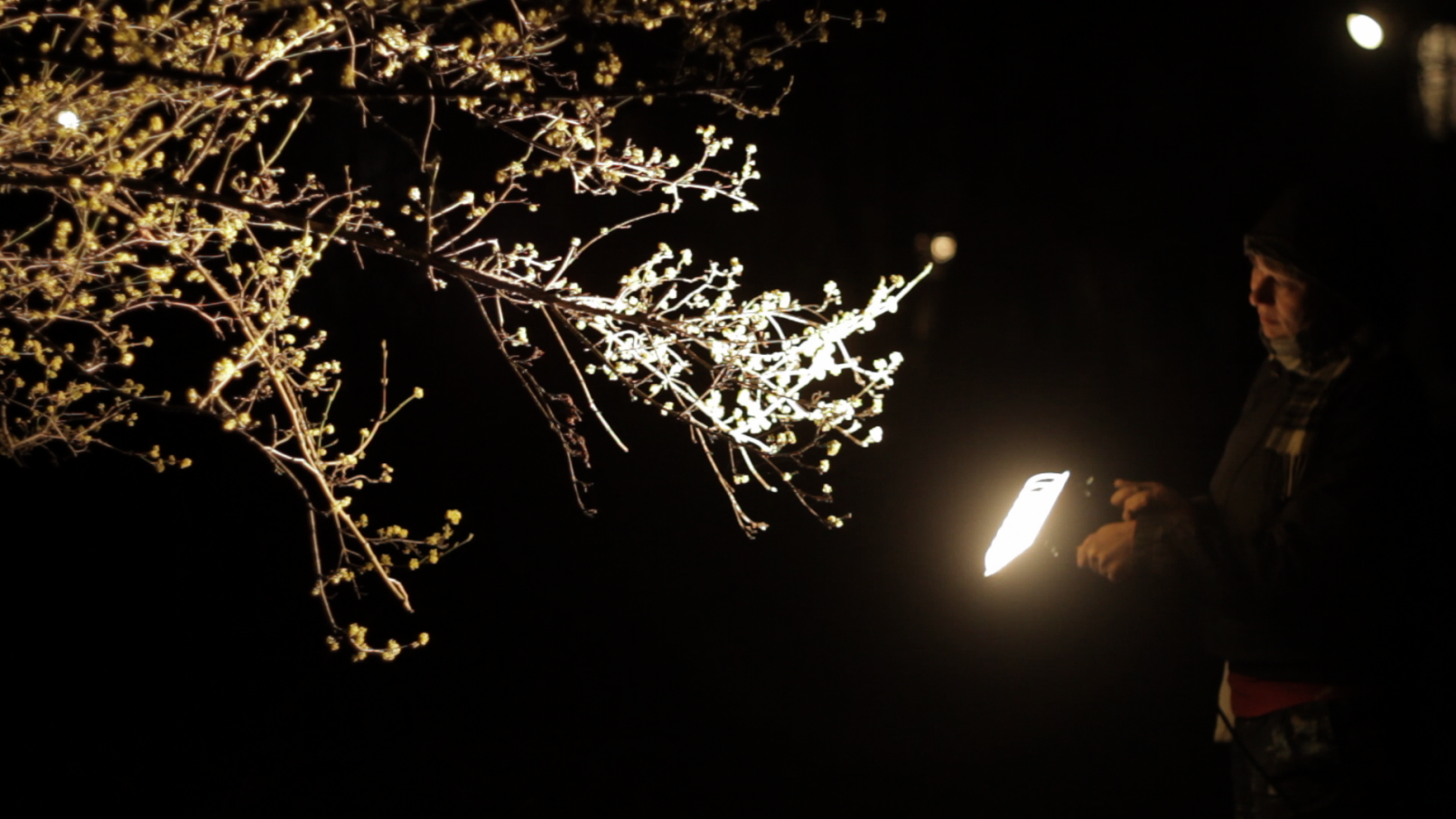 We see the artist leaving her studio in Berlin-Wedding with a construction lamp–powered by colored electric cables–to bring selectively chosen objects, structures and scenes out of the darkness. She appears to be following a prescribed path, which she continues to follow until, as a ritual act, she paints her own hands and face before finally lying down on an urban wasteland of silver balls – “metallic seeds” – in a nest on the floor.