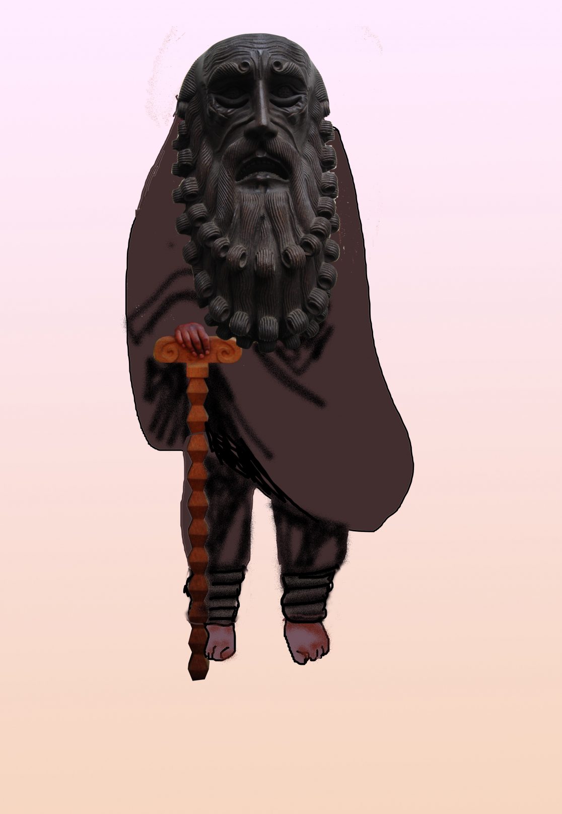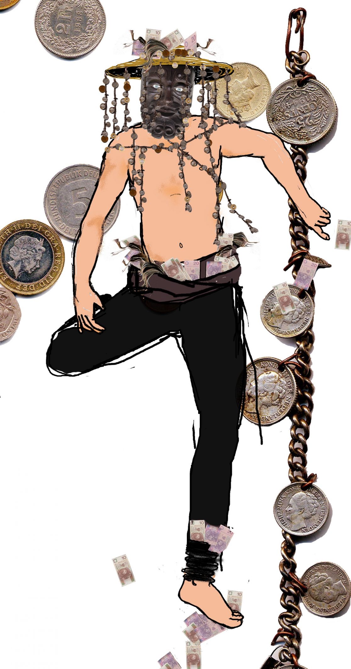 For the installation for Objects do Things (curated by Joanna Zielinska) at Zamek Ujazdowski, Antje Majewski painted Srebro na płótnie ( Skarbek). The painting shows silver, as it can be found in the mountains: squeezed into strange forms by the veins inside the rock. Skarbek himself materializes in the form of three masks: a very large one, one of human size and another very small one, which was used for the head of the marionette. All three masks were bought in Mexico. With their dramatic gothic carvings they stylistically reflect the time in which the Spanish conquered Mexico and its rich gold and silver mines.