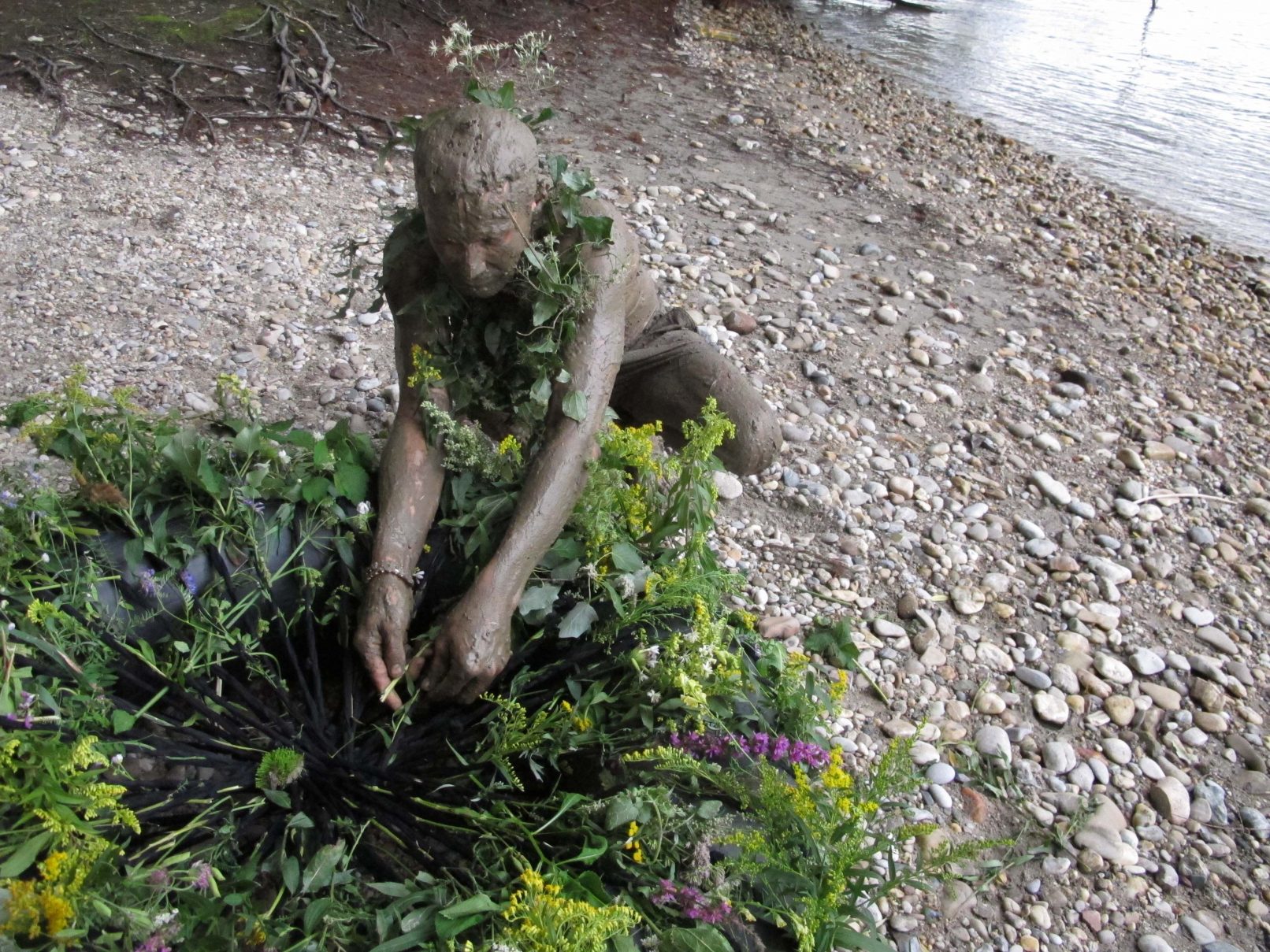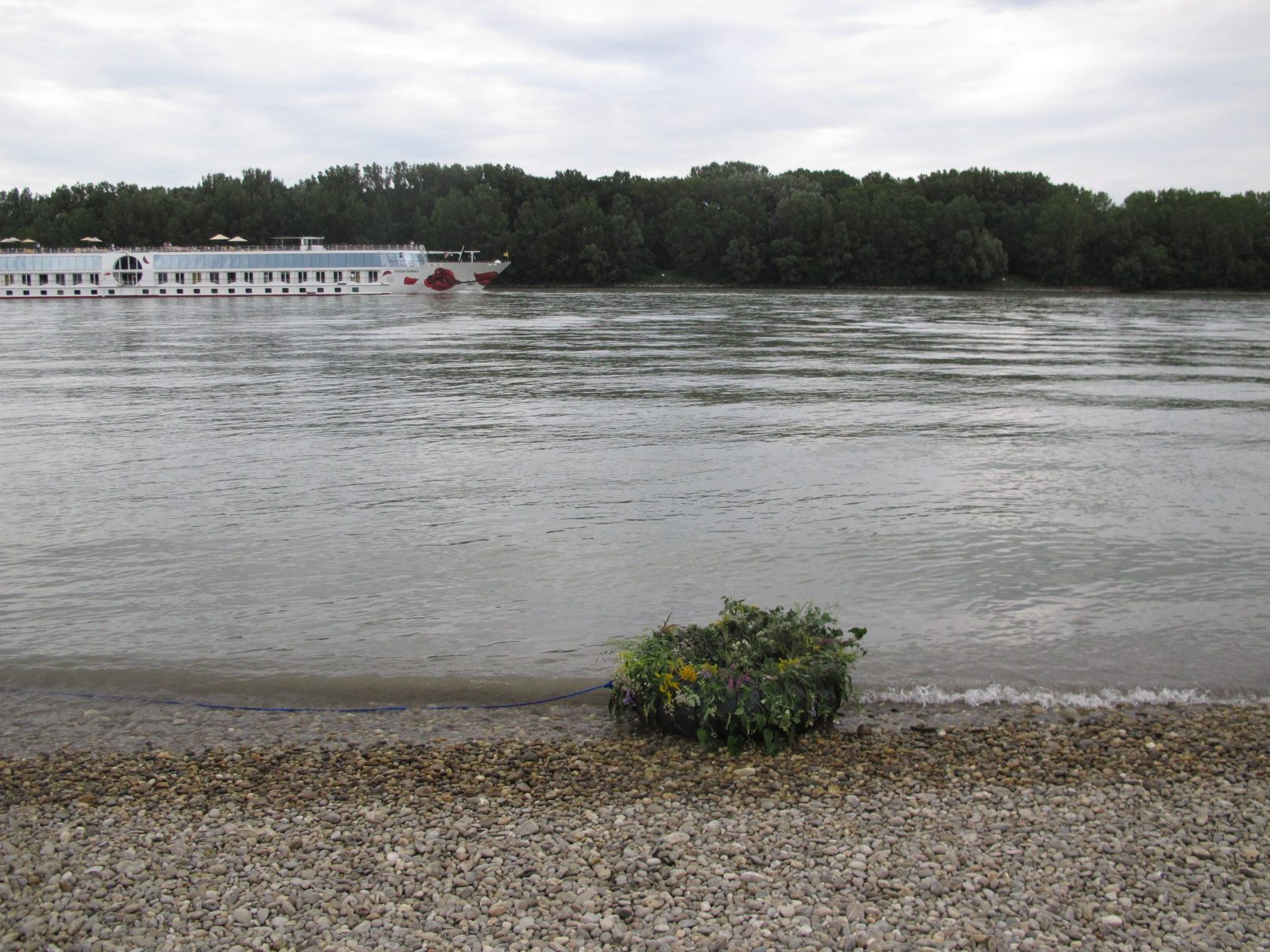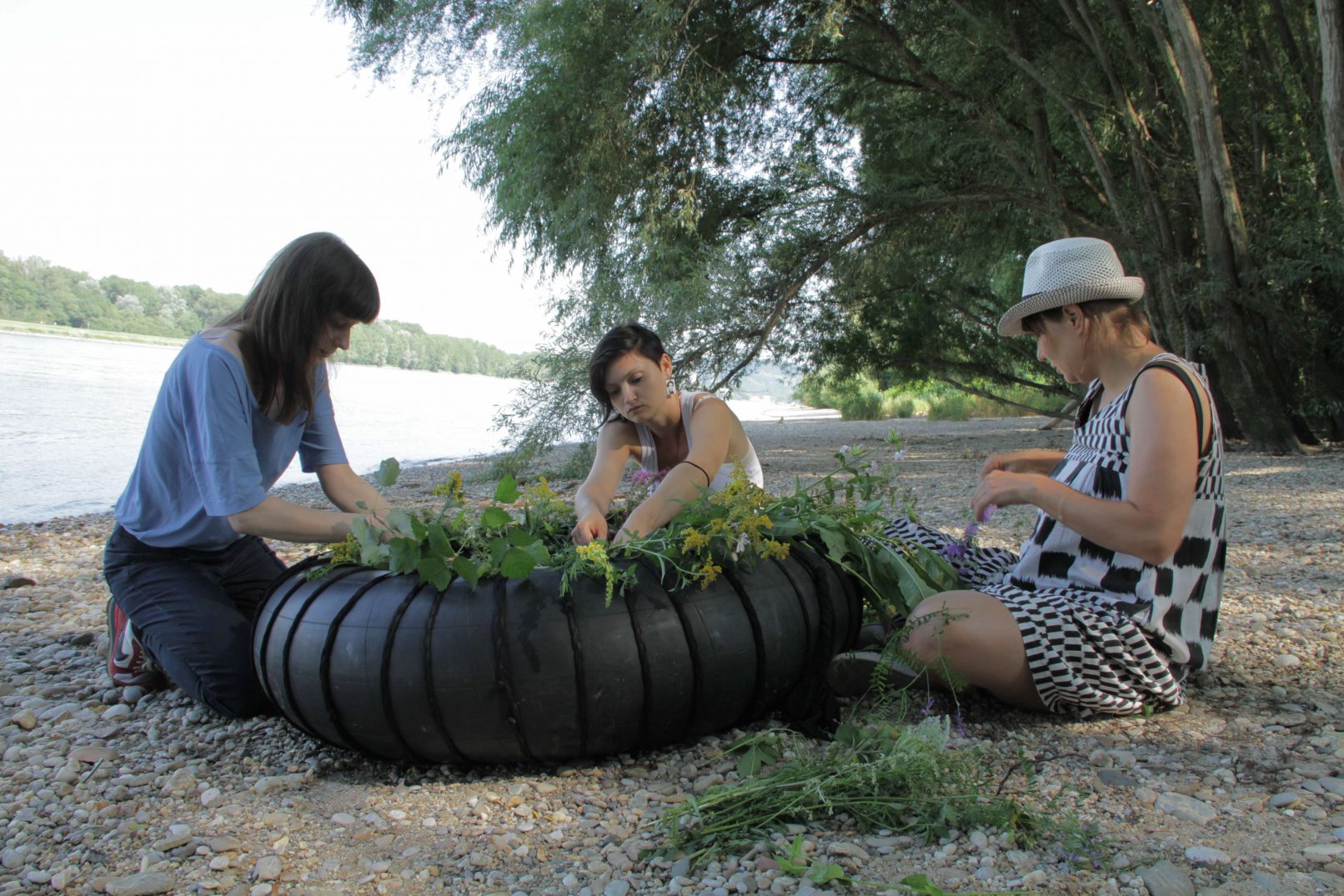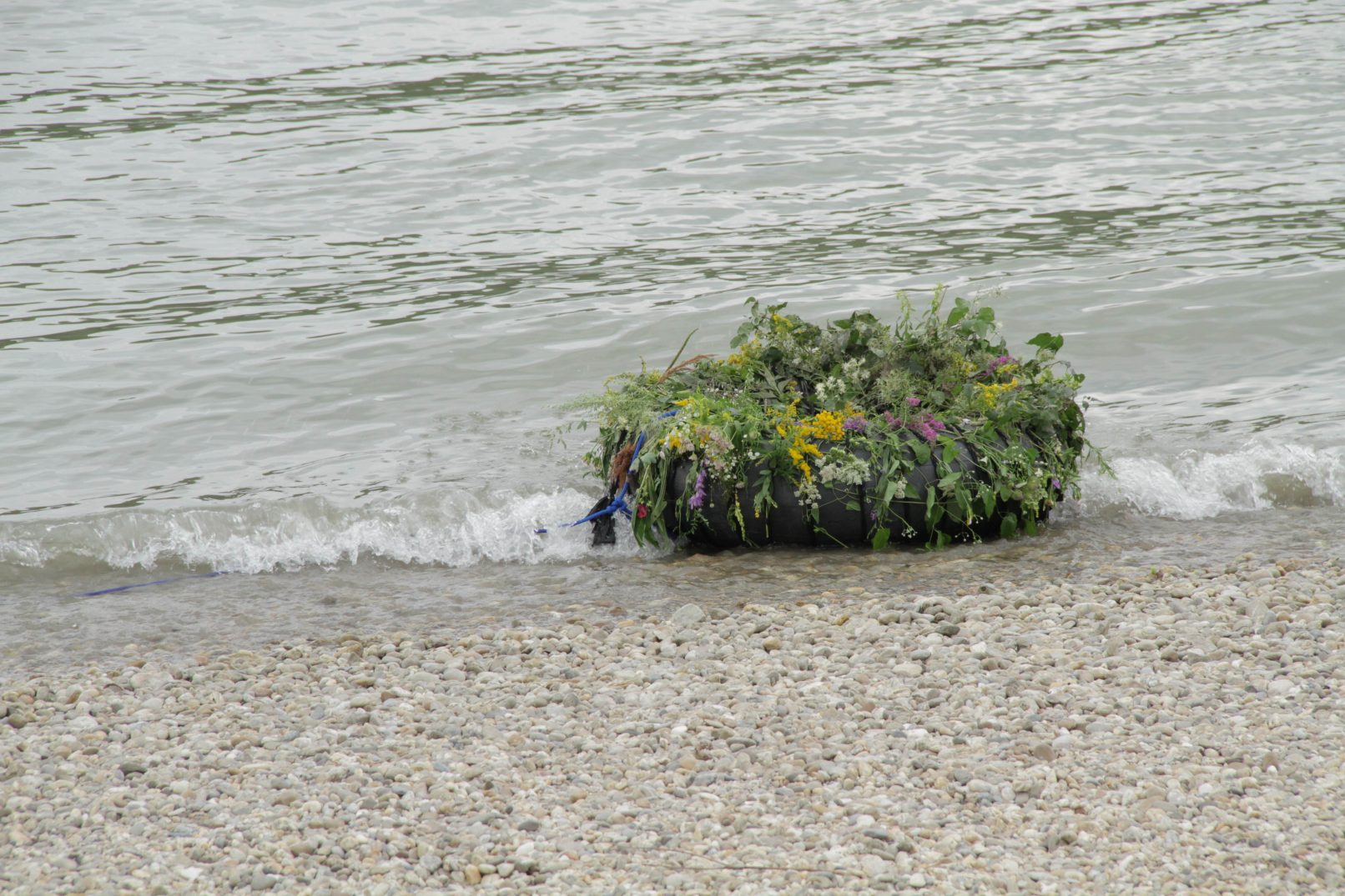 The production money was mostly spent on a wonderful picknick for us and the audience, a bit further down the river, where we found beautful trees. After the meal, we asked all that considered themselves females to go and pick wild flowers in the surrounding woods. They were allowed to only pick two of each type of flower. With the collected flowers, we adorned a rubber tyre. A performer covered himself in mud and was carried of us all together to the river, where he was left to float. He floated about 10 minutes down the river and finally stranded near Strombad Kritzendorf.