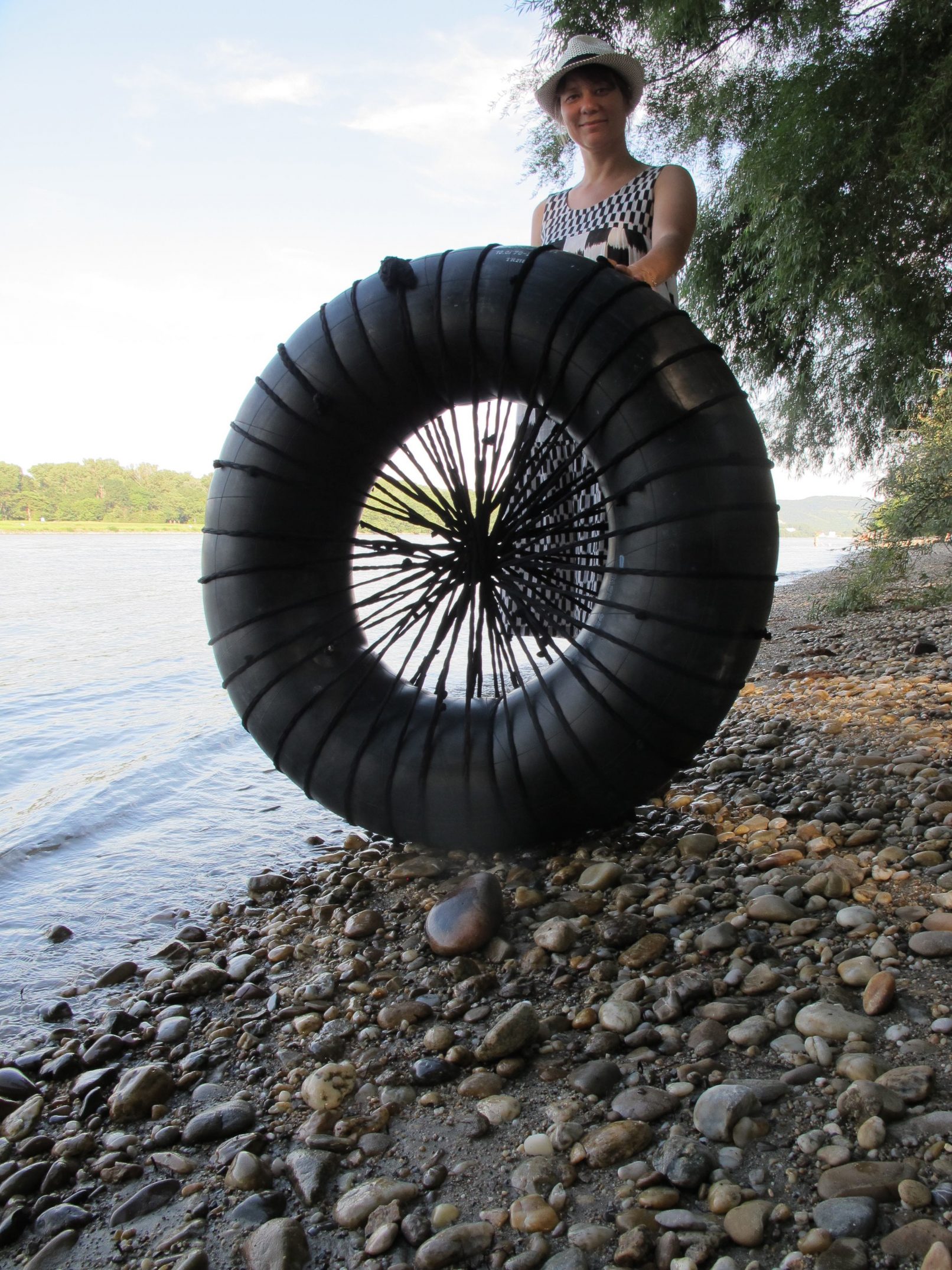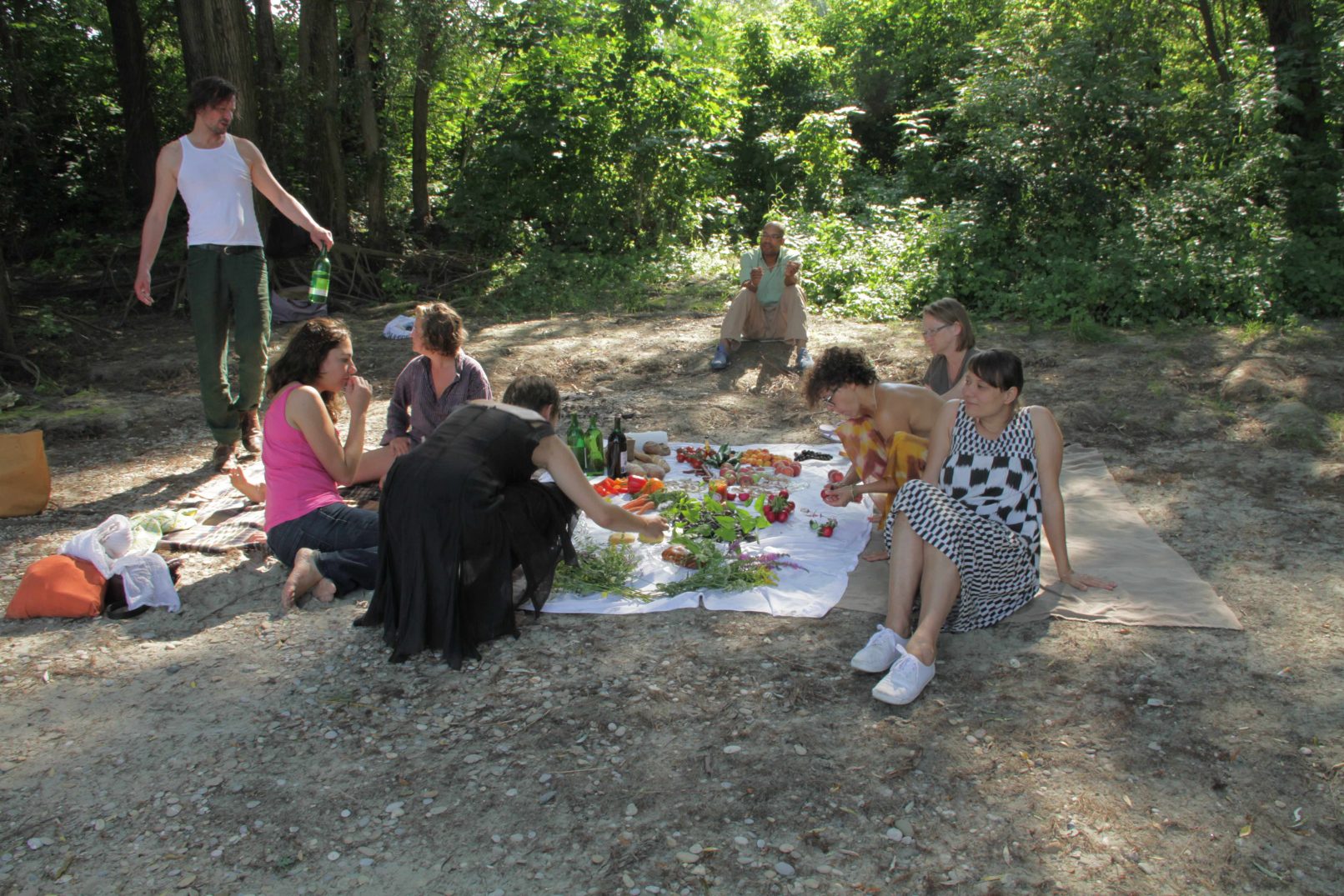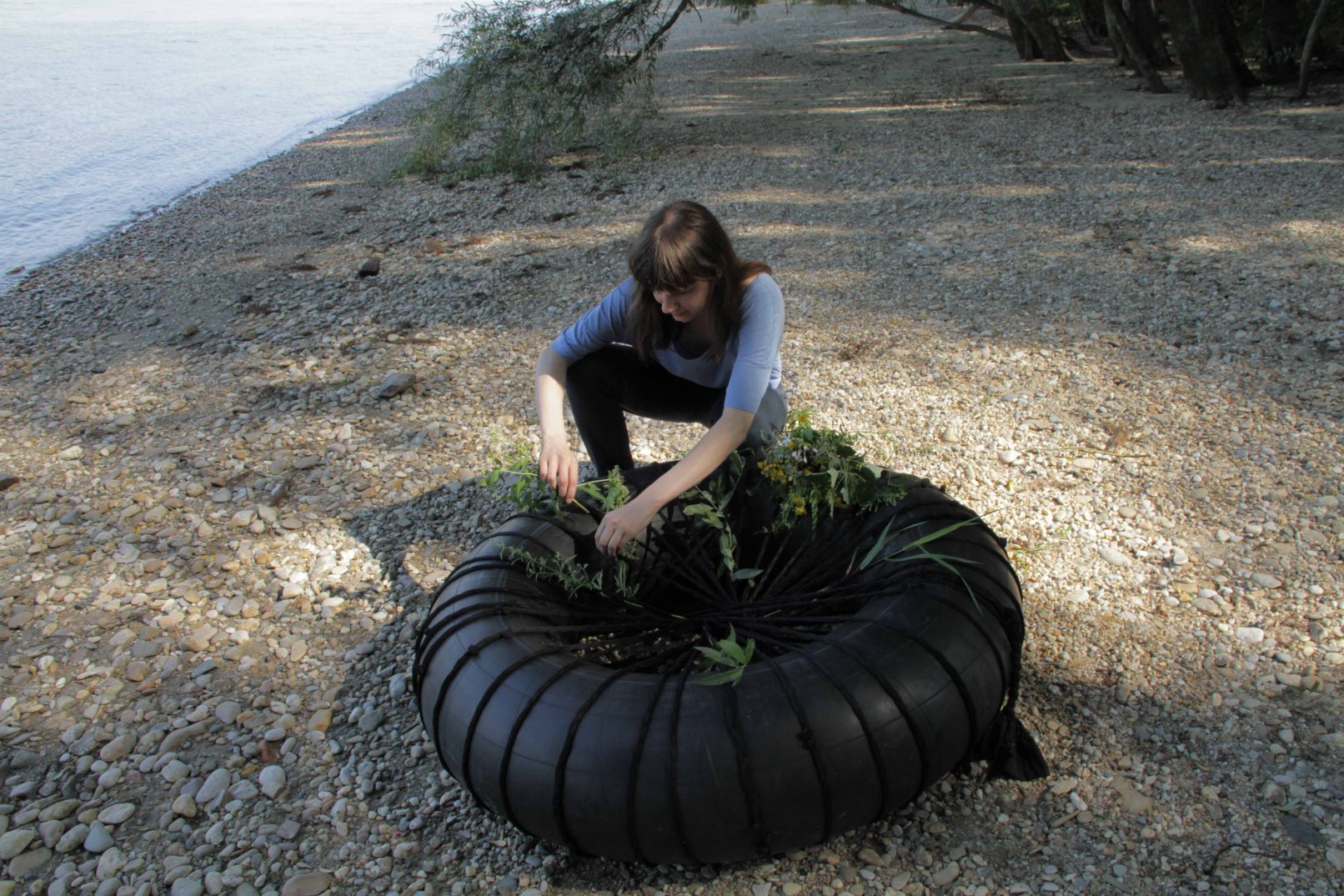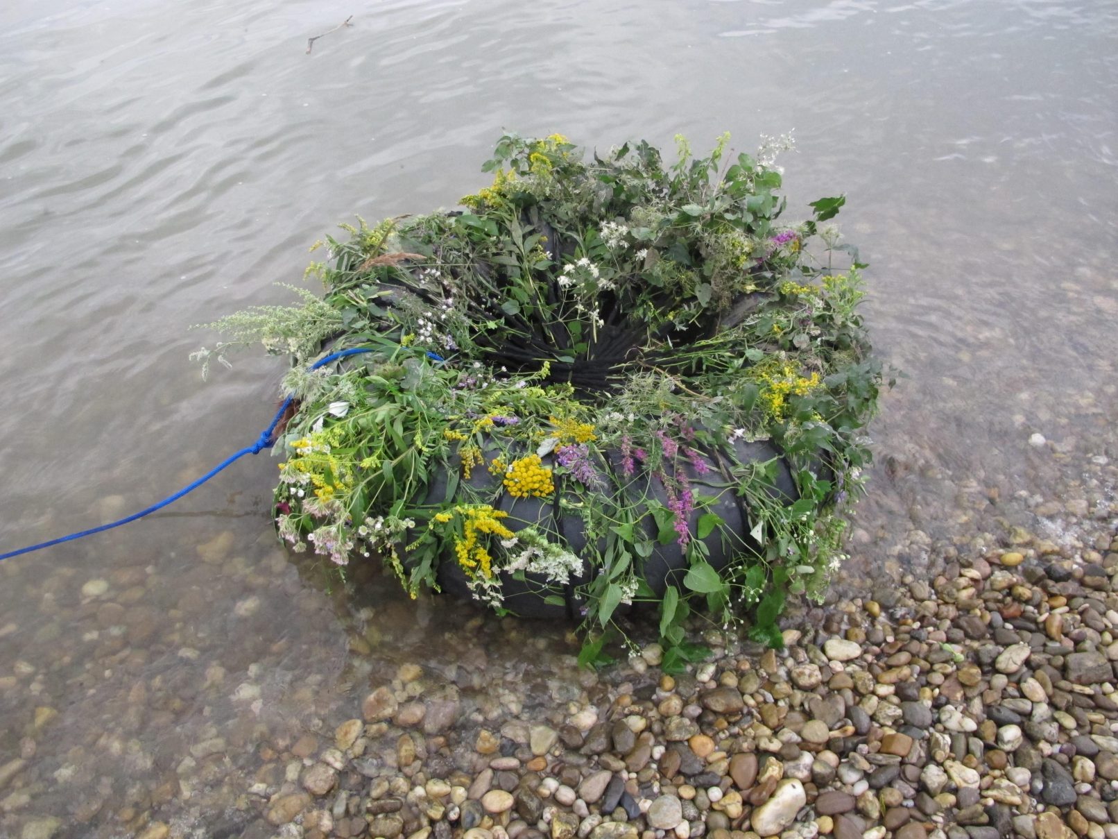 The production money was mostly spent on a wonderful picknick for us and the audience, a bit further down the river, where we found beautful trees. After the meal, we asked all that considered themselves females to go and pick wild flowers in the surrounding woods. They were allowed to only pick two of each type of flower. With the collected flowers, we adorned a rubber tyre. A performer covered himself in mud and was carried of us all together to the river, where he was left to float. He floated about 10 minutes down the river and finally stranded near Strombad Kritzendorf.