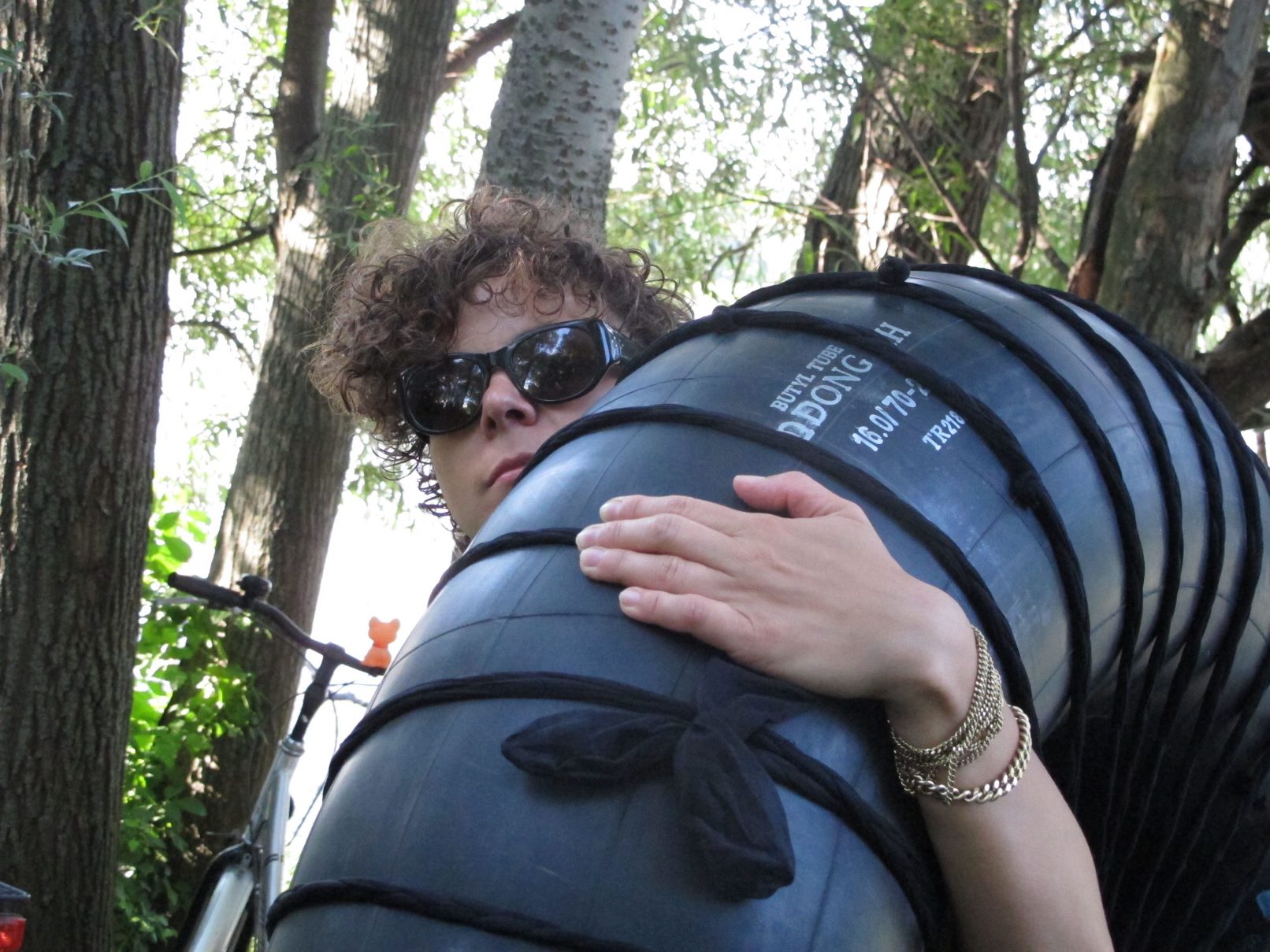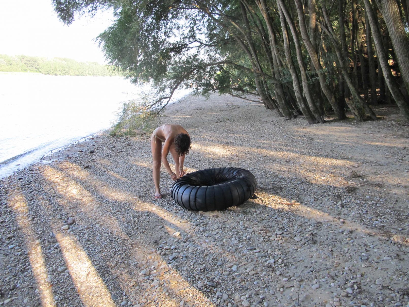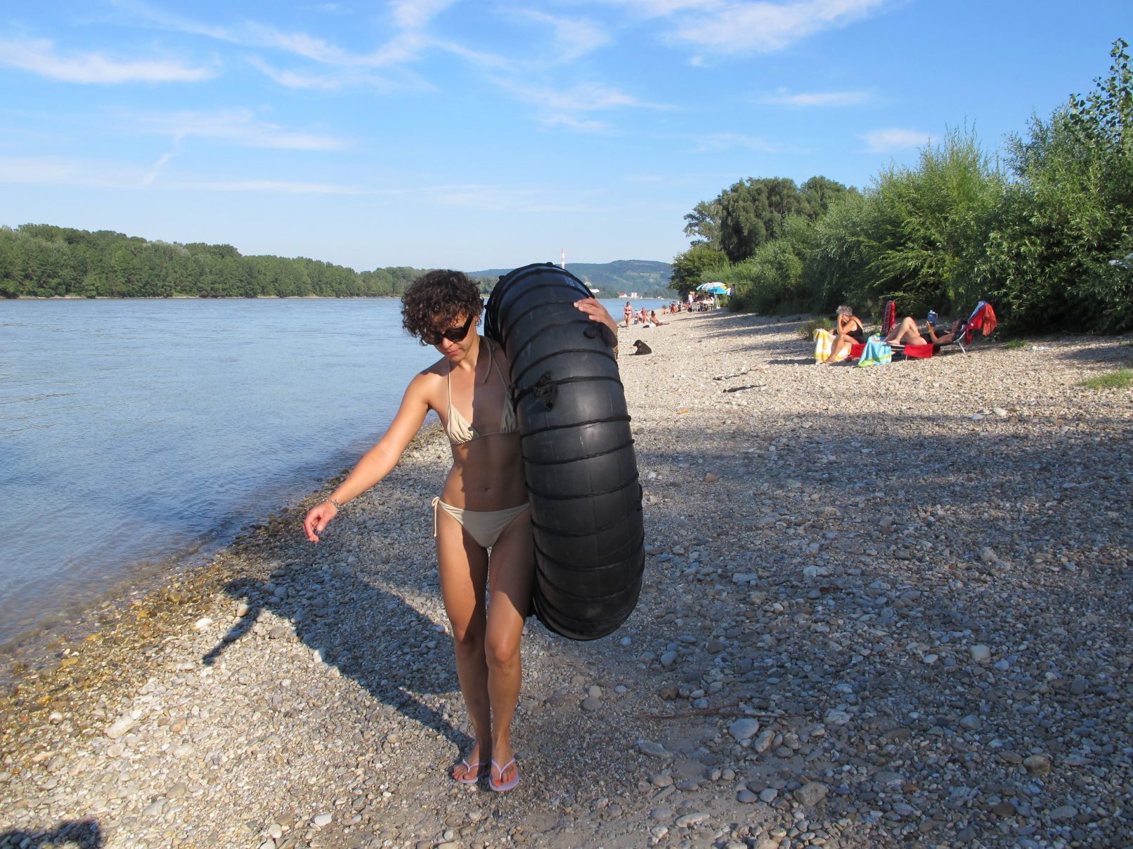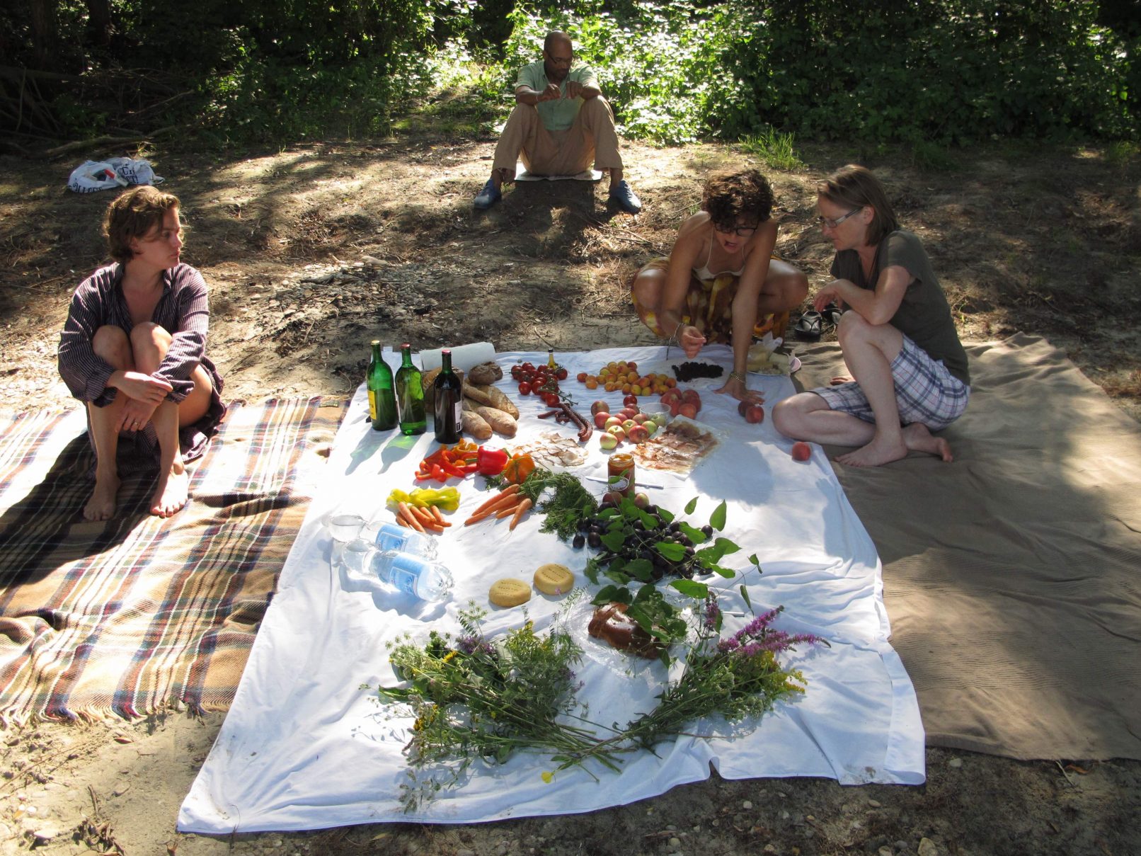 The production money was mostly spent on a wonderful picknick for us and the audience, a bit further down the river, where we found beautful trees. After the meal, we asked all that considered themselves females to go and pick wild flowers in the surrounding woods. They were allowed to only pick two of each type of flower. With the collected flowers, we adorned a rubber tyre. A performer covered himself in mud and was carried of us all together to the river, where he was left to float. He floated about 10 minutes down the river and finally stranded near Strombad Kritzendorf.