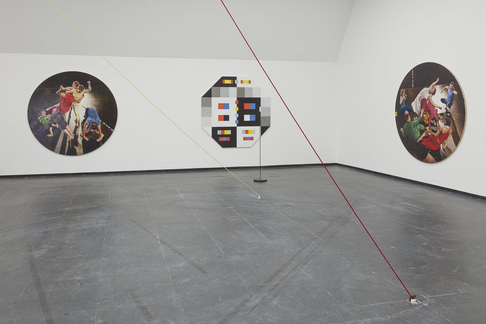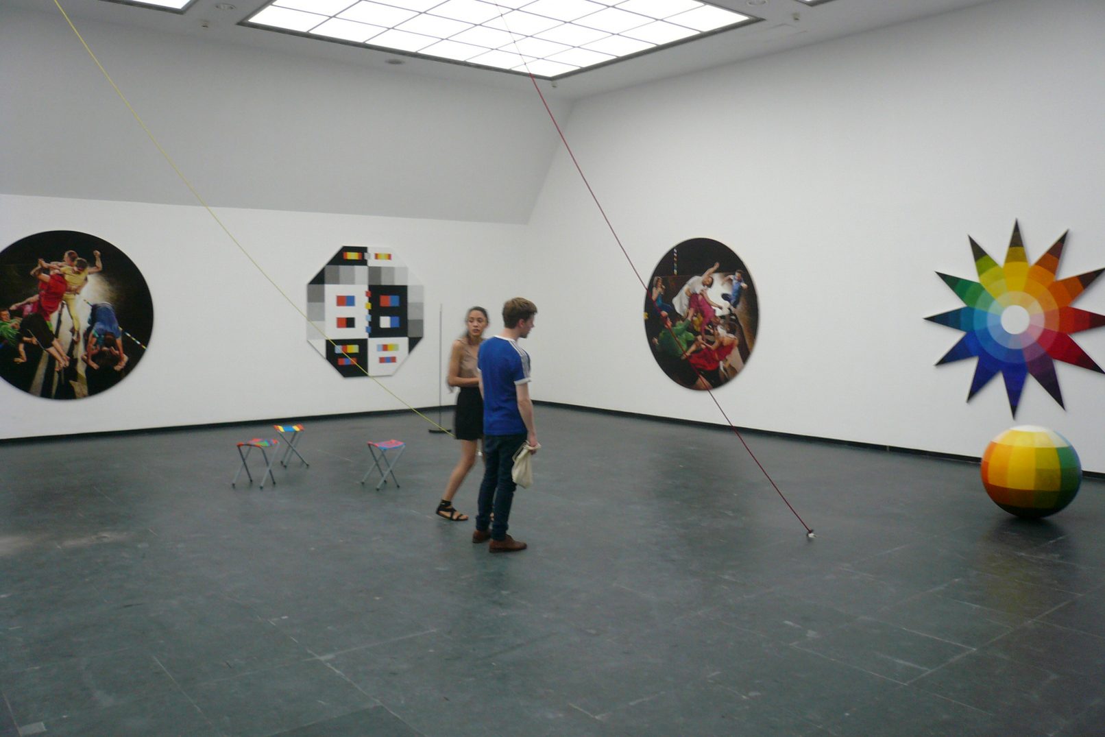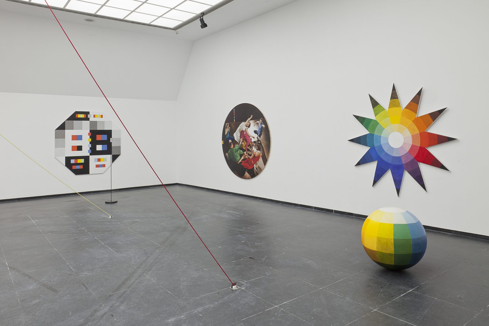 Tanz RGBCMYK comprises six new paintings and a colour sphere by Antje Majewski. Three paintings of intertwined dancers, dressed in red, green, blue, cyan, yellow, magenta and black, face three paintings based on the colour theories of Goethe, Runge, Itten and Küppers. They do not depict theoretically correct compositions of colour, but rather historic colour tables, the colours of which have altered over the course of time.