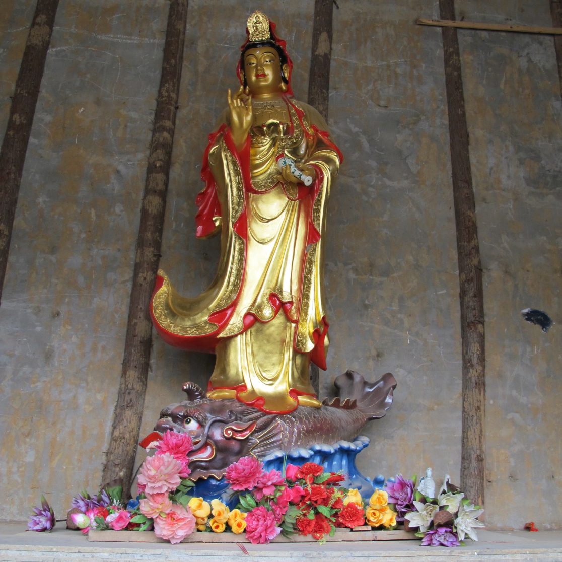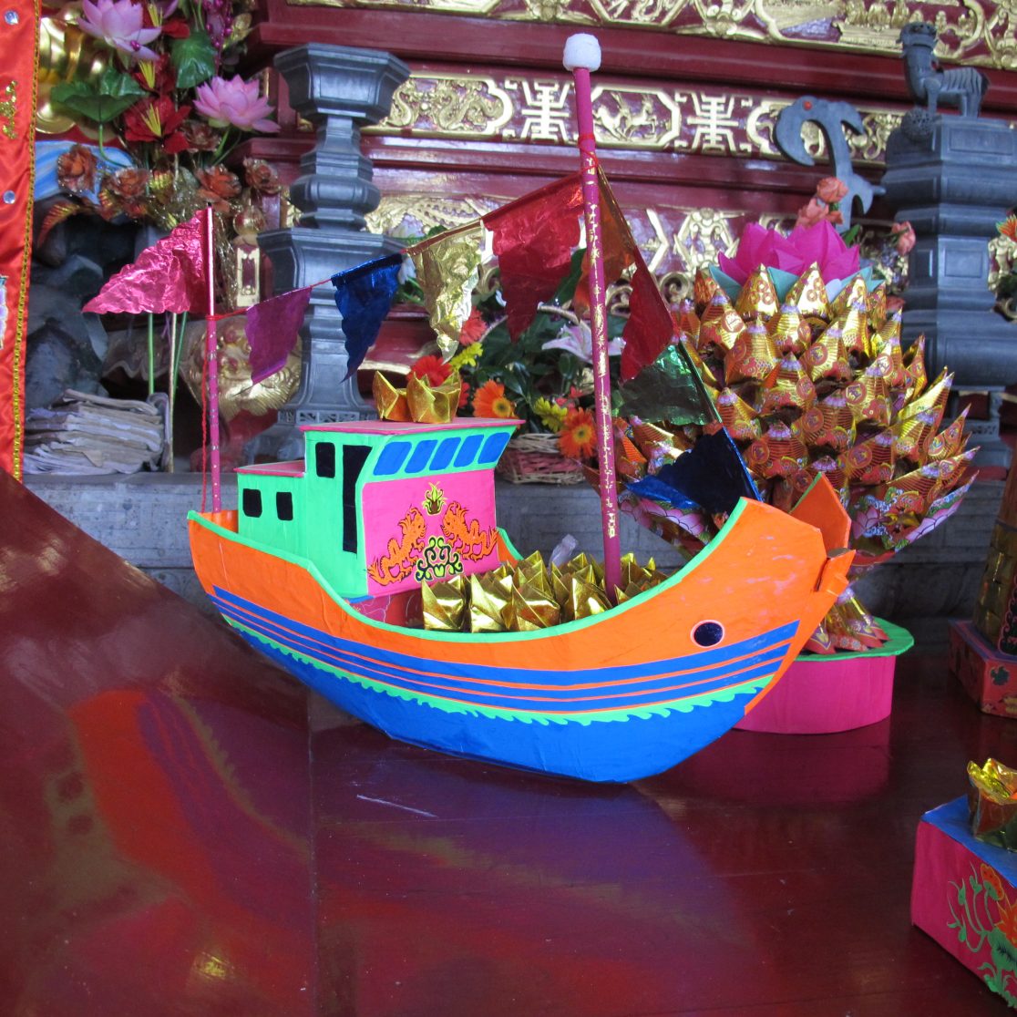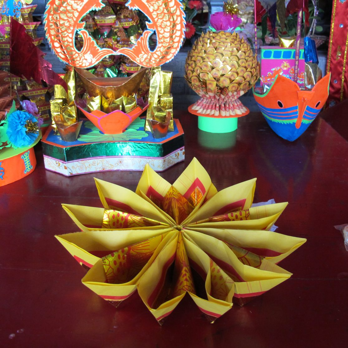 The procession could symbolize the Buddhist notion of impermanence and the illusory world. But the priests also set up a small table, from which they sacrificed rice and rice wine to the sea by quickly tipping it into the sand – and the temple’s little, female Guan Yin, who concealed herself behind a towering male figure, was turned into a Mami Wata-like sea deity with a fish. Together with the lay female Buddhists, Antje and Shuxian sat at her feet and folded a lotus flower made of paper, which they then sacrificed to the sea.