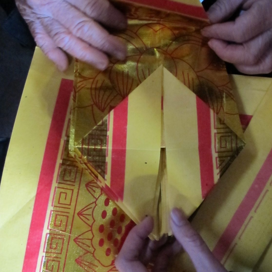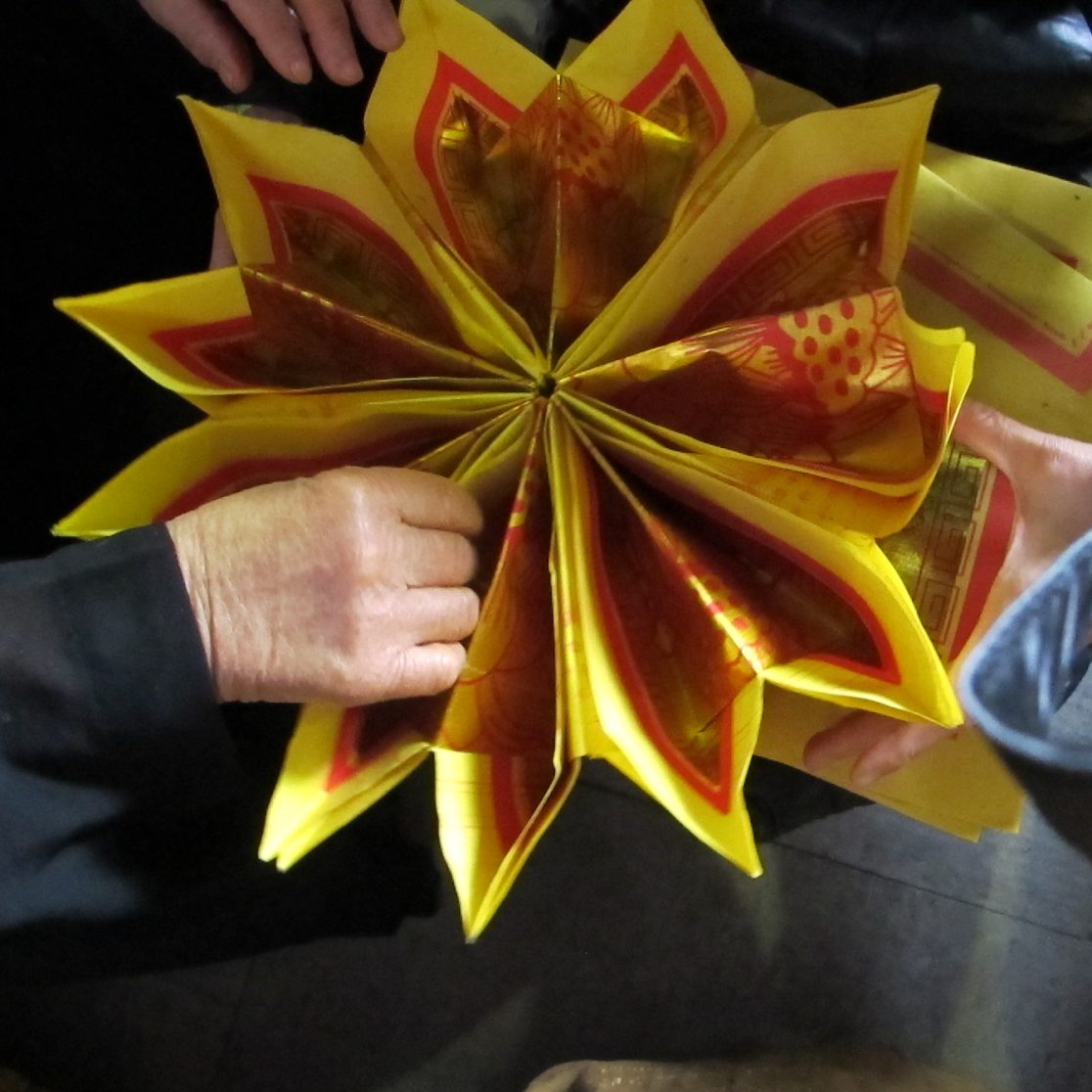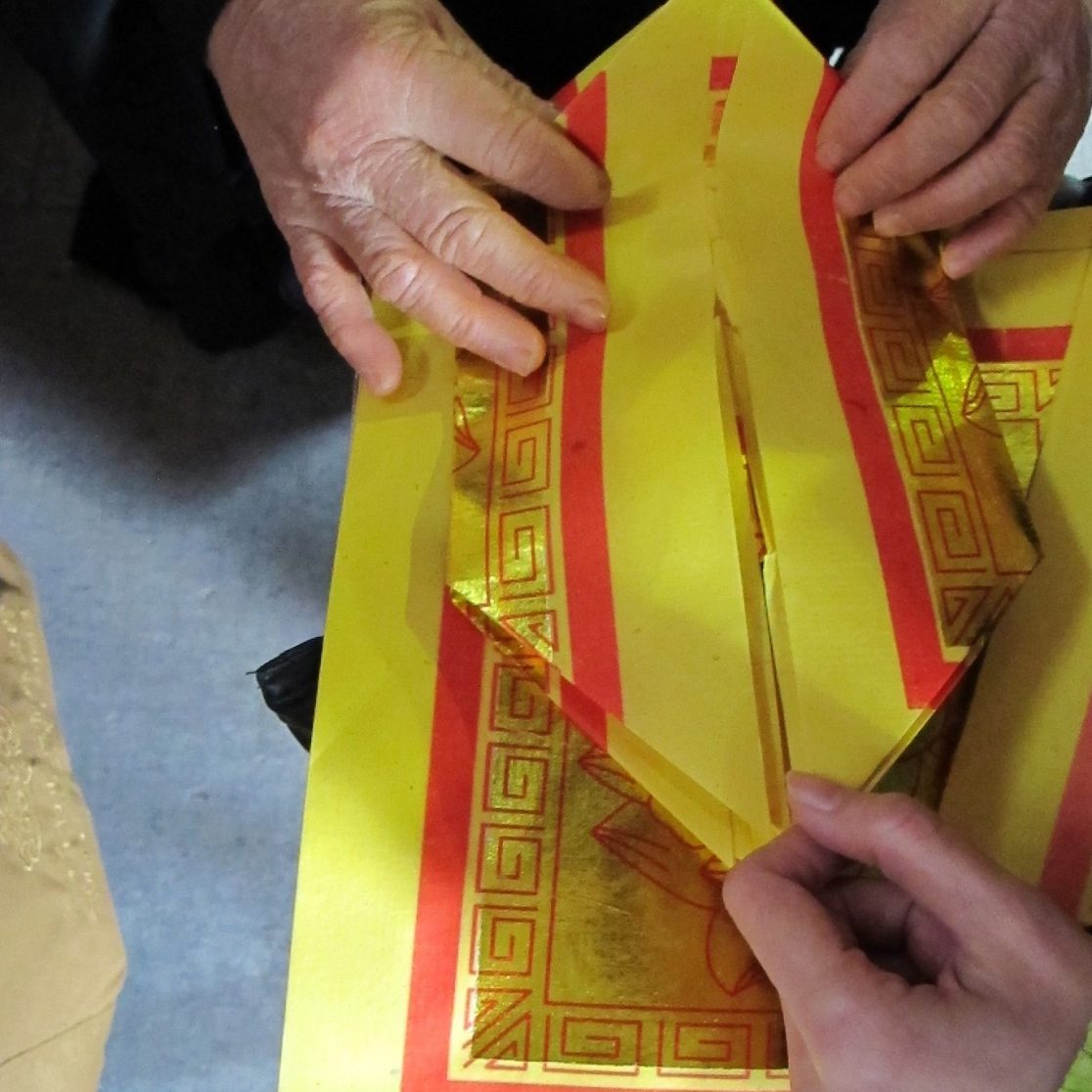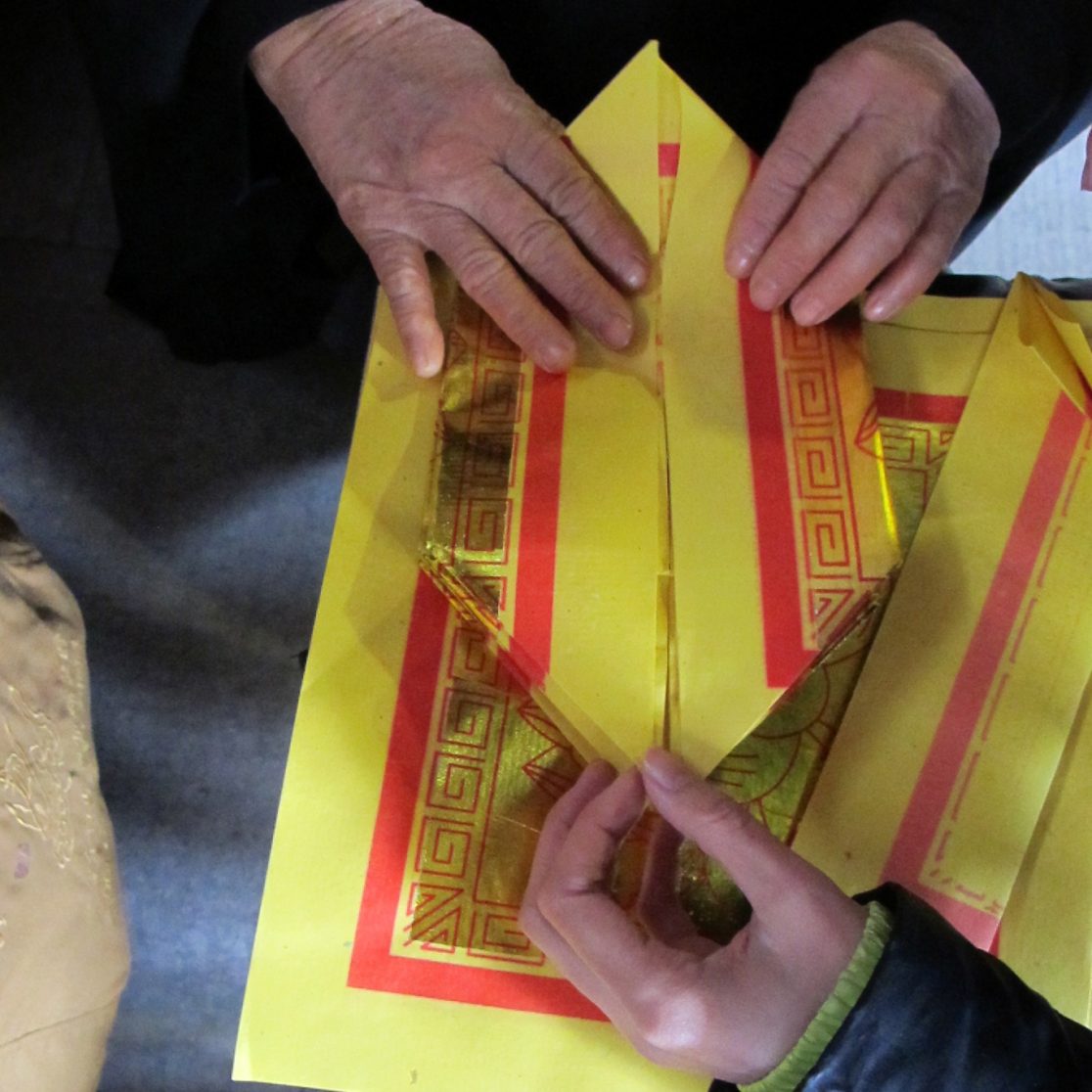 The procession could symbolize the Buddhist notion of impermanence and the illusory world. But the priests also set up a small table, from which they sacrificed rice and rice wine to the sea by quickly tipping it into the sand – and the temple’s little, female Guan Yin, who concealed herself behind a towering male figure, was turned into a Mami Wata-like sea deity with a fish. Together with the lay female Buddhists, Antje and Shuxian sat at her feet and folded a lotus flower made of paper, which they then sacrificed to the sea.