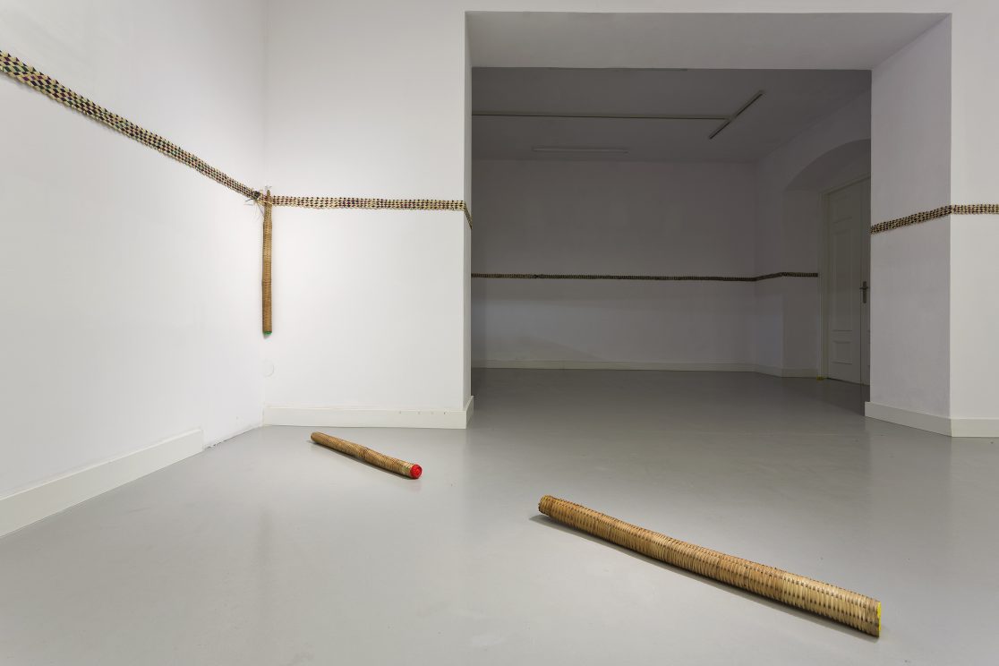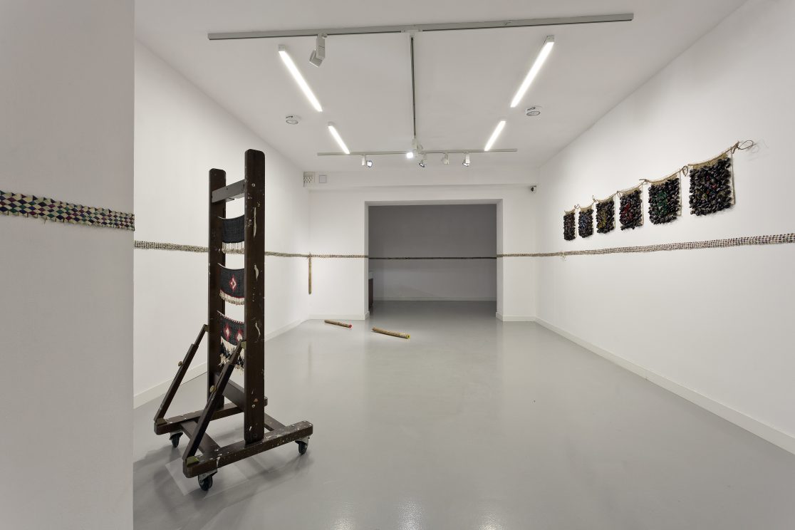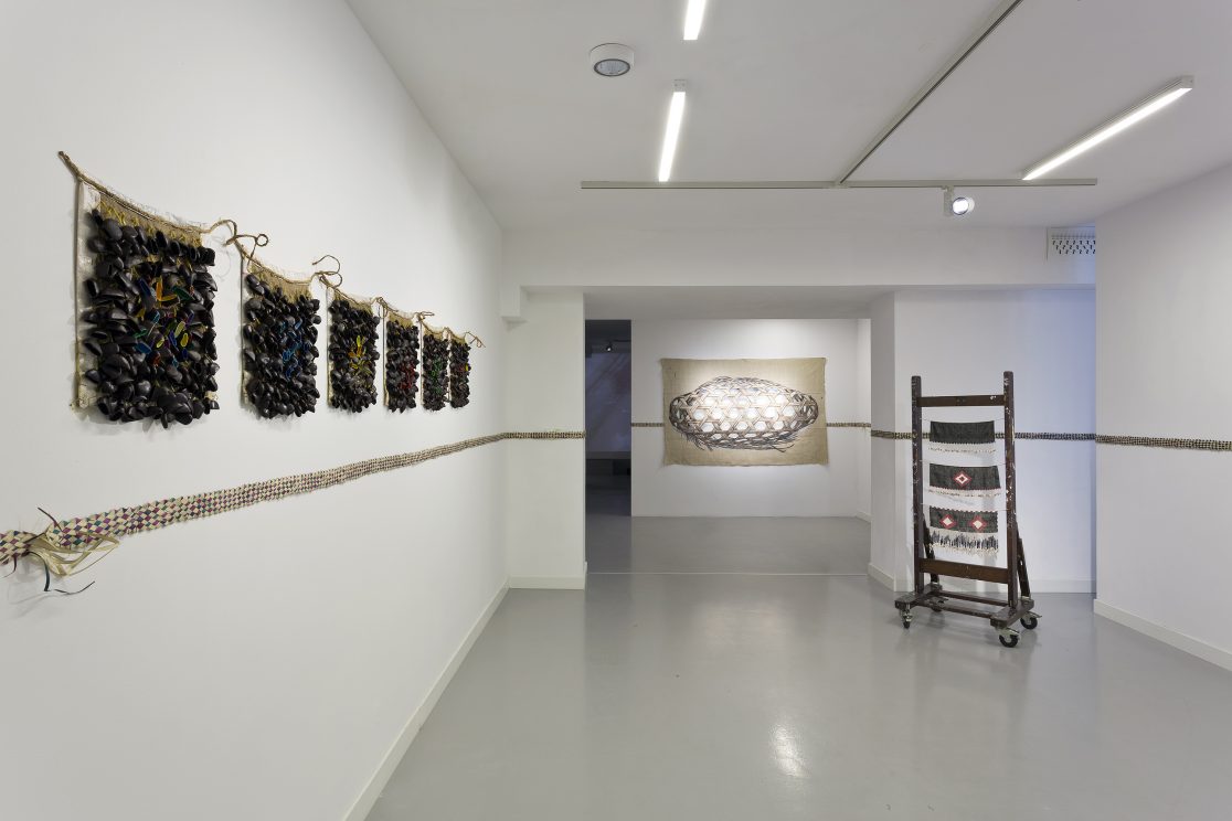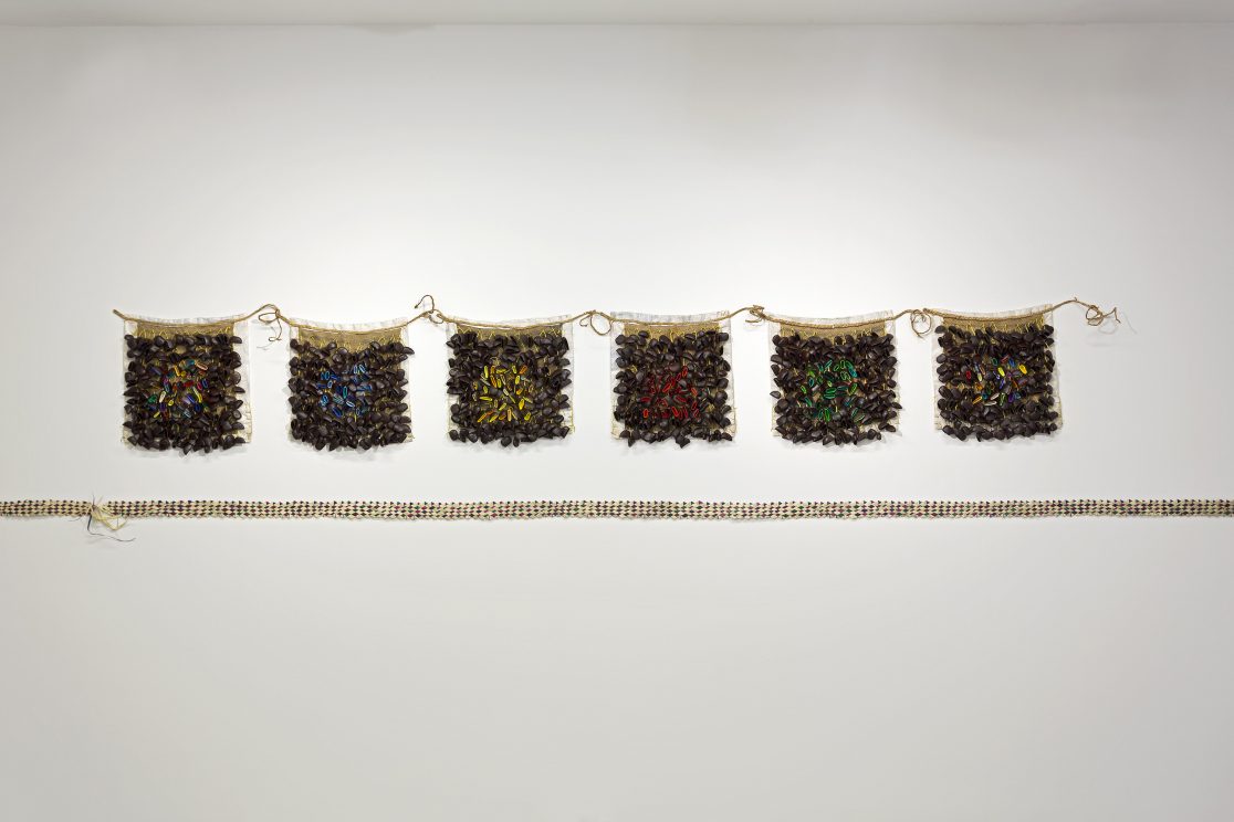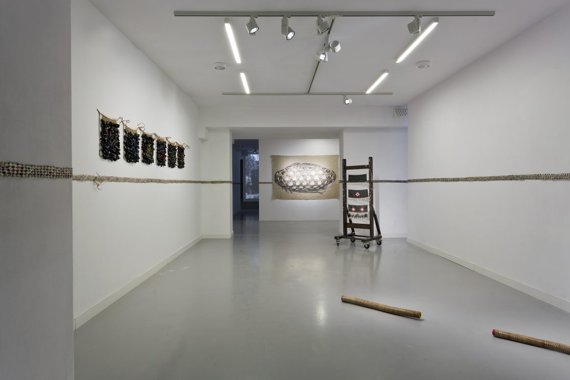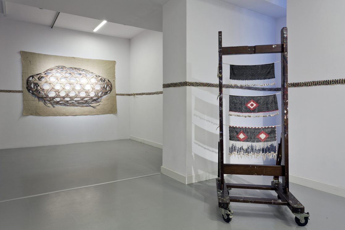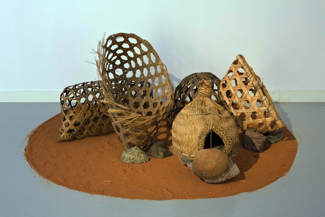 Guesselé-Garai presents adaptations of the “cache-sexes” executed by a Cameroonian craftswoman after his own designs. Other works were commissioned from basket weavers. Patterns in basketwork, due to the gridded relationship between the spoke and the weave, are inherently geometric. Guesselé-Garai’s research in Cameroon, the country of his paternal roots, allowed him to deepen his knowledge of traditional geometric forms and to transform them into a contemporary conceptual language.
