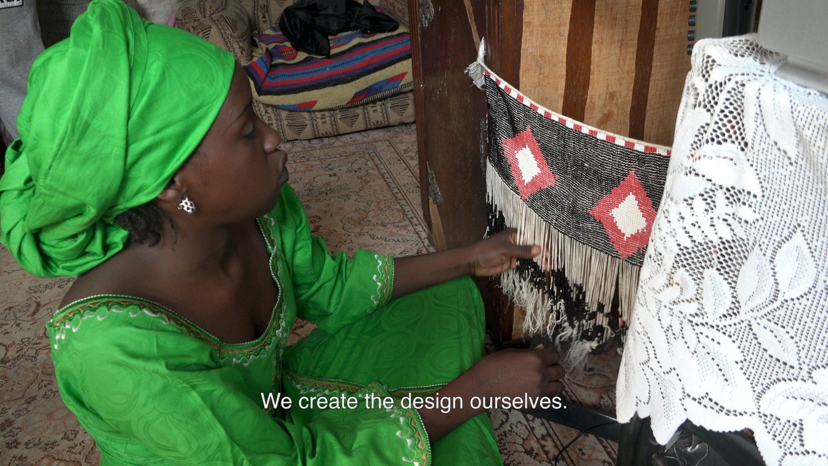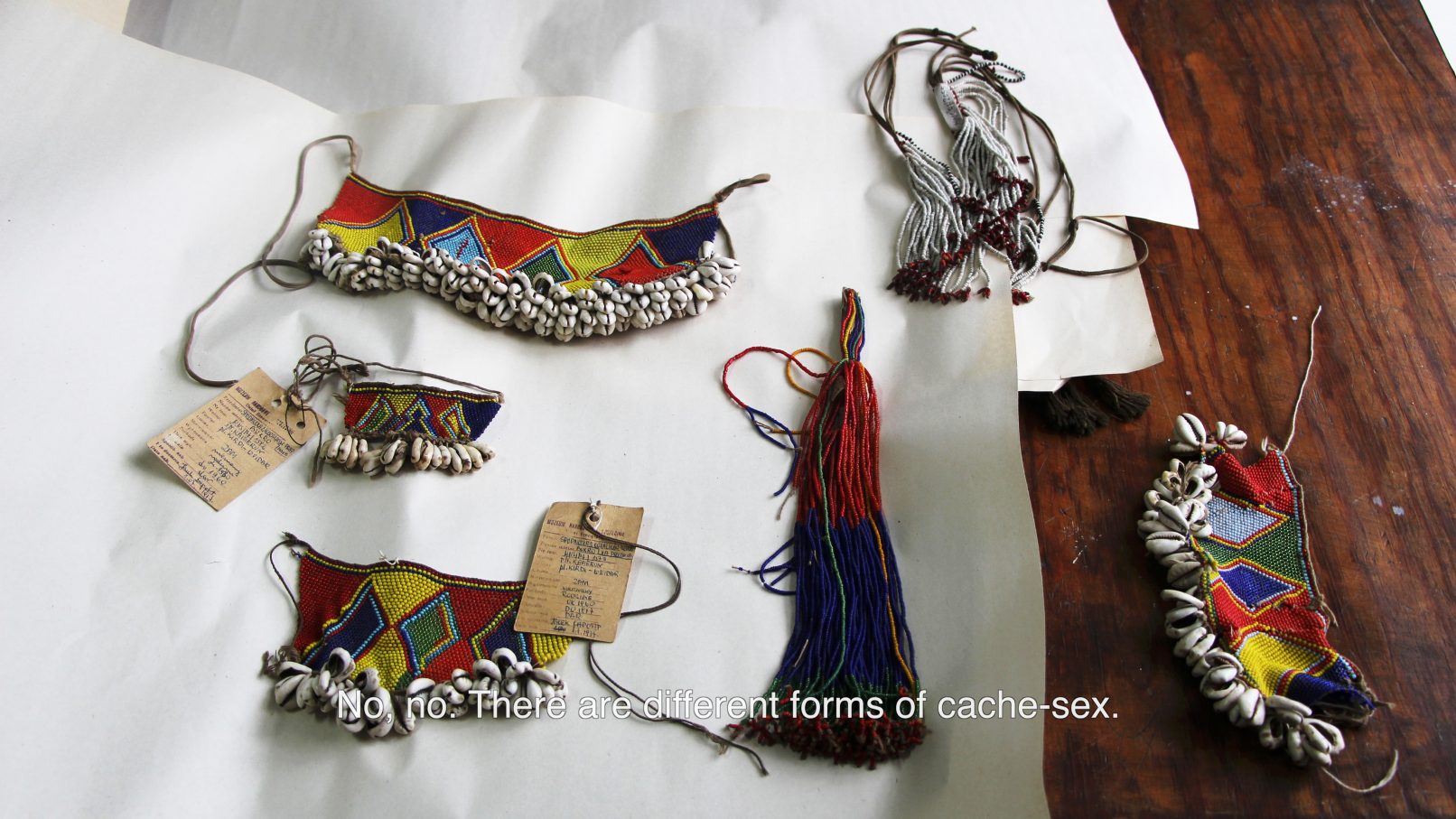 Antje Majewski’s video interview with the modern-day Yaoundé artisans responsible for producing cache-sexe shows that the making of the cache-sexe itself has evolved from the production of a traditional item of clothing to an art-form marketed towards mostly European and American collectors, who purchase the cache-sexe “to hang them on the wall just like paintings”. Traditional designs have given way to a multitude of colors and forms, because the collectors value inventive designs. Meanwhile, the village itself had been obligated to “remake the tradition” – to weave new cache-sexes for the occasions of traditional dance, because all the originals had been sold.