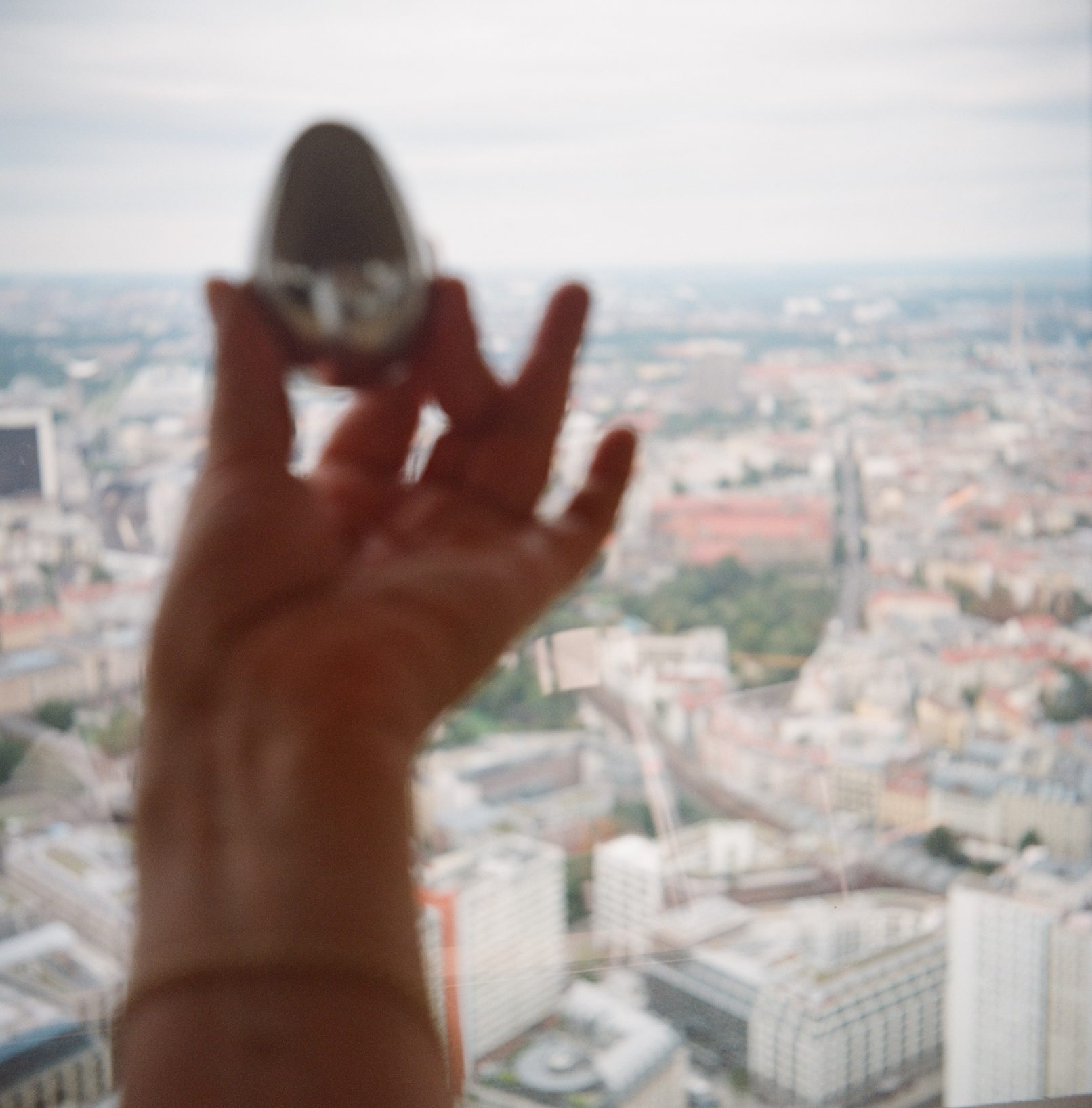 But how should The Egg be shown in the exhibition? I myself would have preferred to “steal” it and bring it to the TV tower with Agnieszka Polska. Freisler answered that the loan agreement had been made with the Kunsthaus Graz, but I was welcome to make a copy of The Egg. We commissioned the same company that had also cast the “Super Eggs”, with a copy that received the number 1. The original was on view in the exhibition, in a bank deposit box in a high security display case, the same one that was used for the Coin de chasteté by Marcel Duchamp. The copy was sent to me in Berlin. Agnieszka Polska and I went to eat at the rotating restaurant in the TV tower (we had pork); and we drove around with Das Ei (Kopie Nr. 1) a few times so that the city could reflect in it.[4]