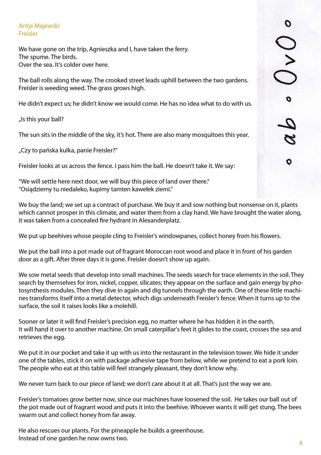 On the flight home, Agnieszka and I realized that we both definitely wanted to visit Freisler. That summer I ran–together with Juliane Solmsdorf, Dirk Peuker and Magdalena Magiera–a large, empty art space at the base of the television tower in Berlin. At Splace, we invited artist friends to arrange a total of twelve exhibitions.[3] I invited Agnieszka to do a Freisler exhibition with me. We tried to get in touch with him, but he did not reply.