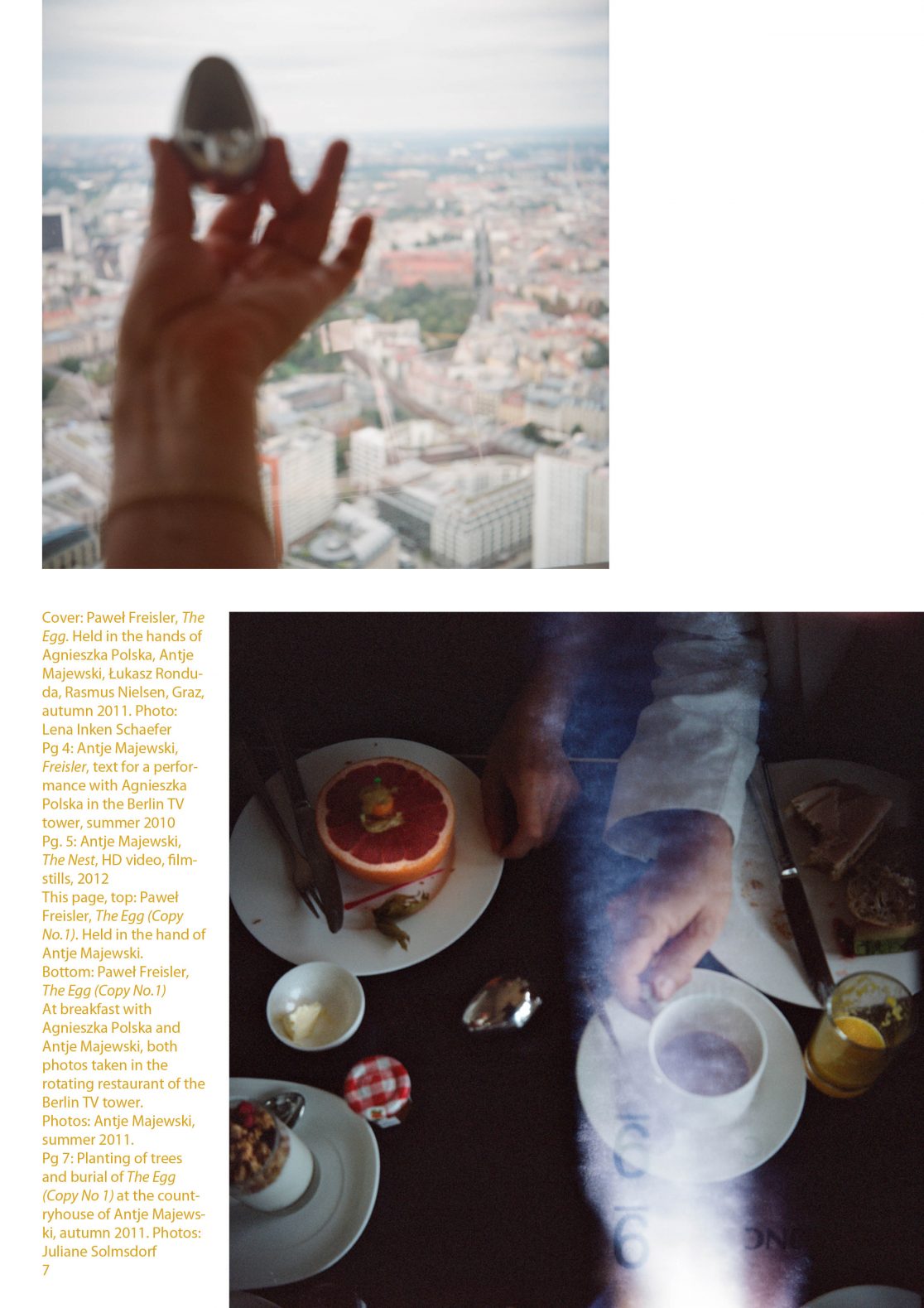 Finally, I wrote the text for a performance in which we both travel to Sweden and steal his egg by sending little machines into his garden, where it is buried. The machines burrow into the ground and bring us The Egg, which we then take to Berlin and glue underneath one of the tables in the rotating restaurant at the top of the television tower.