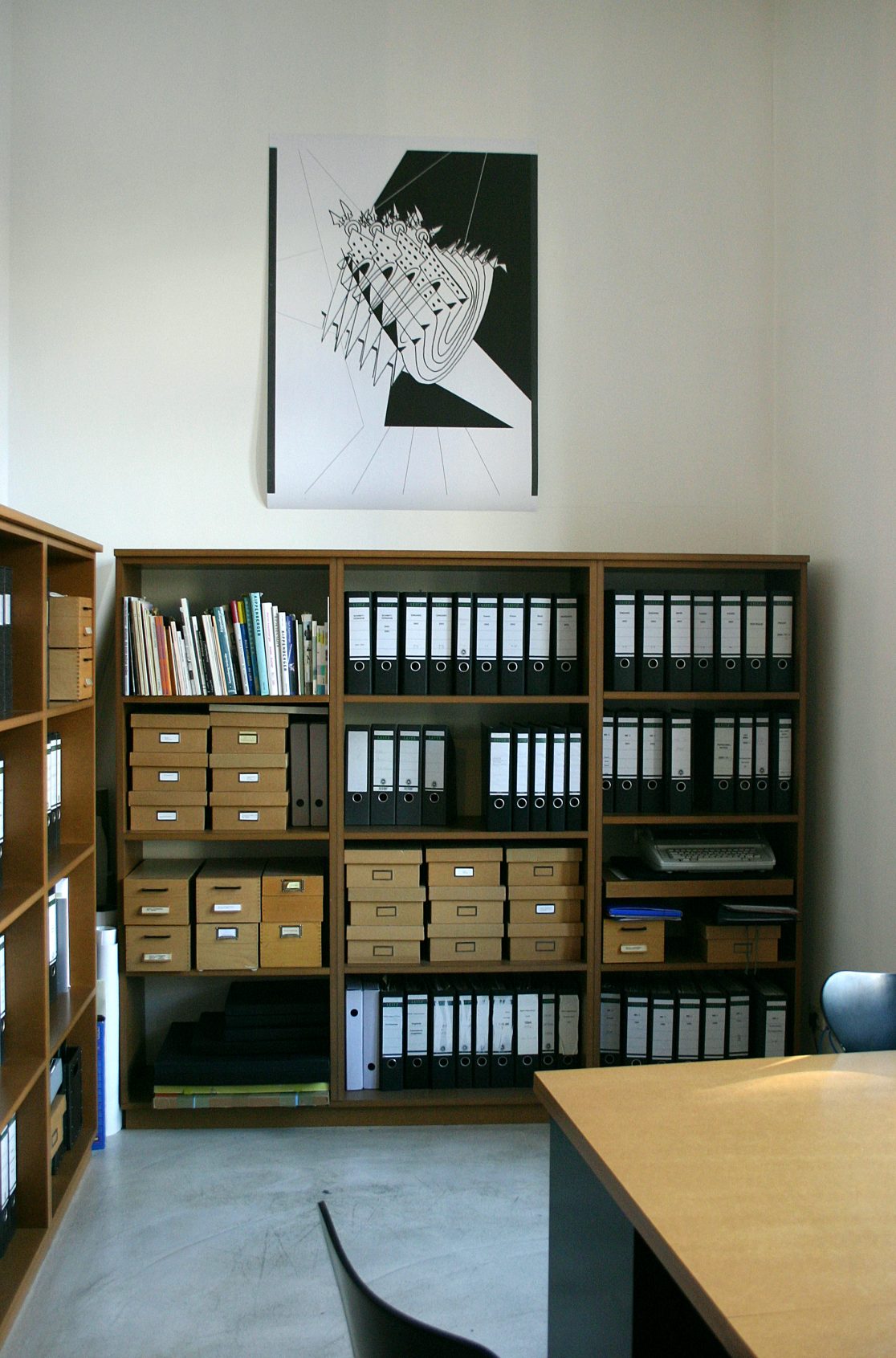 The ceiling painting executed in situ by Monika Sosnowska shows a geometrical pattern inspired by public decors in Poland. Those decors often appear –side-by-side with propagandistic art works as arbitrary adaptations of a modernist form vocabulary.