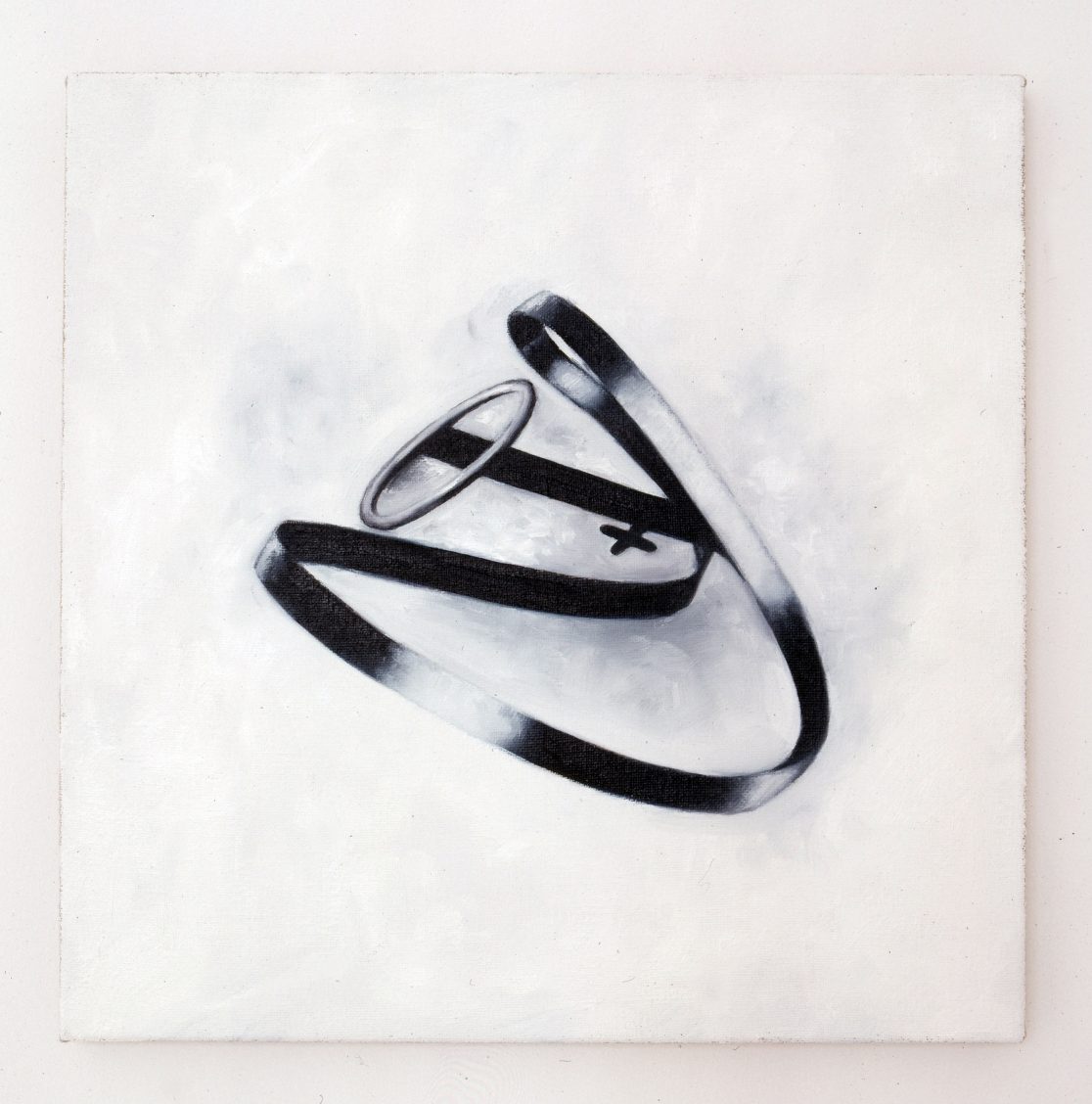 The painting After Katarzyna Kobro, Suspended Construction (2), (1921-22) by Antje Majewski ‘depicts’ a sculpture by Polish constructivist Katarzyna Kobro. Like many of Kobro’s works, the fate of the original artwork from the classical modernist period are unknown, as it was likely to have been destroyed or lost over the years. What remains is a rough drawing of the piece and a photographic reproduction, but the exact dimensions are unknown. Yet the strangely contemporary-looking sculpture— this free-hanging piece that we casually referred to as “diadem”— became a crucial point of departure for this project.