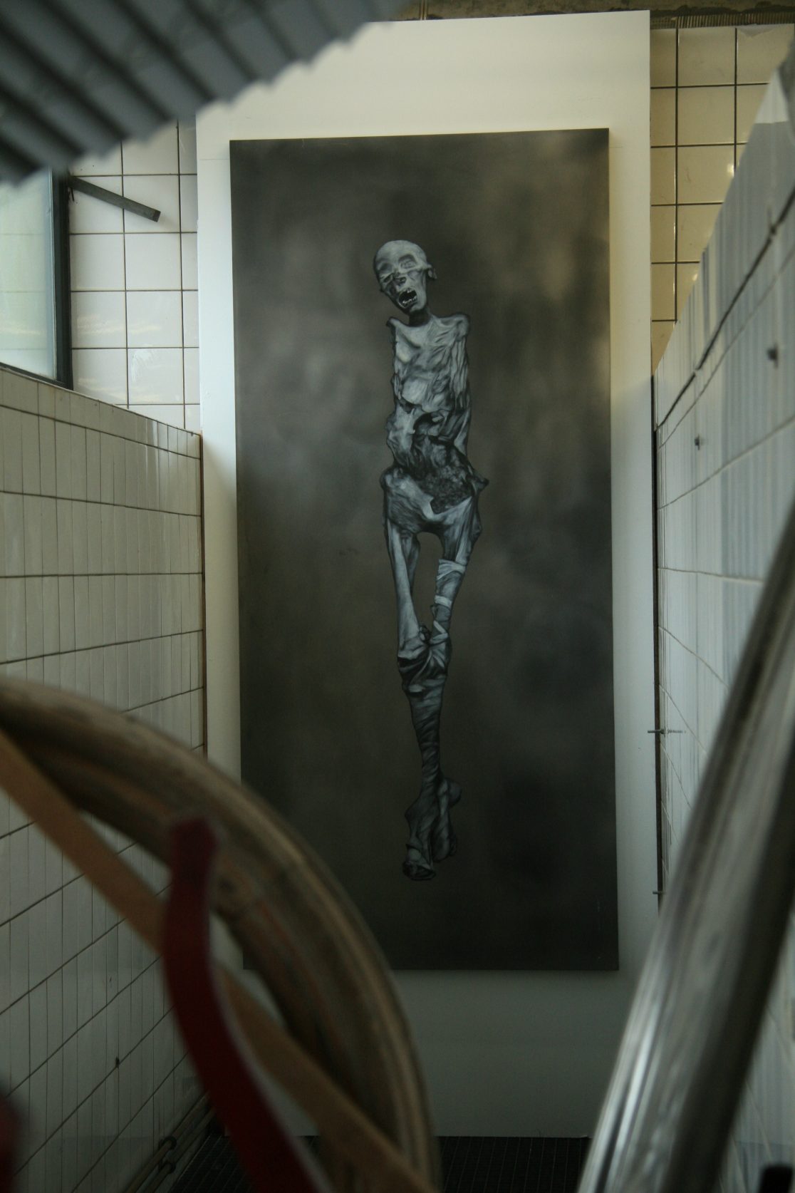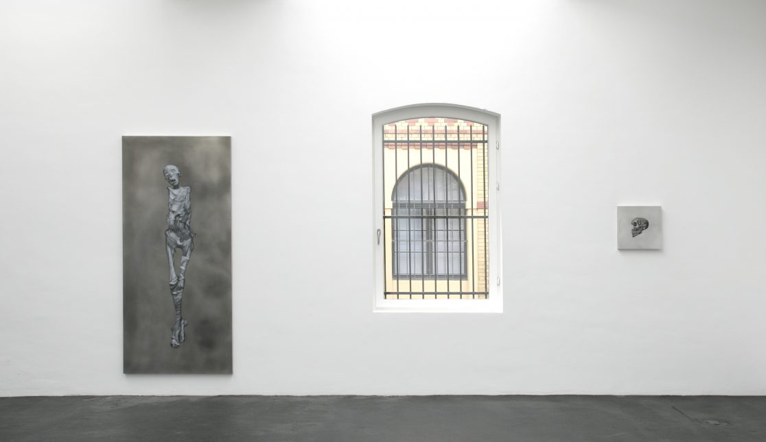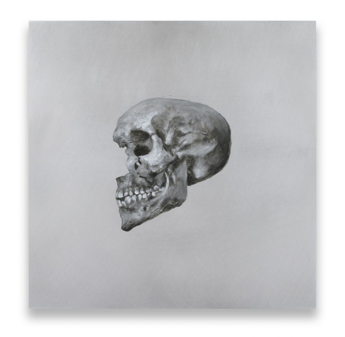 The aluminum “canvases” were chosen in the hope that they would survive better than canvas. The colors that were used for the paintings are lead white, carbon black, and a fake “mummy brown.” “Mumia egyptica vera” was a pigment made of ground mummy limbs that remained very popular with painters until the nineteenth century, partly because it contained natural asphalt (bitumen), which made this brown very fluid and paintable. Other ingredients, such as linen oil or dammar, were already in use by the Egyptians for both the conservation of bodies as well as paintings, and we still paint with them today. Grafton Elliot Smith, who was the founder of “Hyperdiffusionism,” might have been delighted by the idea that not only did painters’ recipes diffuse from ancient Egypt into modern Germany, but also the Realism first invented by Akhenaton (or his wife Nefertiti), whose (probable) skull can be seen on this page.