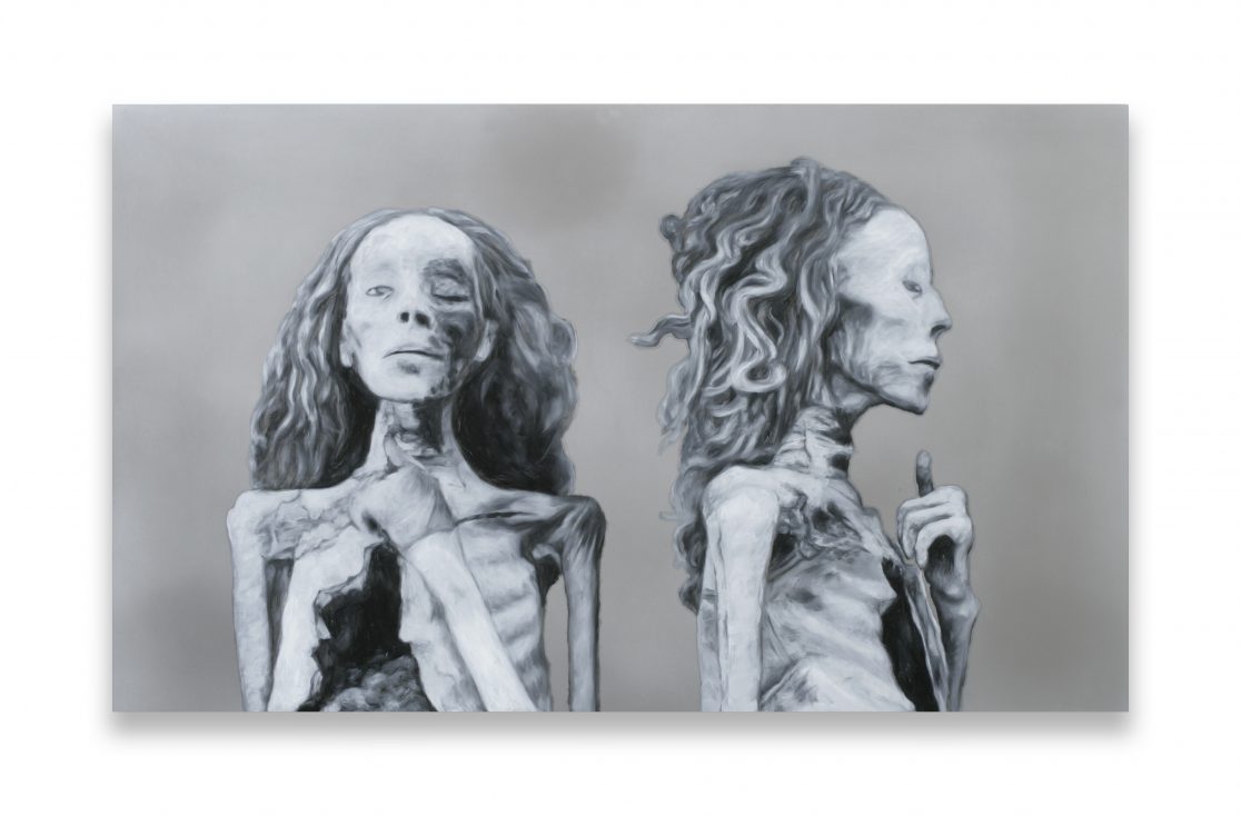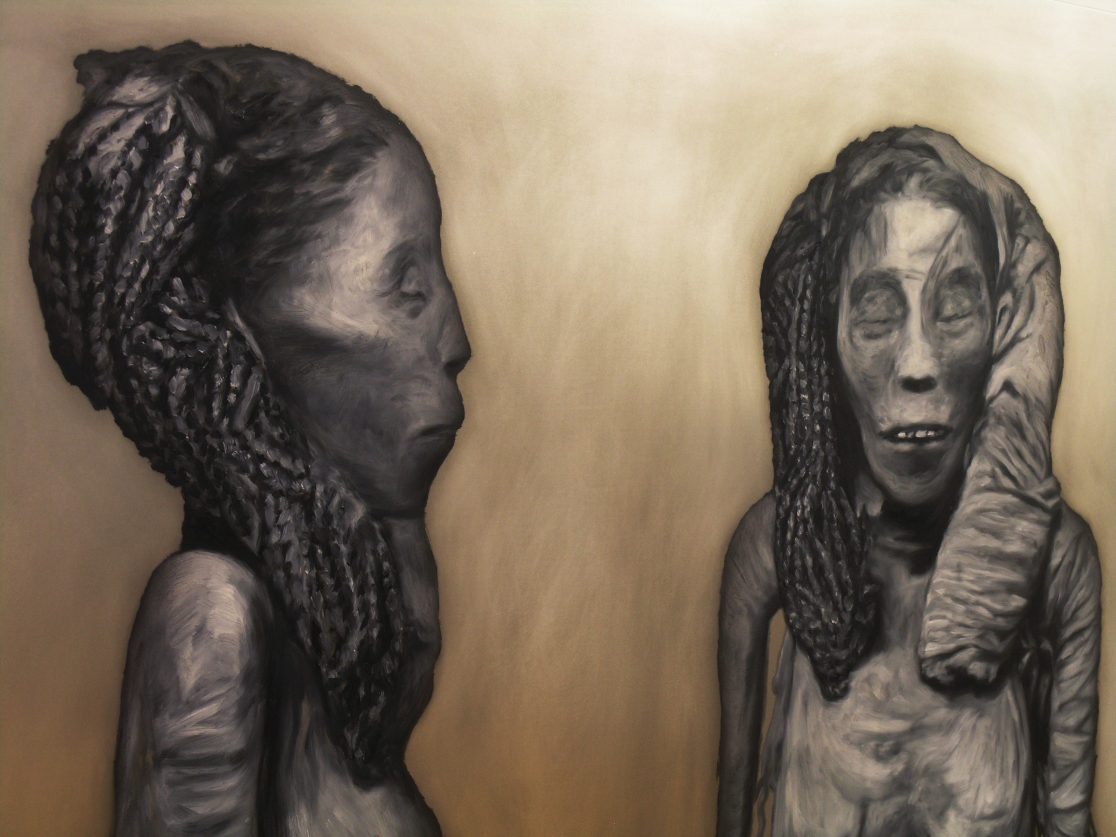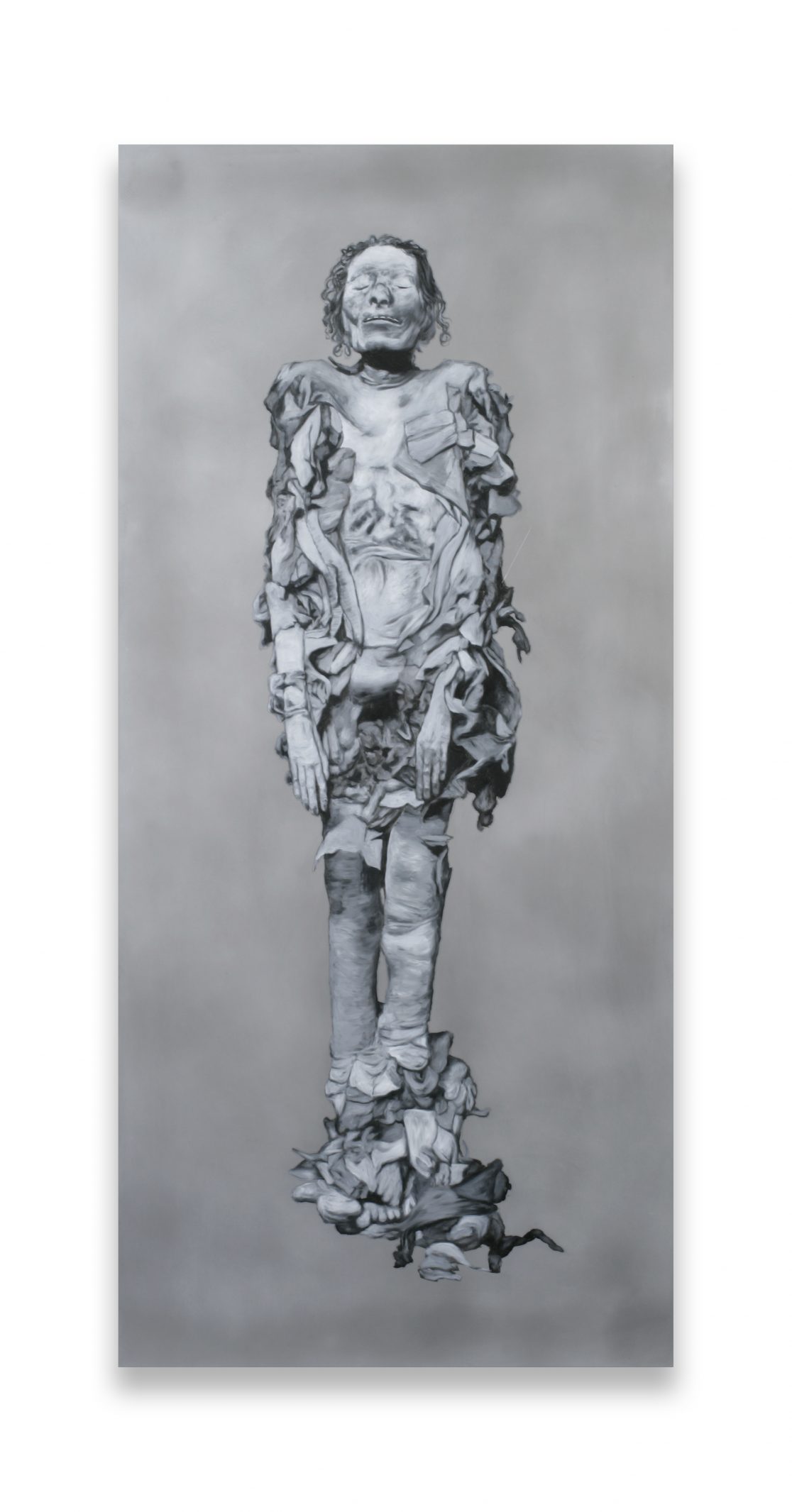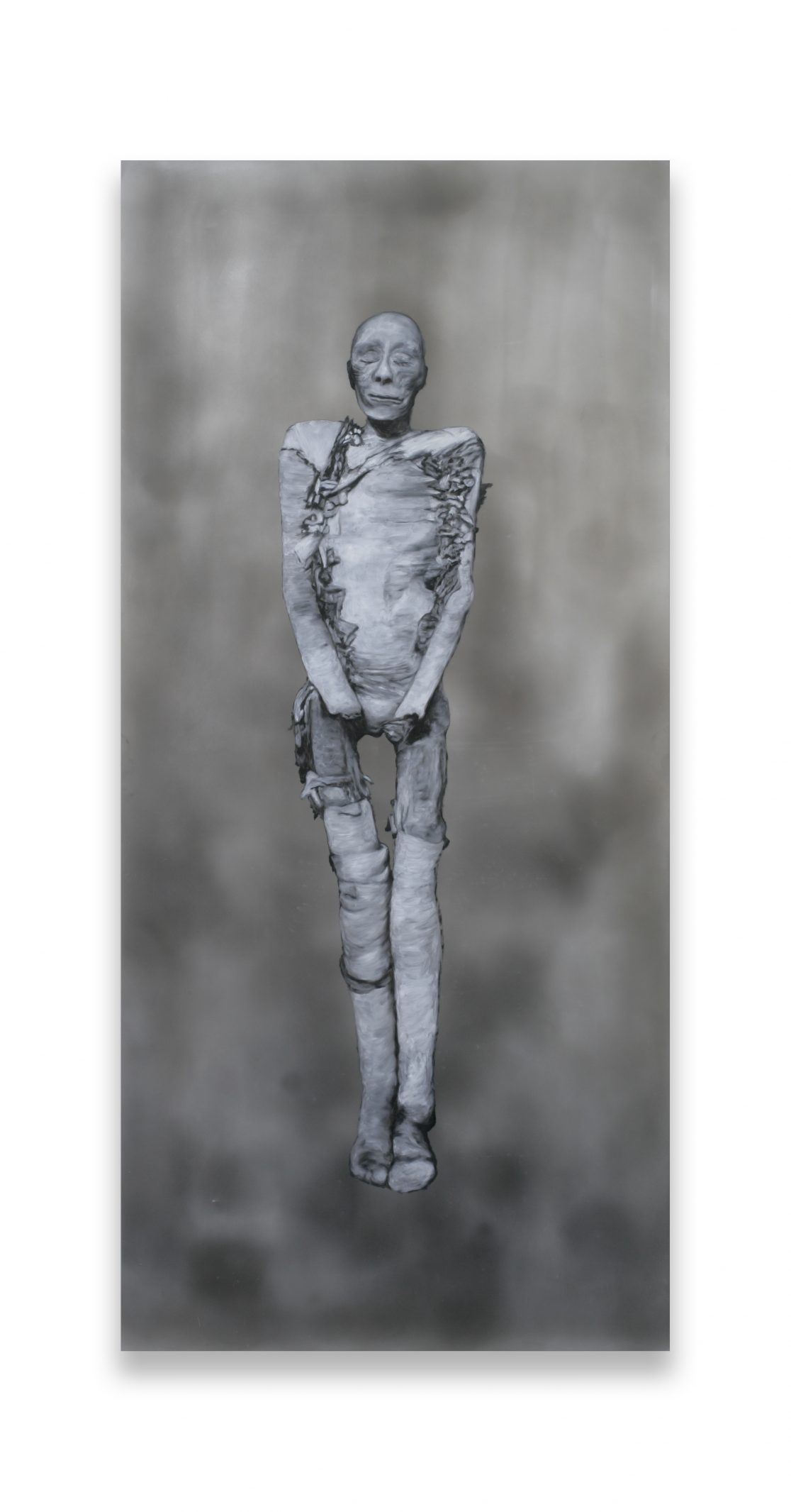 This group of paintings attempts to “remummify” the stunning black-and-white photographs, mostly taken by the Egyptologist Emile Brugsch, in Grafton Elliot Smith’s Catalogue Général des Antiquités Ég yptiennes du Musée du Caire (1912). The Egyptians had wanted to conserve themselves for eternity; by bringing them to the light of day again, the Egyptologists of the late nineteenth century set the same wheel of destruction in motion again that the embalmers had tried to halt.
