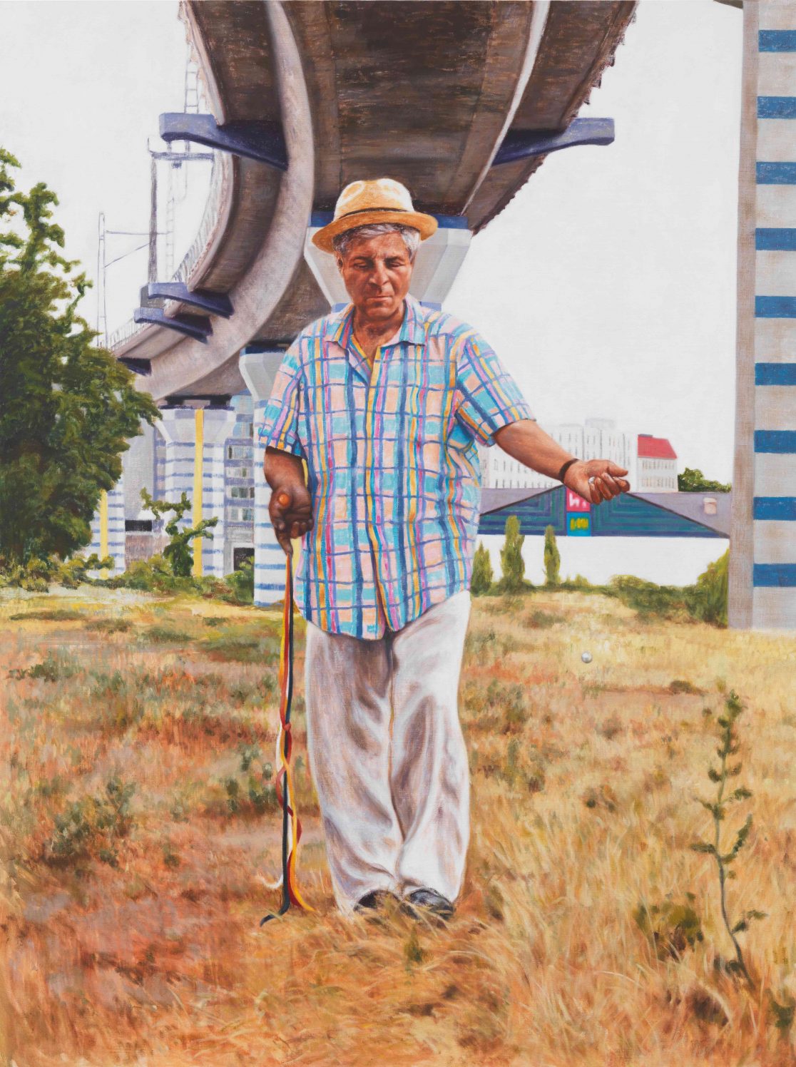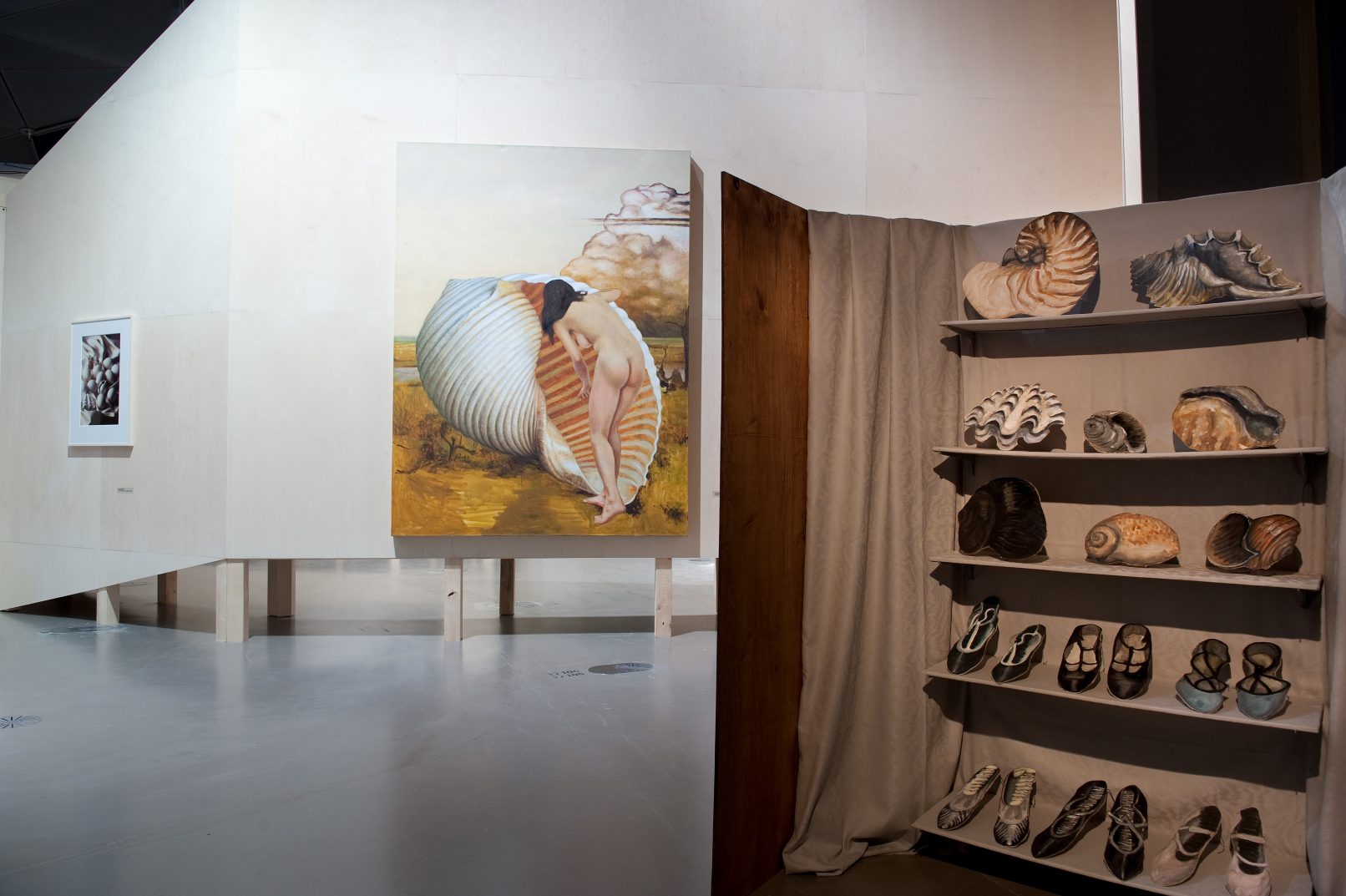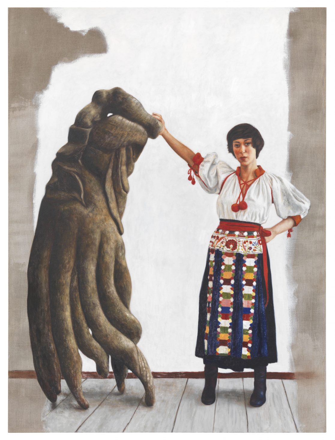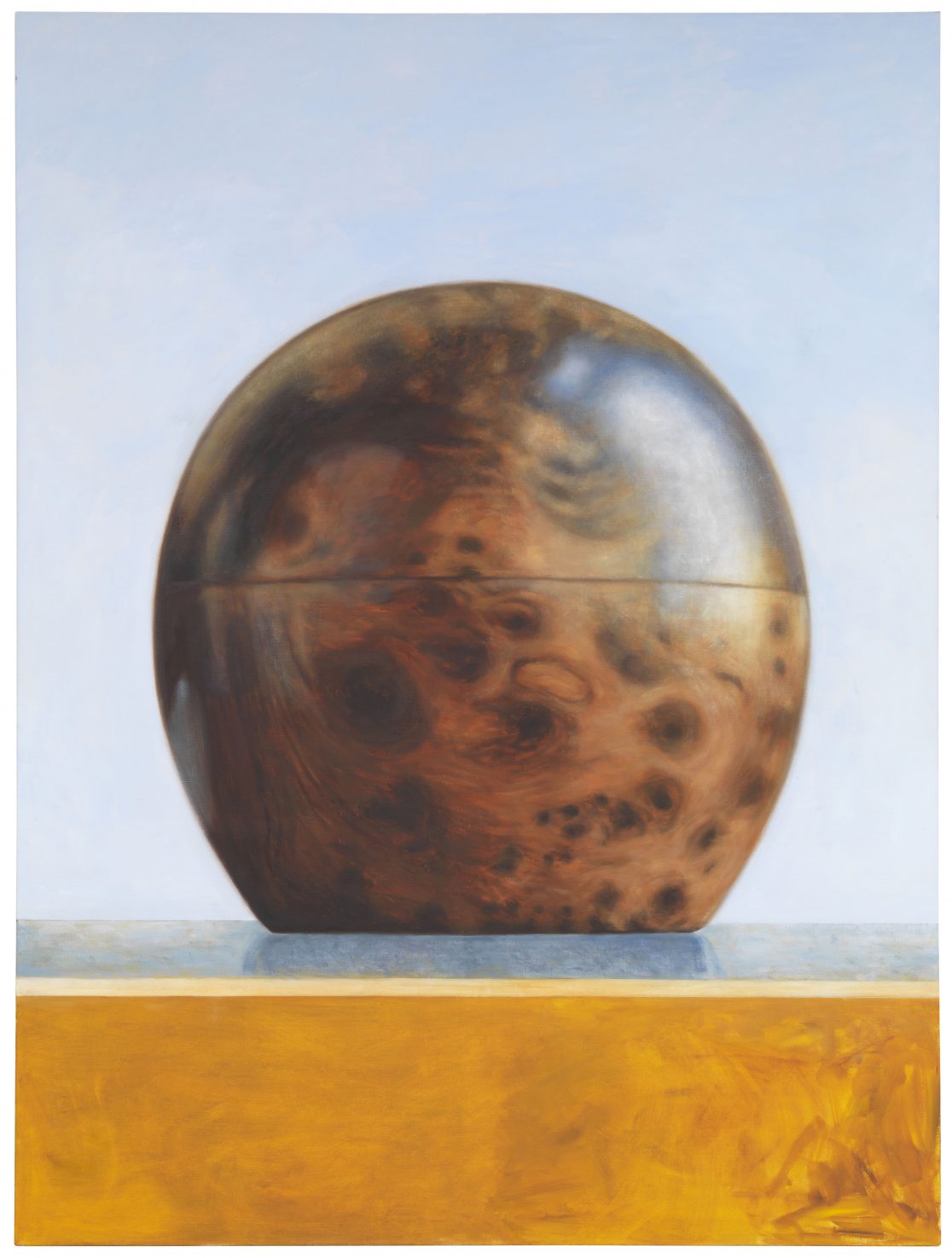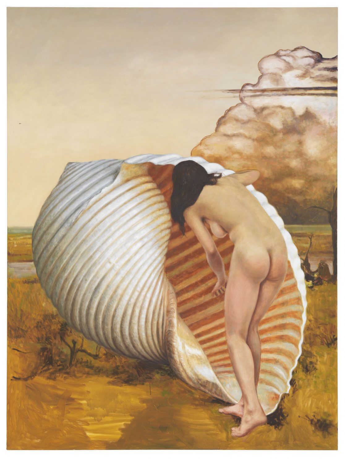 Each of these objects emerges again in a painting: a nude woman peers inside a large shell in an ice-age landscape; the Gardener of mechanical objects sows metal seeds and waters them with the index finger of his teapot-hand in ribbons of color; a woman in Romanian dress presents a large, biomorphic sculpture – a Buddha’s Hand citron, a type of citrus fruit; a wooden pot with detailed grain sits in an undefined space – though the pot in the image remains shut, the title refers to its contents, a black ball or two glass eyes. A young woman carries the weight of a huge meteorite on her belly, while another young woman is entering a gigantic shell in a primordial landscape.