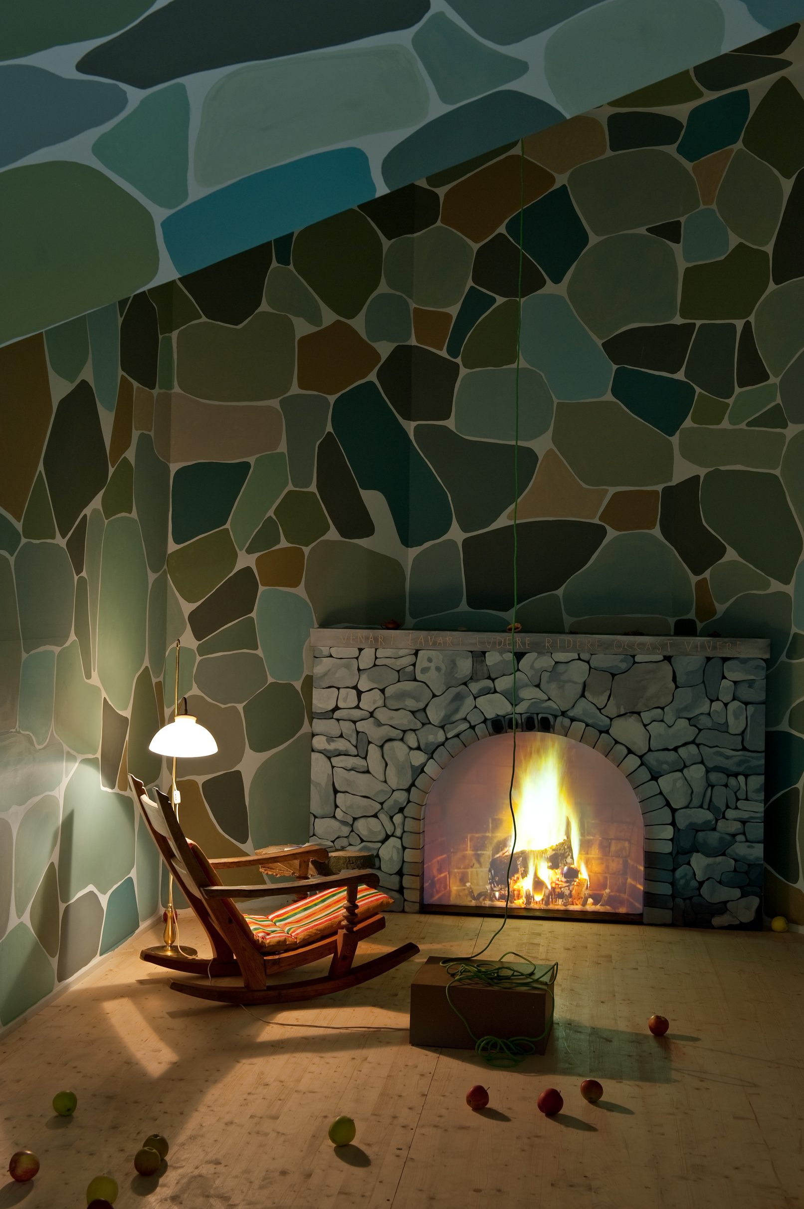 The Hedge Apple (also called the Osage Orange ) appears in two different installations. While Entity is an installation around a science-fiction story, in which the Hedgeapple appears to be a monadic object replacing all other objects, the other installation carries us back into the past when we sit down in the rocking chair next to the fireplace in VENARI LAVARI LUDERE RIDERE OCCAST VIVERE, a reconstruction of the self-build house of the writer John Joseph Mathews, who was observing the change of the seasons of his native ecosystem of Osage County. The fireplace room in the gallery becomes a kind of inhabitable painting, where one might have the chance to contemplate the oversized, abstracted Osage orange – or eat some apples. Colored wires connect the “space of images” with the “fireplace room” and deliver electricity for the latter’s electric fire and lighting.